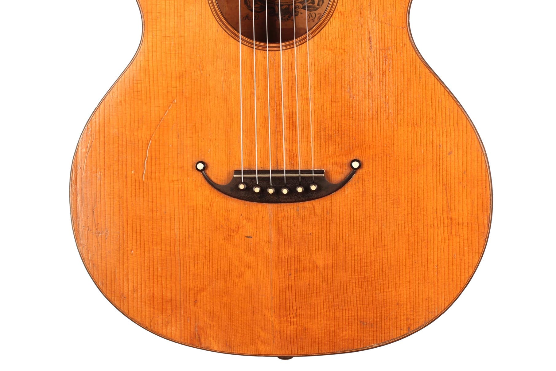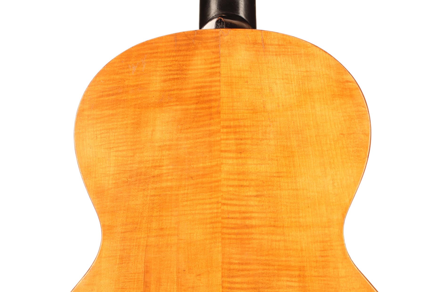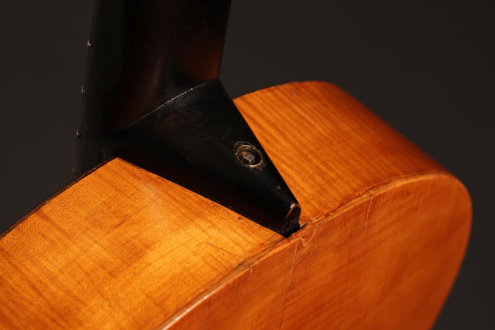 This guitar was built in 1921, it is a rare romantic model with a Patented top (D.R.P. Nr.339867). This guitar is in great condition. It is wearing its original Landstorfer tuning machines, has immaculate back and sides and a few well repaired cracks on the top. This guitar sounds marvellously good and has a crystal-clear tone. The transparency and clearness in the harmonies are striking. This guitar has an adjustable neck and is perfectly setup. It is very easy to play, especially for the left hand, what is a great quality for an instrument of this age.