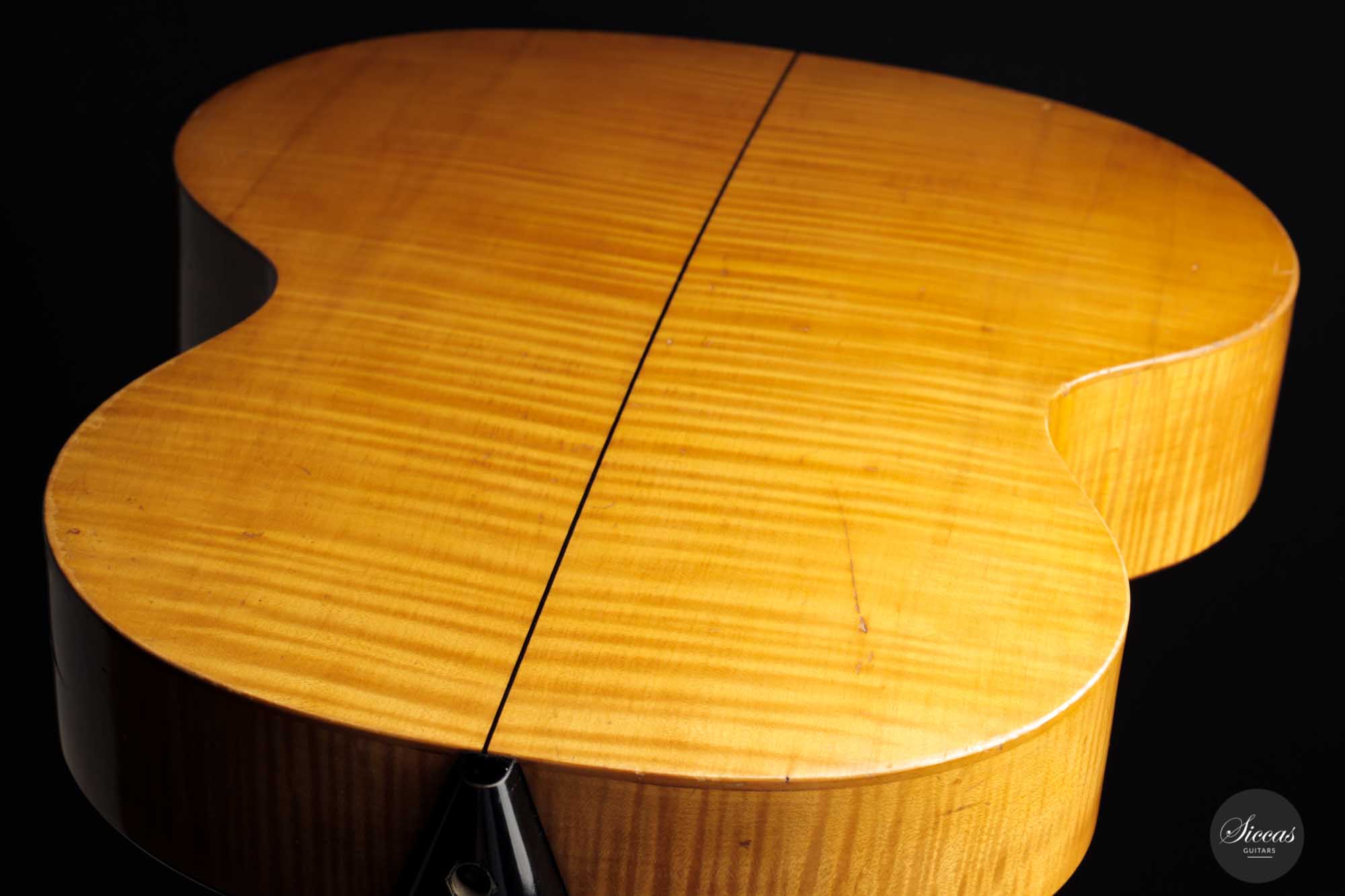 This guitar is in fantastic condition for its age. It has a lovely patina and wonderful honey color. Playing marks and superficial scratches are noticeable on the overall instrument. Still, it only has one tiny crack on the side and a repair under the fingerboard, which is unnoticeable and structurally benign. The heel has two lines where the varnish sank in the joint of the different heel pieces, yet our expert detected no structural issue there. This instrument is fully original, including the flawlessly functional original Landstorfer tuners.