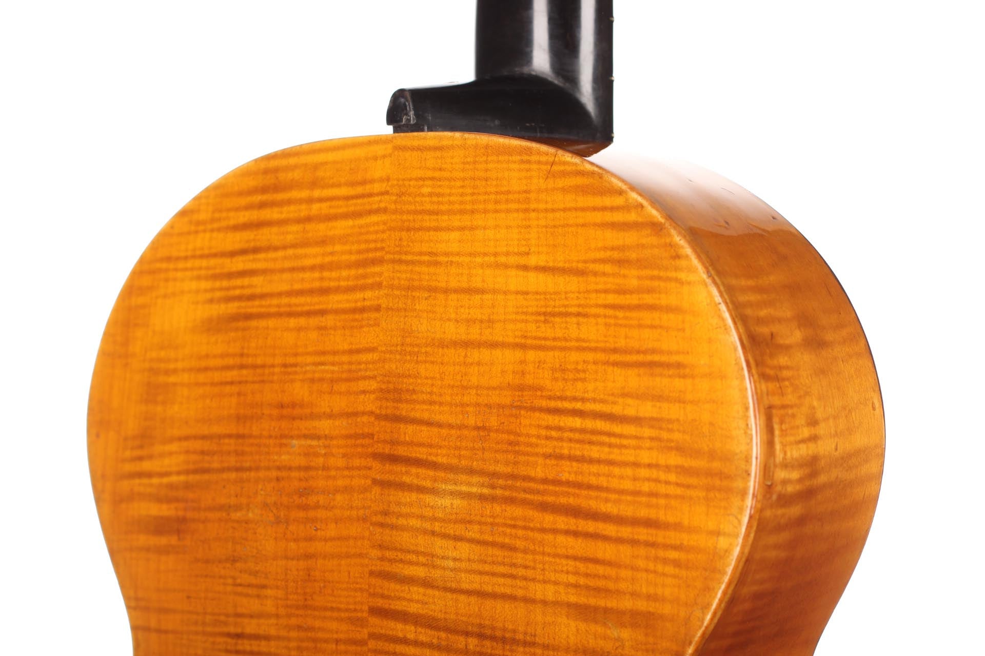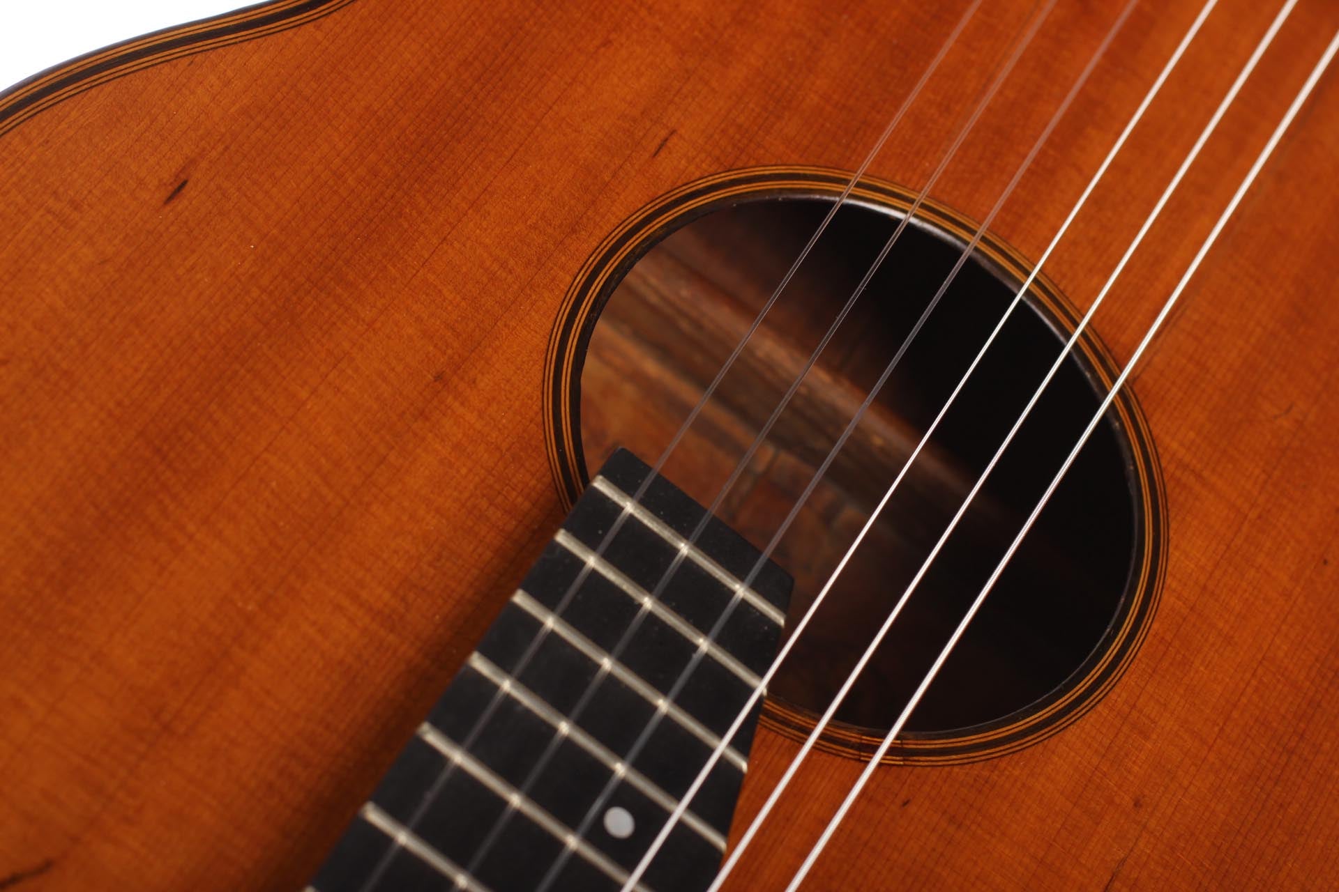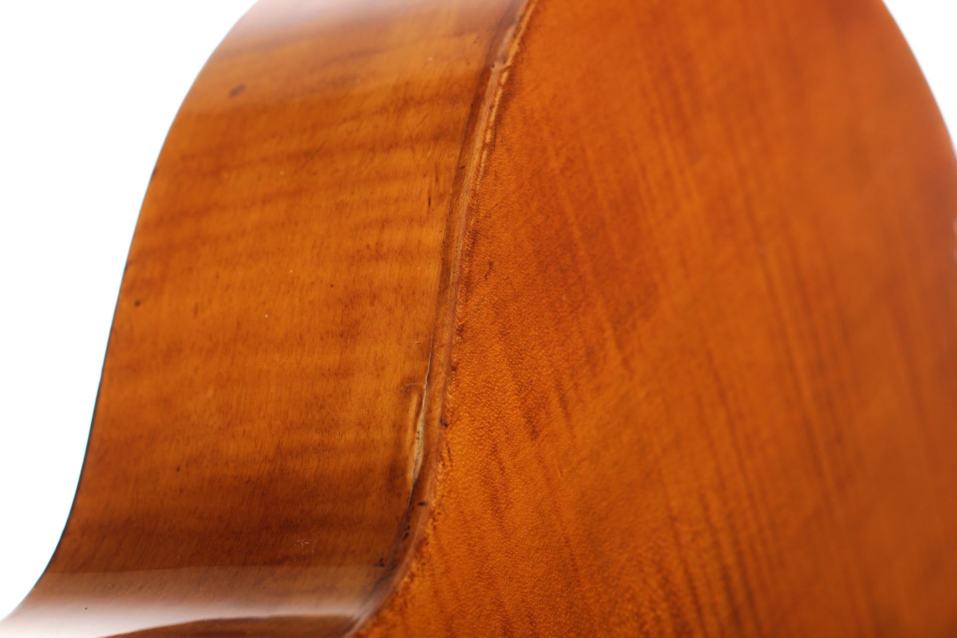 Die Wiener Gitarren von Hermann Hauser ® I zeichnen sich als besonders leicht spielbare Instrumente aus. Auch haben Sie einen kräftigen und lang anhaltenden Klang. Die zweiteilige Decke besteht aus Fichte und hat dunkle und helle Randverzierungen, ebenso wie das Schallloch. Der Boden ist zweiteilig und besteht wie auch die Zargen aus stark geflammtem Ahorn. Der Kopf ist nach deutscher Art mit dem Hals verbunden. Der Hals ist mit dem Korpus verschraubt und individuell einstellbar. Das Griffbrett besitzt einen Nullbund und reicht schwebend bis über das Schallloch. Insgesamt befindet sich diese Gitarre in einem guten Zustand. Sie hat auf der Decke und der Zarge reparierte Risse.