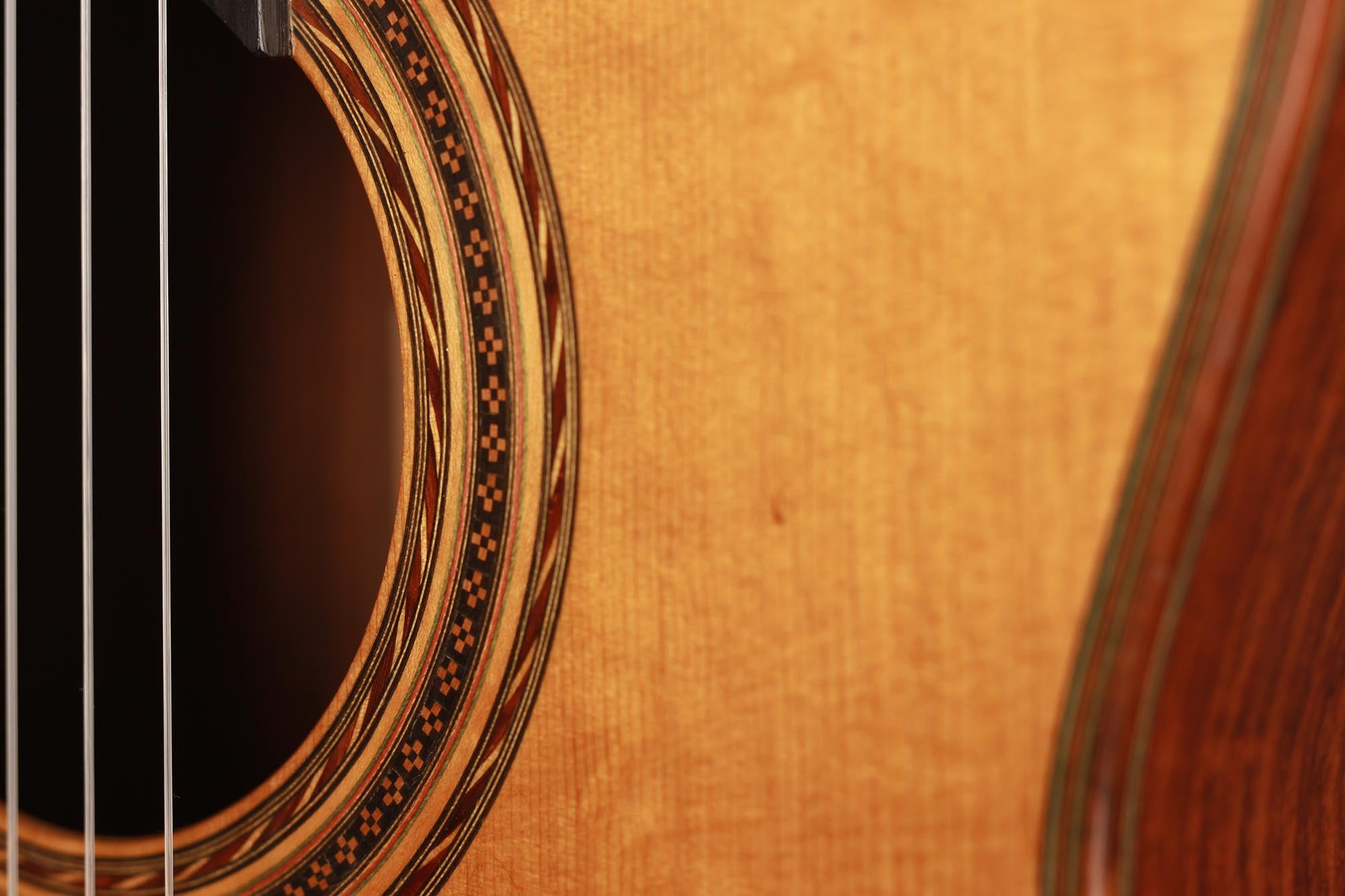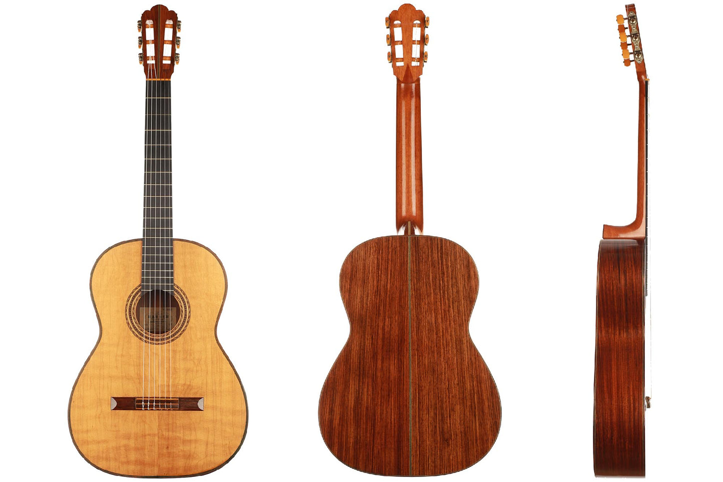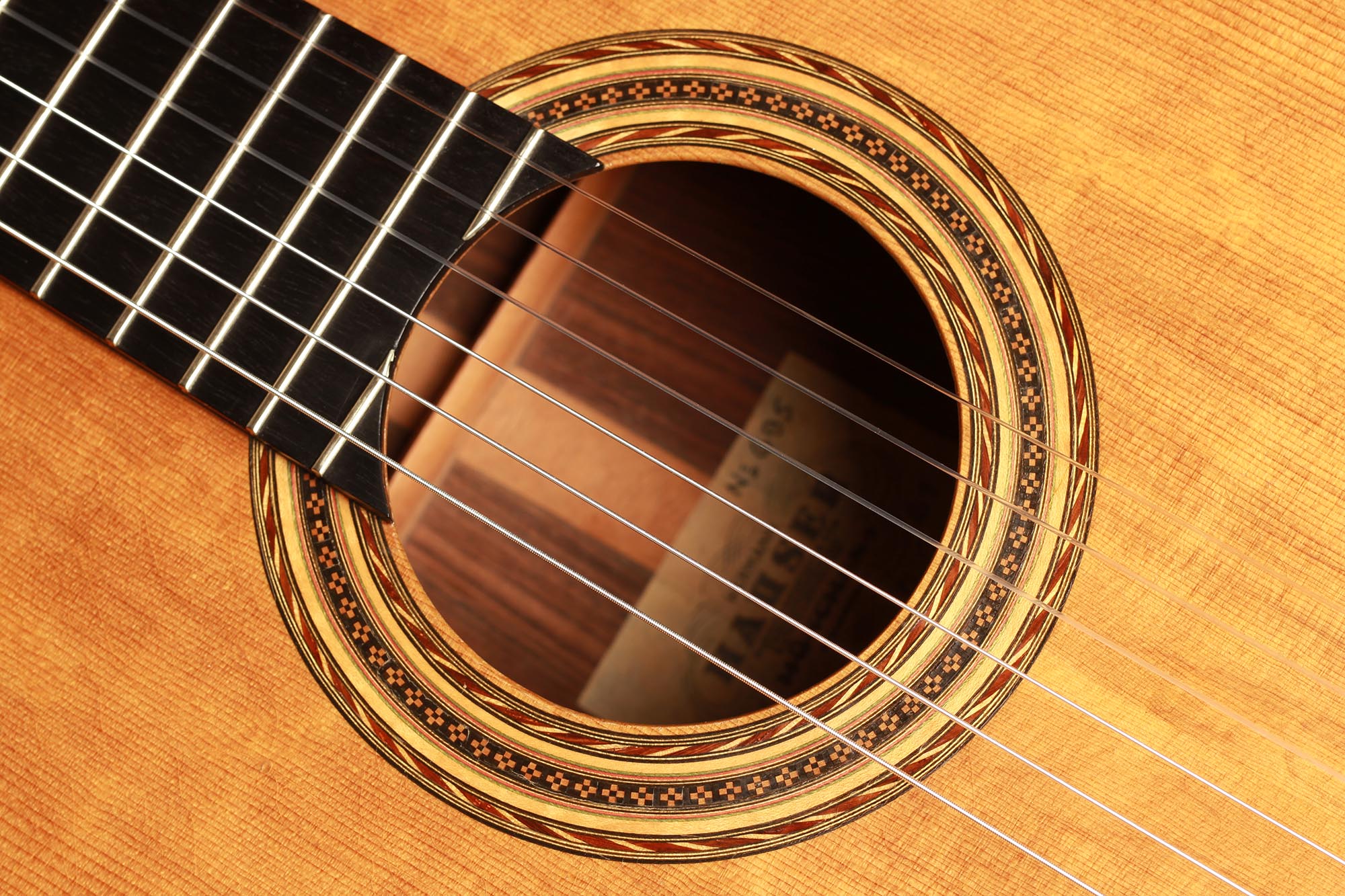 Its sound is of an unspeakable charm, with an effortless and smooth playing comfort. Pure delicate tone and well-rounded trebles reward the sensitive player. Balanced overtones complement the very lyrical first string to give an expressive and truly sophisticated guitar. This striking instrument is an absolute rarity and above all a true masterpiece.