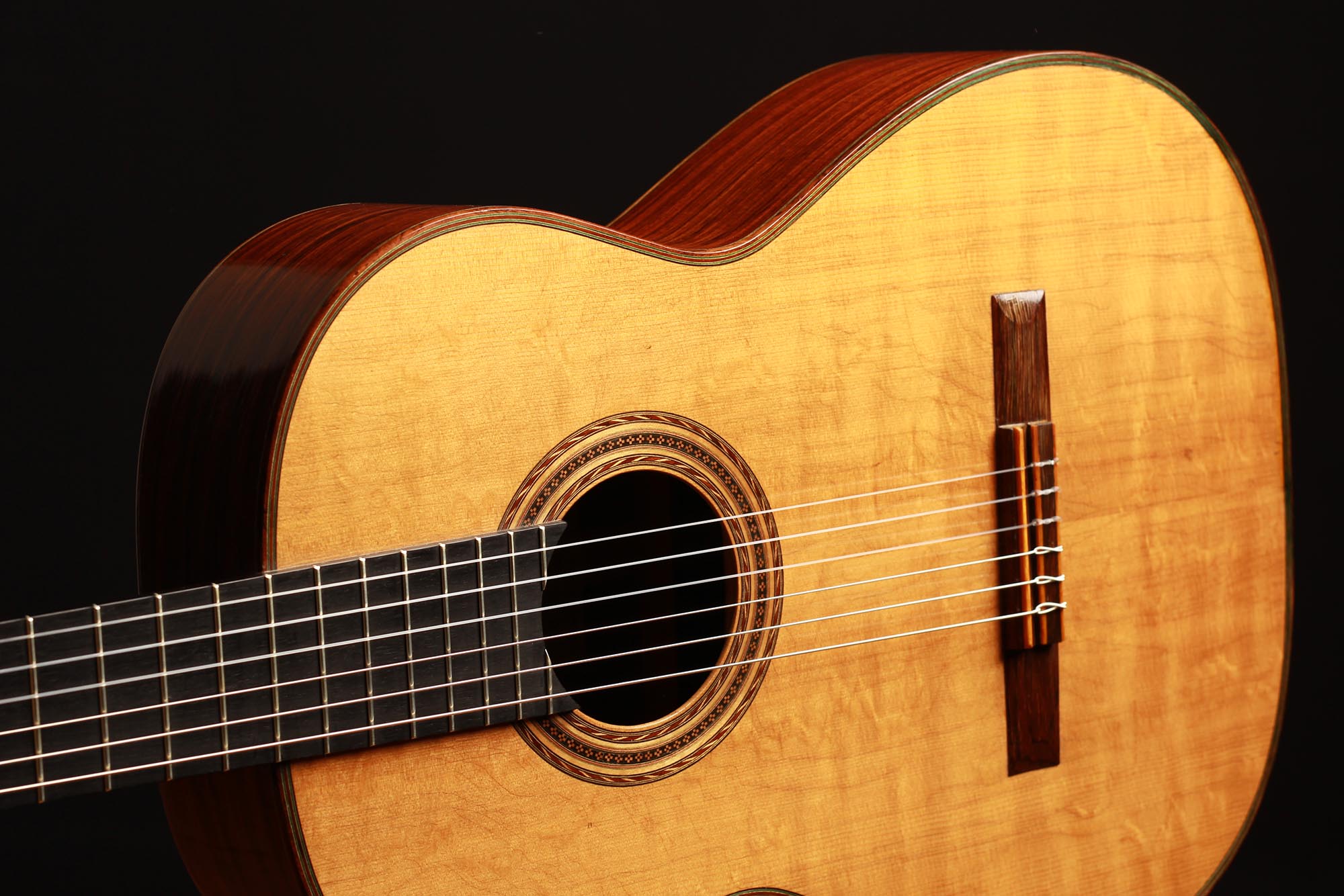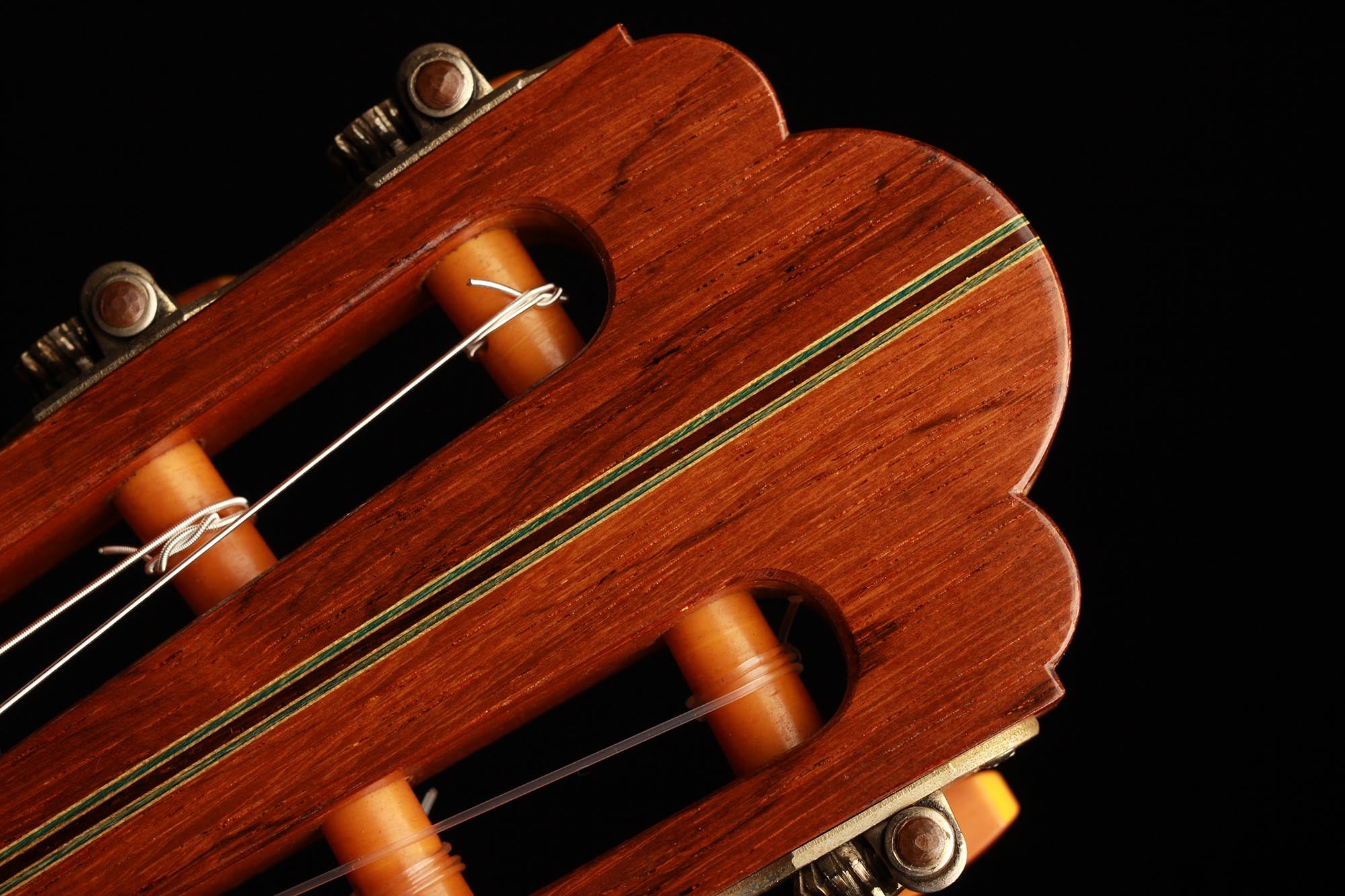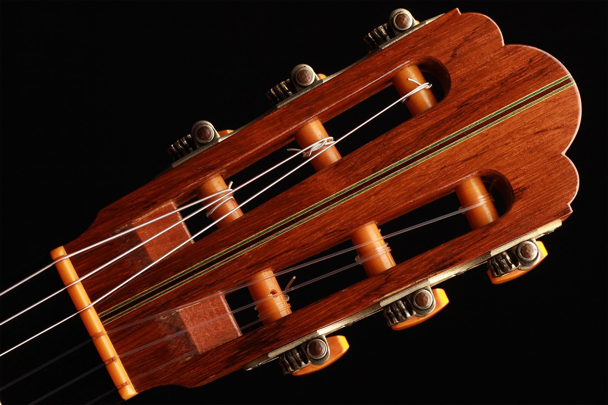 Its sound is of an unspeakable charm, with an effortless and smooth playing comfort. Pure delicate tone and well-rounded trebles reward the sensitive player. Balanced overtones complement the very lyrical first string to give an expressive and truly sophisticated guitar. This striking instrument is an absolute rarity and above all a true masterpiece.