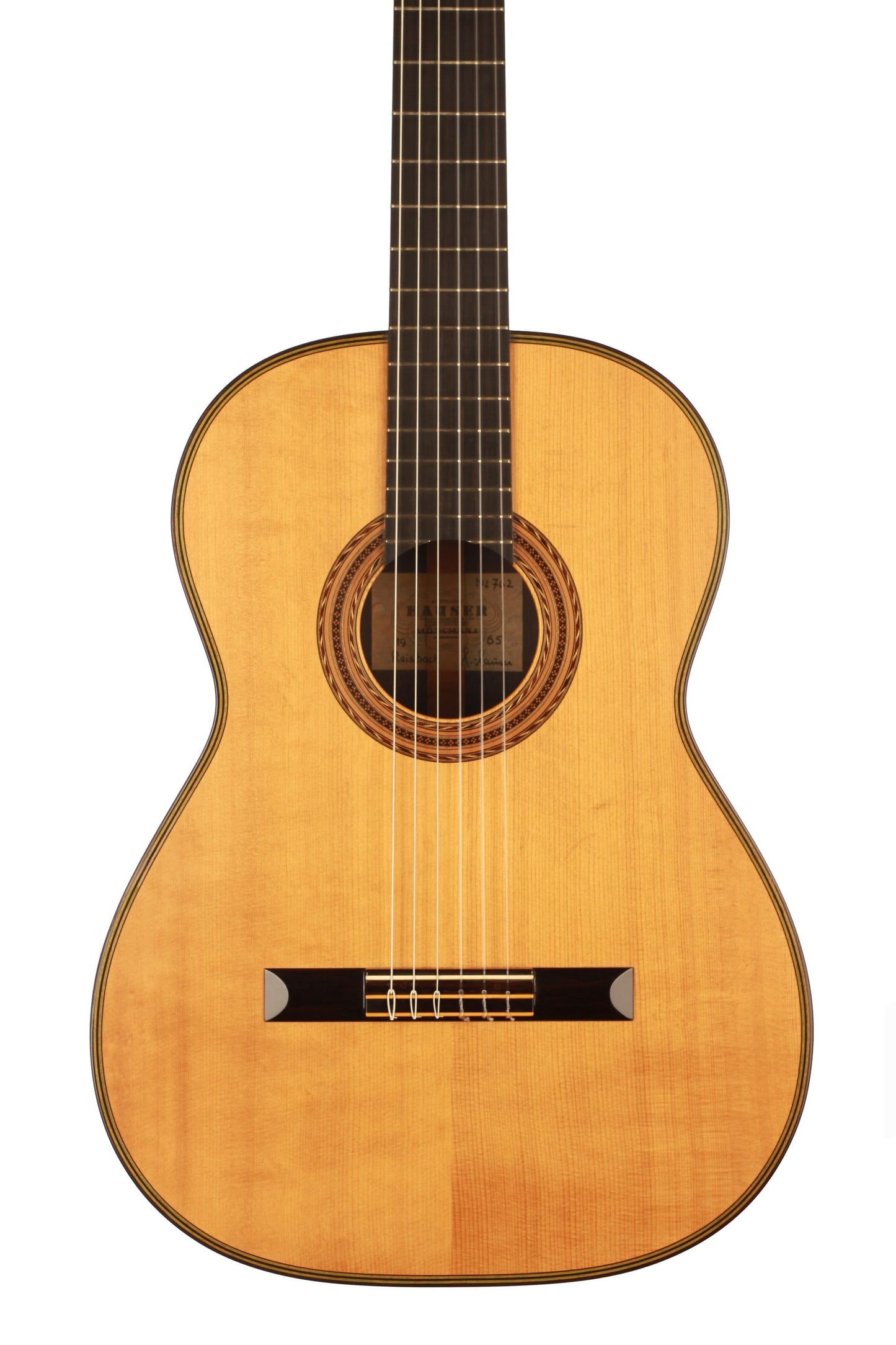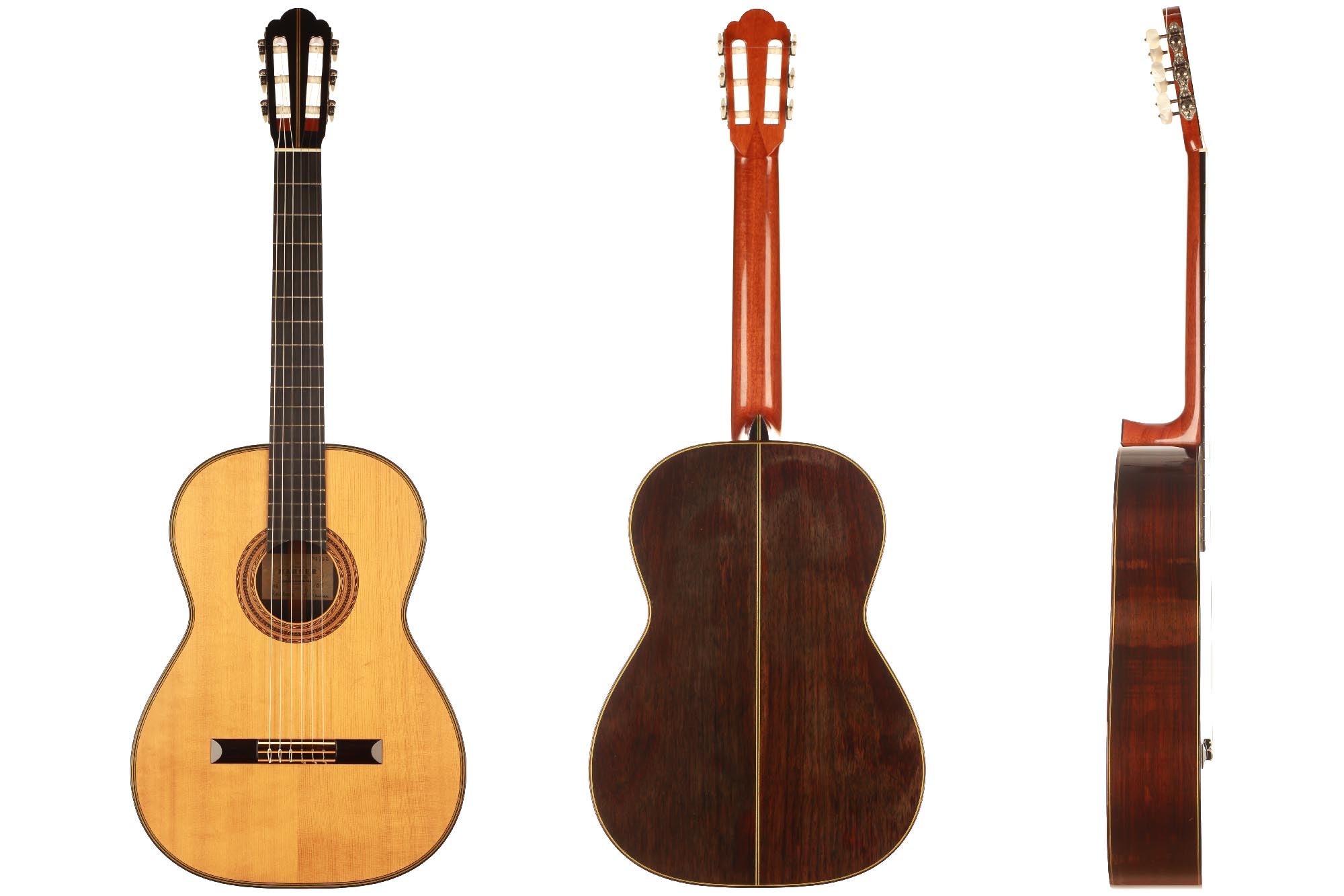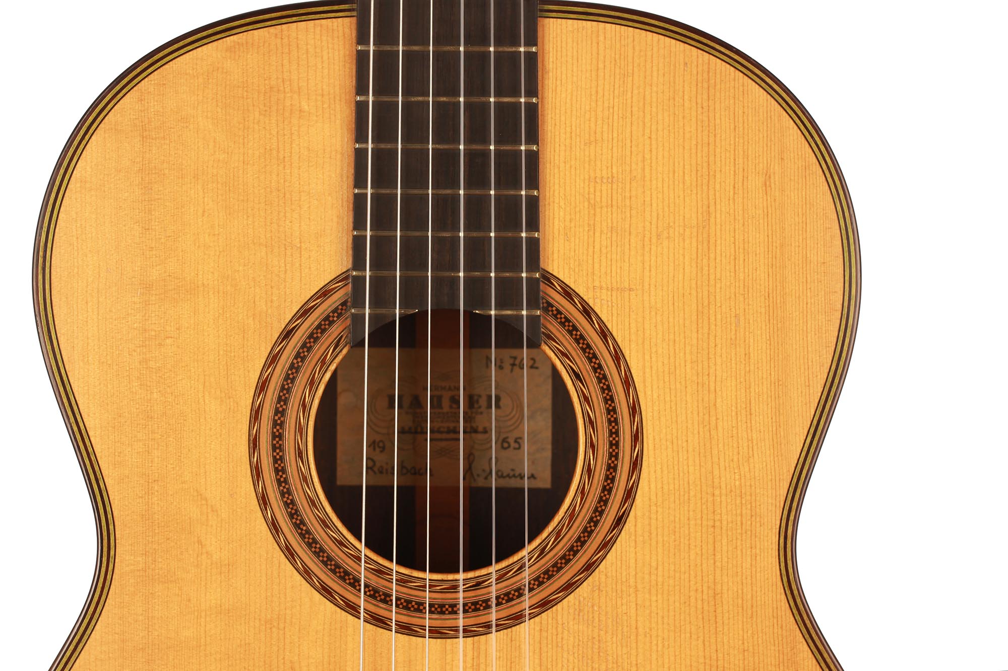 This guitar built in 1965 and numbered 762 is an absolute beauty, one of the finest Hermann Hauser ® II guitars one could imagine. It is absolutely free of cracks and only wears a few minimal playing marks on the top. The varnish is entirely original and untouched, and the top is hand signed. Only the best woods were used for this guitar: German bear-claw spruce and highly figured Brazilian rosewood (Cites certified).