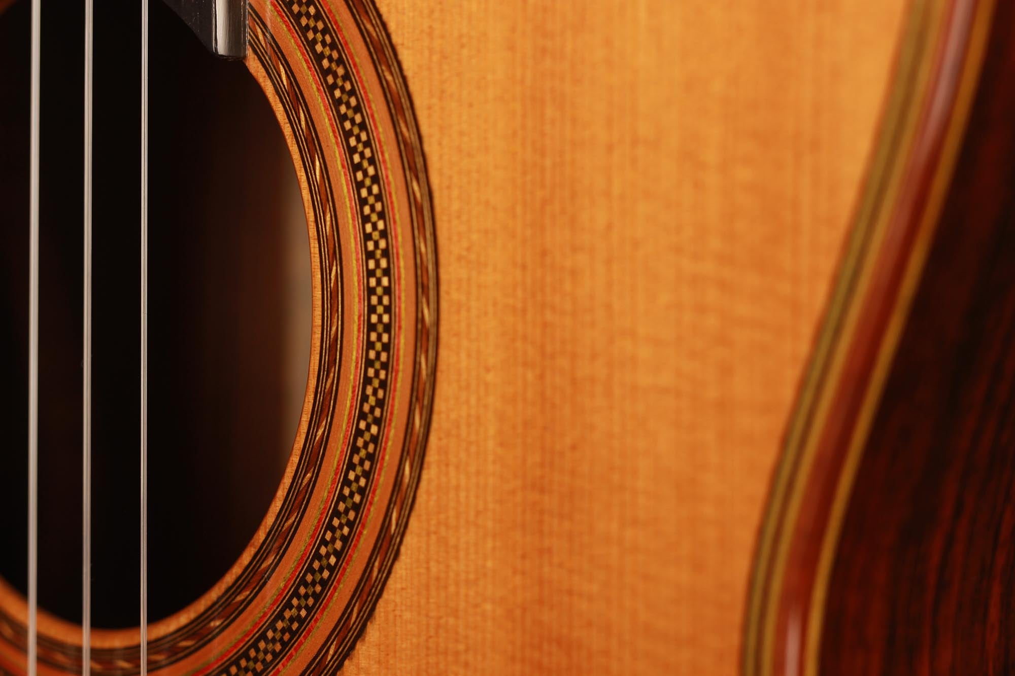 This superb 1976 Hermann Hauser ® II is an extremely well-preserved example of the German master's finest guitars. Very few playing marks are to be noticed, and only a small crack under the bridge is visible. The latter has been very well repaired and is perfectly stable. This Hauser ® has a splendid rosette with red and green colours, and the varnish is entirely original.