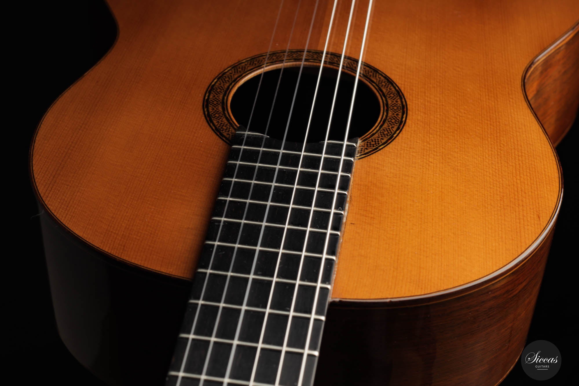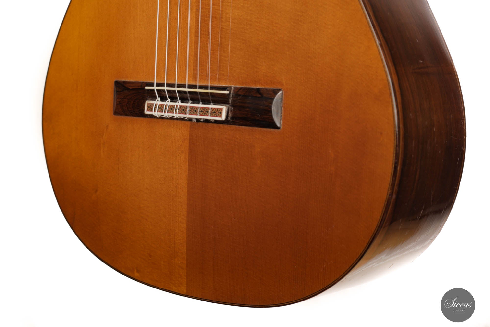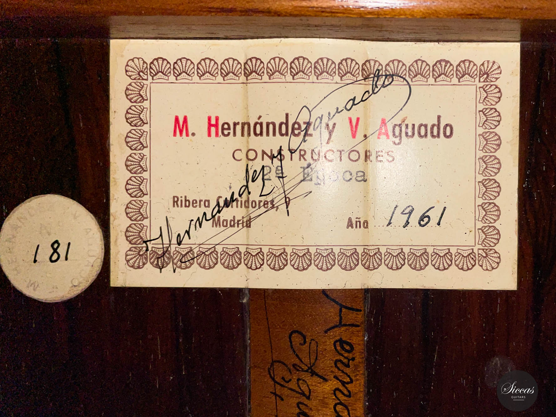 This instrument is a true masterpiece, made in 1961 and numbered 181. The instrument is signed on the label and inside, representing the very best work produced by this renowned guitar-building duo. This guitar was crafted in the same year as the 1961 Regino Sainz de la Mazza guitar, another celebrated instrument made by the same artisans. The low body resonance of F creates deep, haunting bass tones that are complemented by bright and singing trebles, offering a playing experience that is both unique and satisfying for both players and collectors alike. This guitar is rare, with all the hallmarks that have made Hernández y Aguado instruments so sought after worldwide. The sound is characterized by great expressiveness, fantastic sustain, and perfect intonation. Although it has been around for more than half a century, this beautiful instrument is still in very good condition, with only several well-repaired cracks on the soundboard. One typical crack can be found next to the fingerboard on the bass side, with three more located on the lower bout. Two of these cracks have been expertly glued, while one is reinforced with a cleat. Additionally, a tiny part on the edge of the lower bout was replaced, but this repair is also very stable. Overall, the Hernández y Aguado guitar No. 181 is a stunning example of guitar craftsmanship and an instrument that any player or collector would be proud to own.