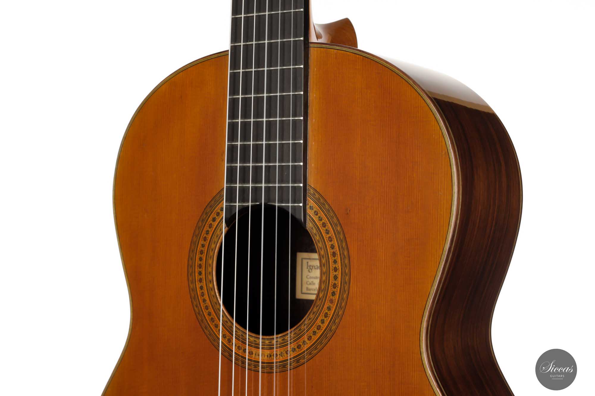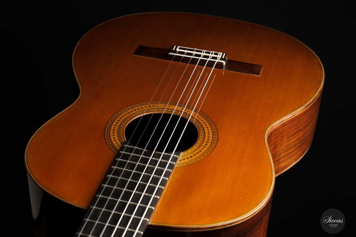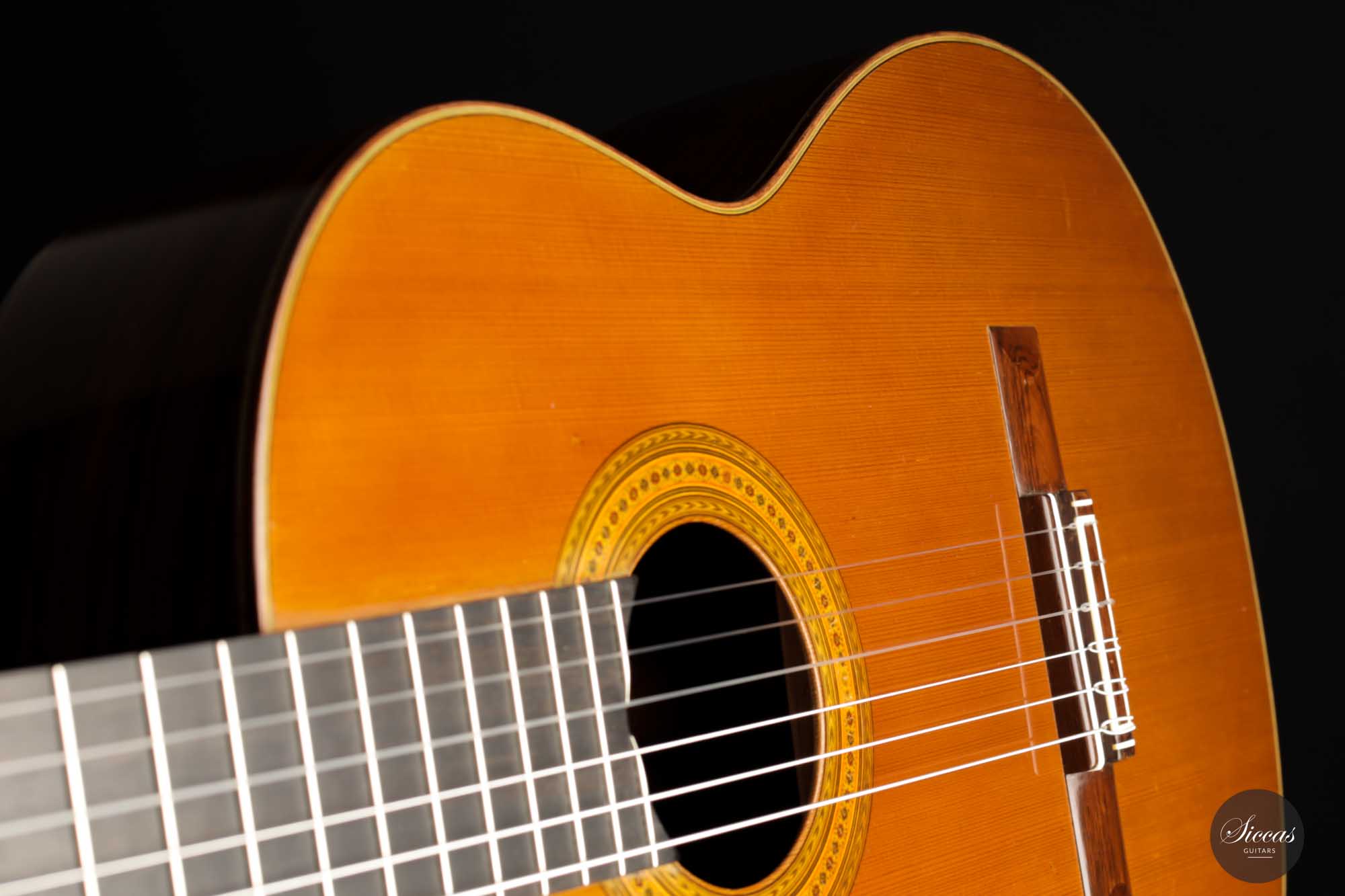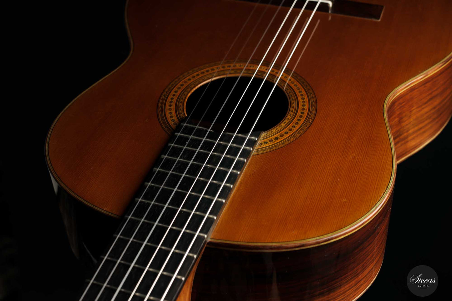 Many players and aficionados consider Ignacio Fleta's 1970s guitars as the golden cedar period of his career due to their magical, powerful, and rich sound. This beautiful 1973 guitar, numbered 637, is indeed no exception. Its dark cedar soundboard perfectly matches its haunting, mysterious, and dark tonal characteristics. Adding to it the striking Indian rosewood back and sides, this instrument is truly a treat for the eyes. Most importantly, this guitar has been well-preserved throughout its life and is now in a rare-to-find condition with no structural damage. Only the finish of this guitar has been refreshed masterfully. Furthermore, the poetic voices and colors of this instrument will bring any musical work into the world of storytelling. Other remarkable characteristics of this guitar are its G# body resonance, almost cello-like, and its excellent separation of voices, especially when playing chordal passages. This is undoubtedly a fine example from one of the greatest luthiers of the 20th century. A very desirable instrument for both collector and performer.