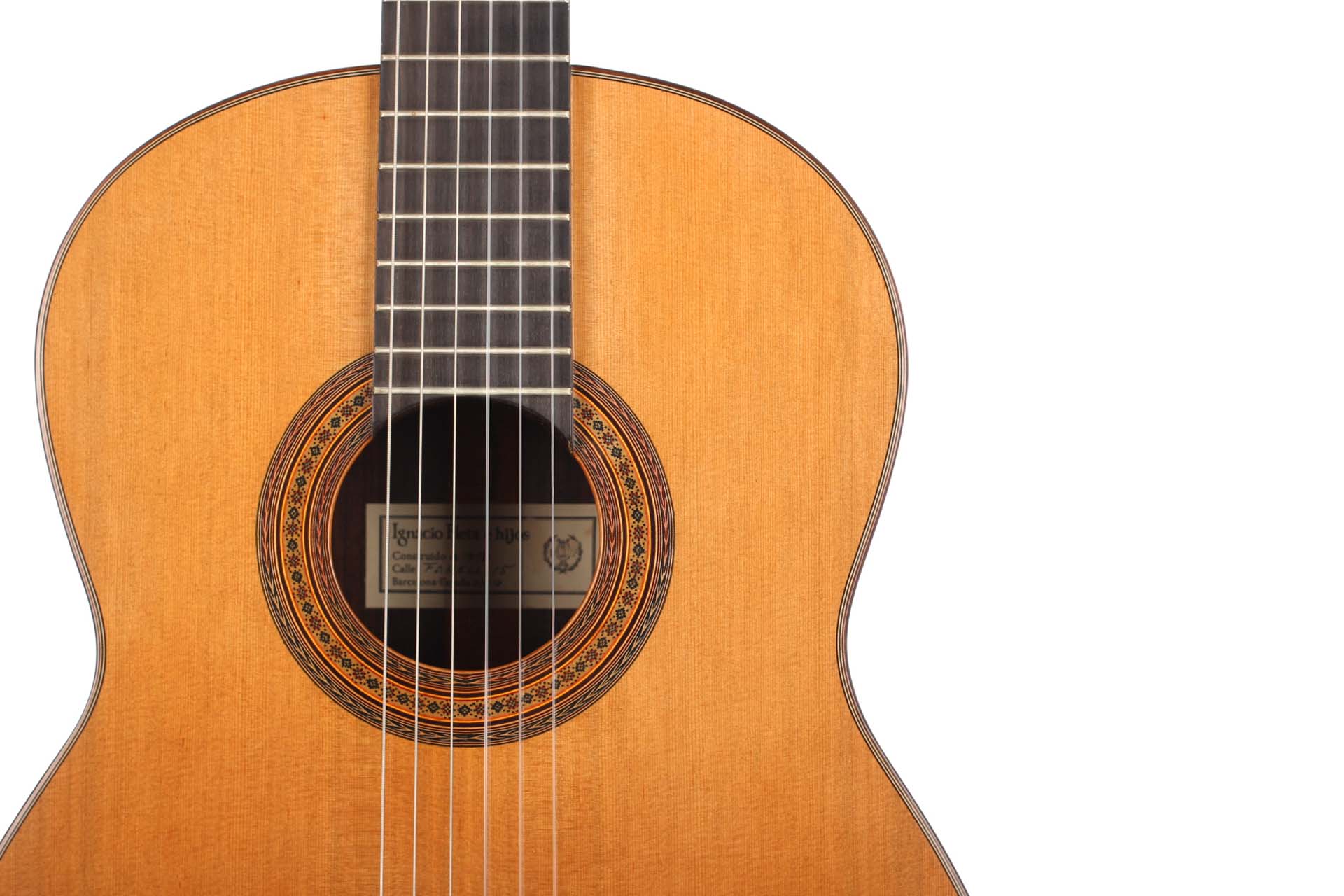 Ignacio Fleta (1897-1977) is one of the most famous luthiers worldwide. Not only did he build guitars, but also violins, violas, violoncellos, vihuelas, and violas da gamba. After his death, his two sons Gabriel and Francisco Fleta and his grandson Gabriel Fleta Jr. continued his work.The waiting time after a new order amounts to approximately 20 years. This guitar is a true rarity for guitar collectors and players. The innermost and outermost part of the guitar’s rosette consist of one ring with herringbone pattern design each. In the middle of those two rings another ring can be found showing a mosaic in the shape of blossoms. The top is made of cedar and the sides and the back are made of Indian Rosewood. The guitar is equipped with Fustero machine heads. The overall condition is very good, it has only a few signs of playing wear. This guitar is a true rarity for guitar collectors and players.
