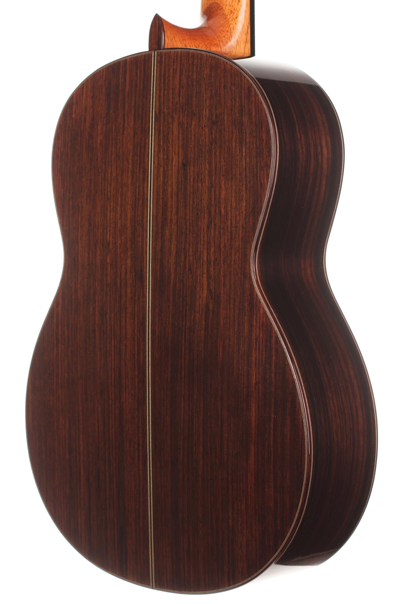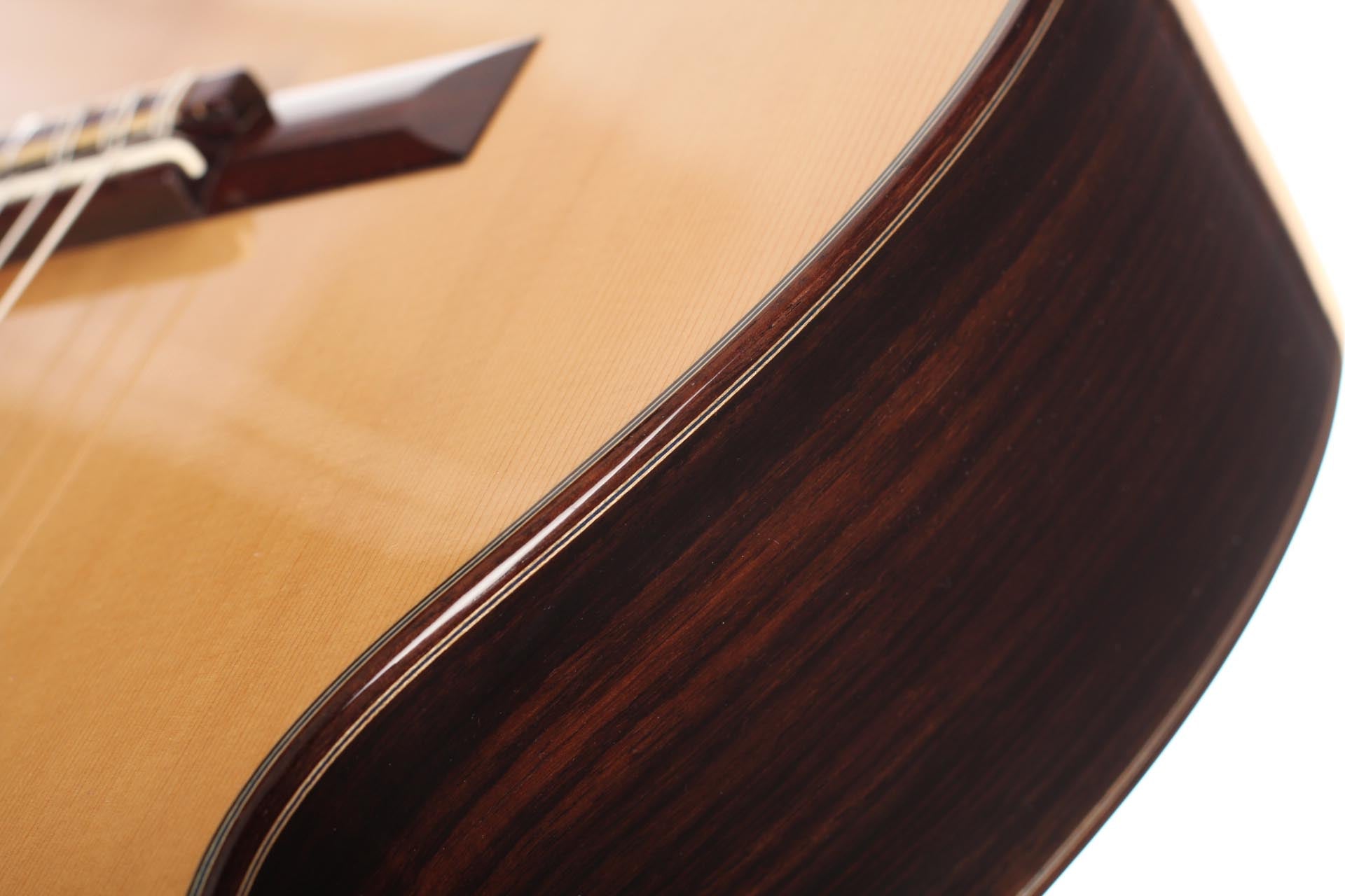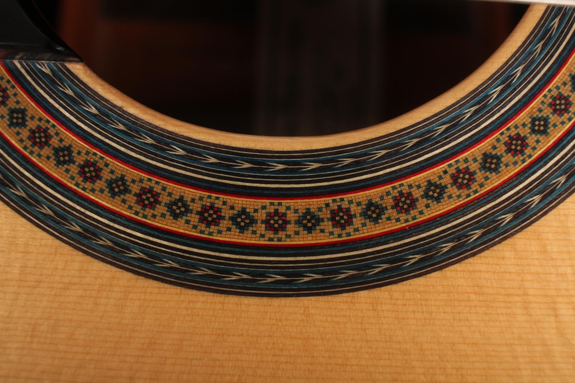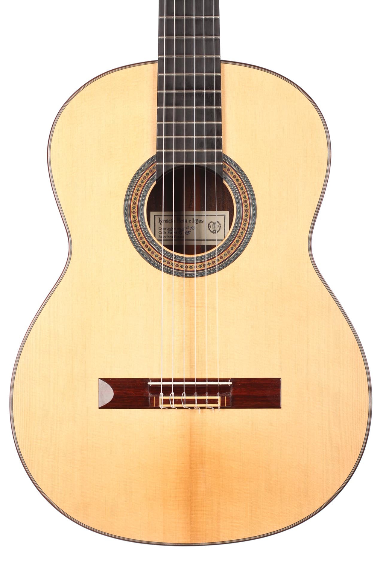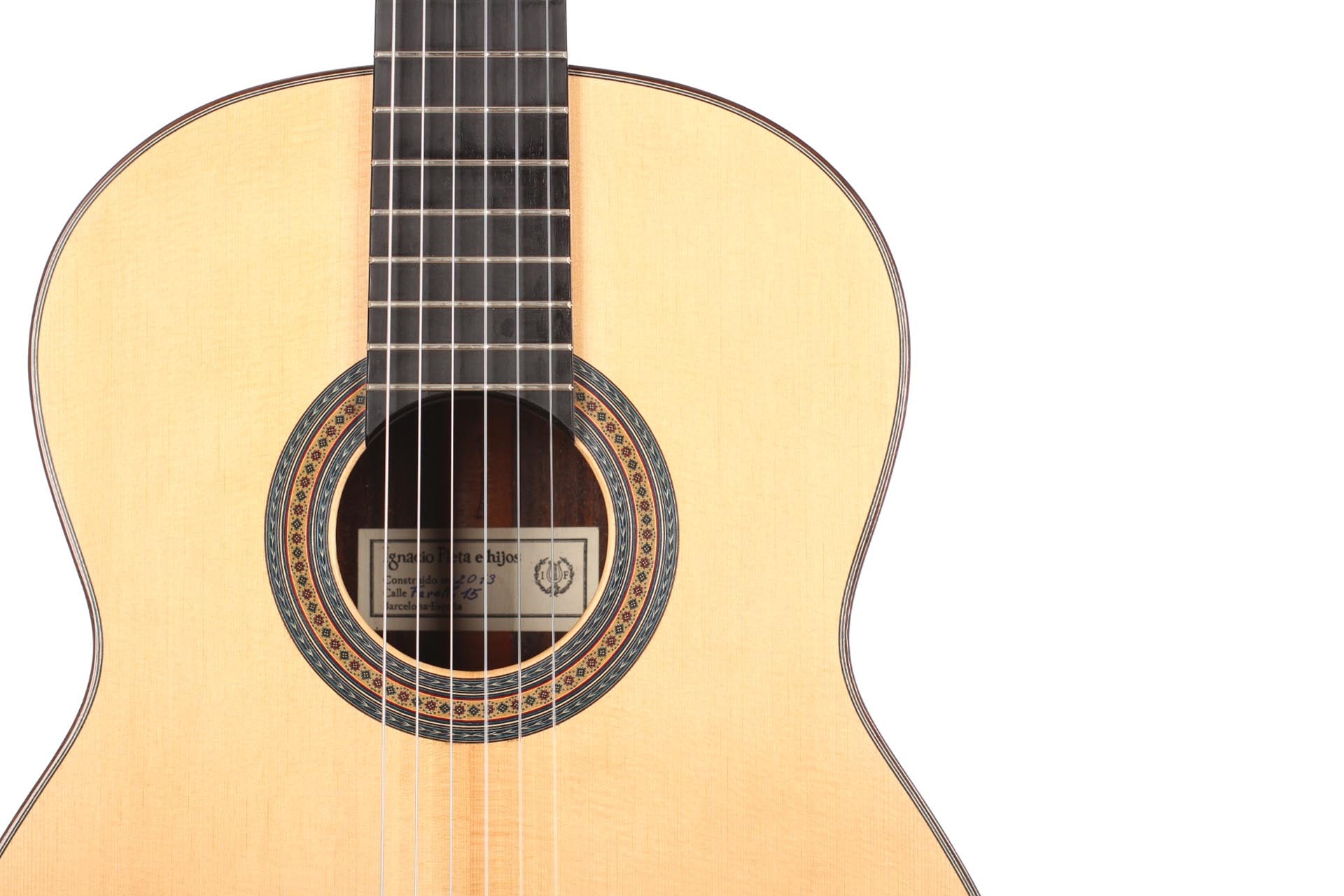 Ignacio Fleta lived from 1897 till 1977 and is one of the most famous luthiers worldwide. Not only did he build guitars, but also violins, violas, violoncellos, vihuelas, and violas da gamba. After his death, his two sons Gabriel and Francisco Fleta and his grandson Gabriel Fleta Jr. continued his work. Today Gabriel Fleta runs the workshop in Calle Farell 15. Today the waiting time for a new guitar is approximately 20 years. Fletas of the newer generation are very rare since only few customers sell their instruments after having waited for over 20 years. This guitar is an absolutely rare opportunity to buy one of these newer Fletas. The beautiful looking spruce top has only very minor playing or handling marks. A highlight is the rosette that is made of blueish shavings in combination with the traditional Fleta flower design - a special combination that, as far as we know, was solely used for this guitar. The innermost and outermost part of the guitar’s rosette consists of rings with herringbone pattern design. The bridge is also decorated with mosaic inlays, which are framed by mother of pearl inlays. The back and sides are made of very old Indian Rosewood. The basses are quite focused and clear while the trebles have a lot of sustain and sing with clarity. The tuners are made by Fustero. This guitar is a true rarity for guitar collectors and players. A Hiscox Pro II case is included.