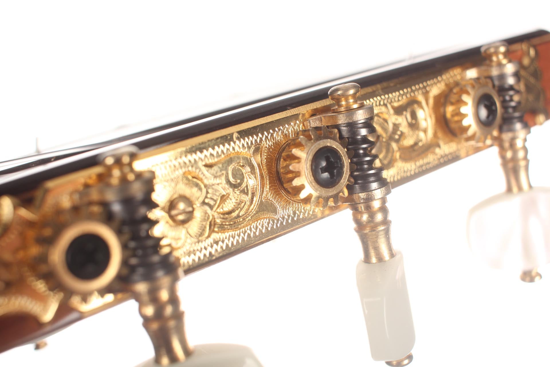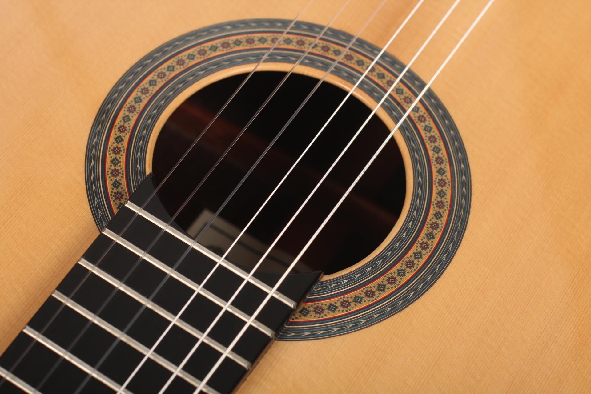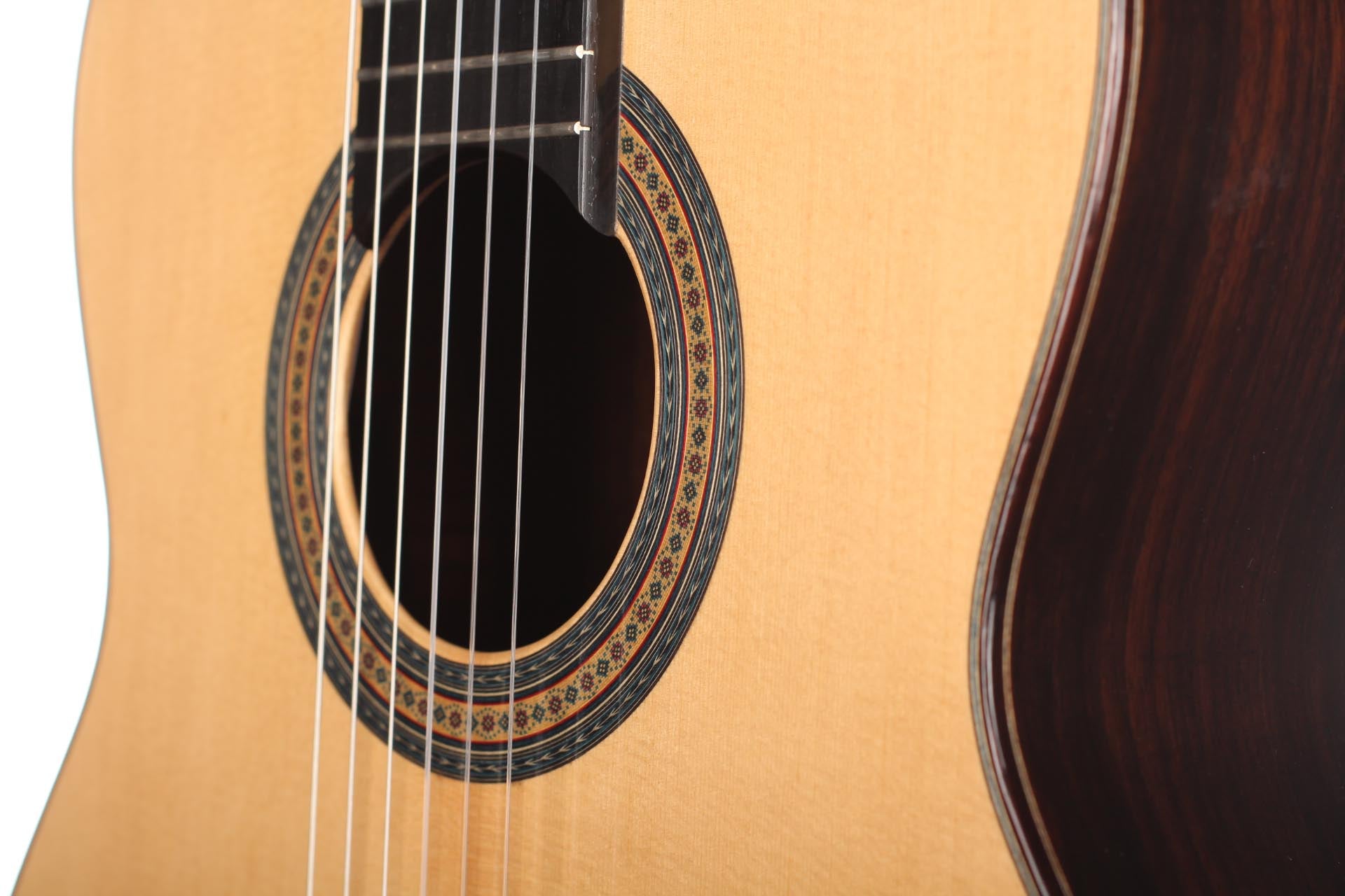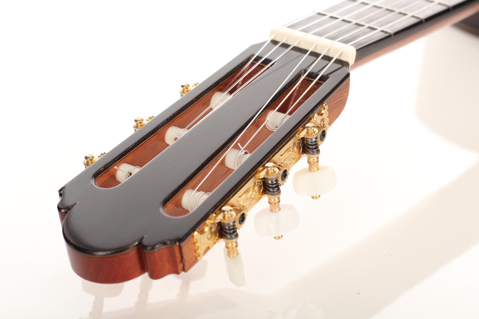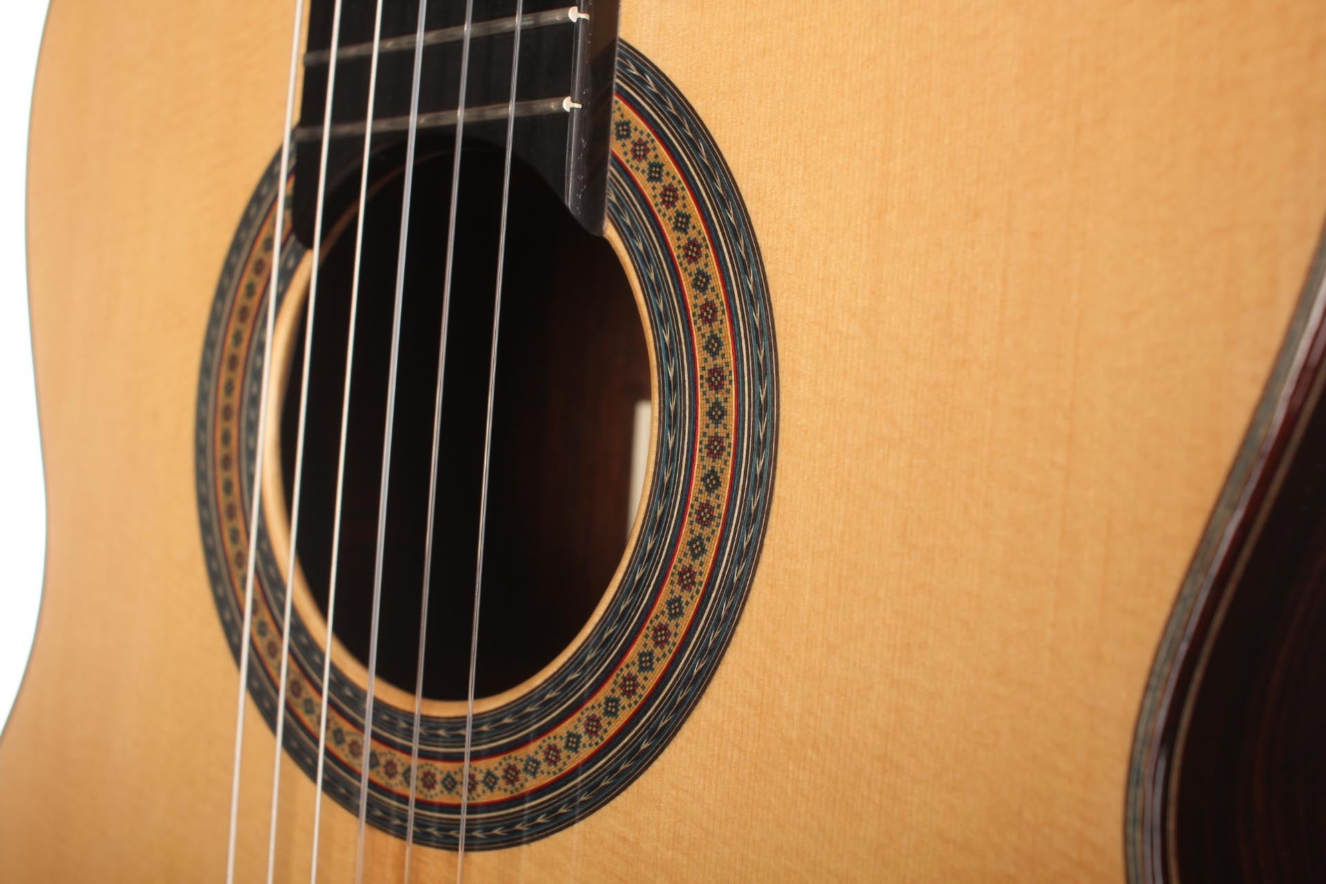 Ignacio Fleta lived from 1897 till 1977 and is one of the most famous luthiers worldwide. Not only did he build guitars, but also violins, violas, violoncellos, vihuelas, and violas da gamba. After his death, his two sons Gabriel and Francisco Fleta and his grandson Gabriel Fleta Jr. continued his work. Today Gabriel Fleta runs the workshop in Calle Farell 15. Today the waiting time for a new guitar is approximately 20 years. Fletas of the newer generation are very rare since only few customers sell their instruments after having waited for over 20 years. This guitar is an absolutely rare opportunity to buy one of these newer Fletas. The beautiful looking spruce top has only very minor playing or handling marks. A highlight is the rosette that is made of blueish shavings in combination with the traditional Fleta flower design - a special combination that, as far as we know, was solely used for this guitar. The innermost and outermost part of the guitar’s rosette consists of rings with herringbone pattern design. The bridge is also decorated with mosaic inlays, which are framed by mother of pearl inlays. The back and sides are made of very old Indian Rosewood. The basses are quite focused and clear while the trebles have a lot of sustain and sing with clarity. The tuners are made by Fustero. This guitar is a true rarity for guitar collectors and players. A Hiscox Pro II case is included.