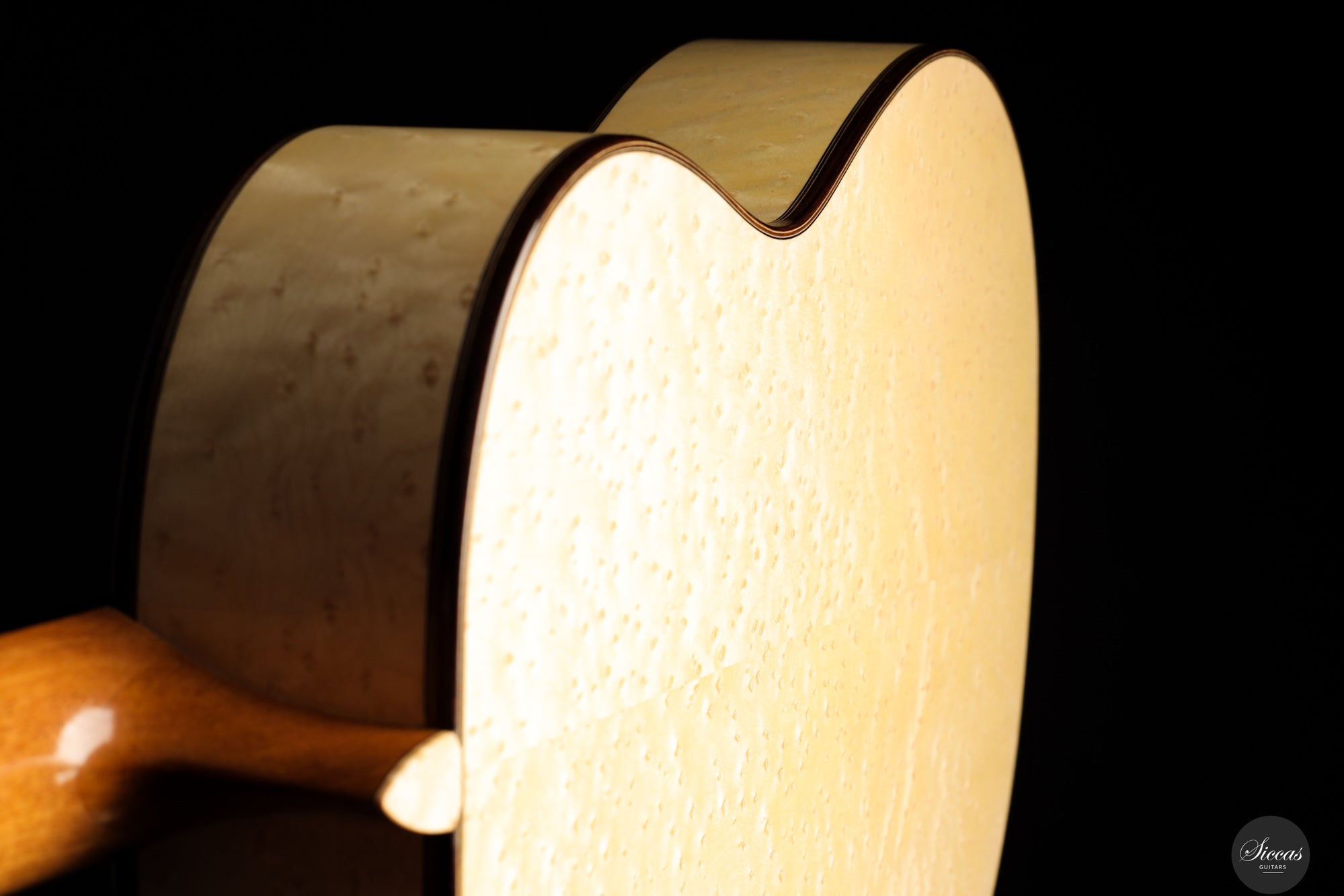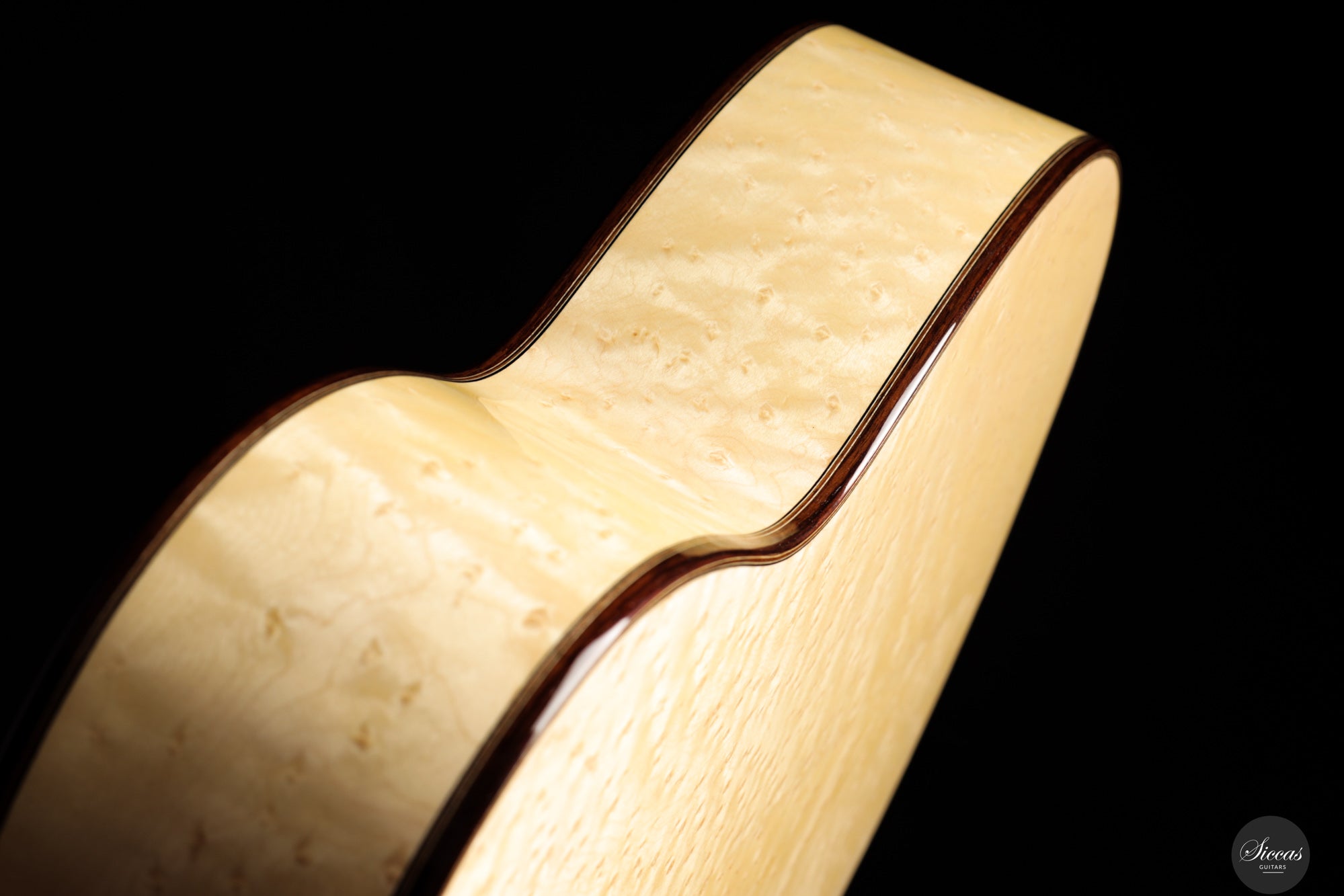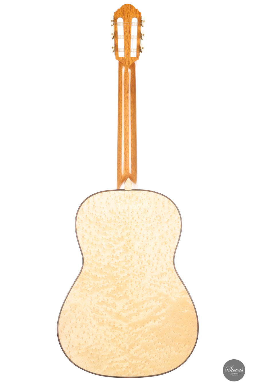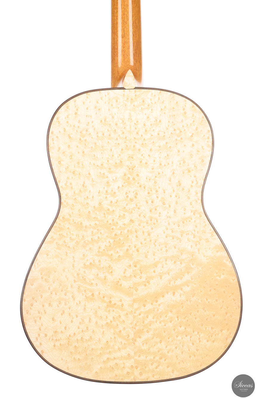 This guitar from 2024 is traditionally built with a spruce top and beautifully figured birdseye maple for the back and sides. The entire instrument is finished with French polish which preserves both resonance and tactile lightness. With a scale length of 640 mm and a nut of 49.5 mm the guitar offers an immediately comfortable feel and a slightly more compact geometry. Gotoh tuning machines complement the clean and precise visual presentation of the instrument. At only 1370 grams the guitar responds quickly and breathes freely even under the lightest touch.