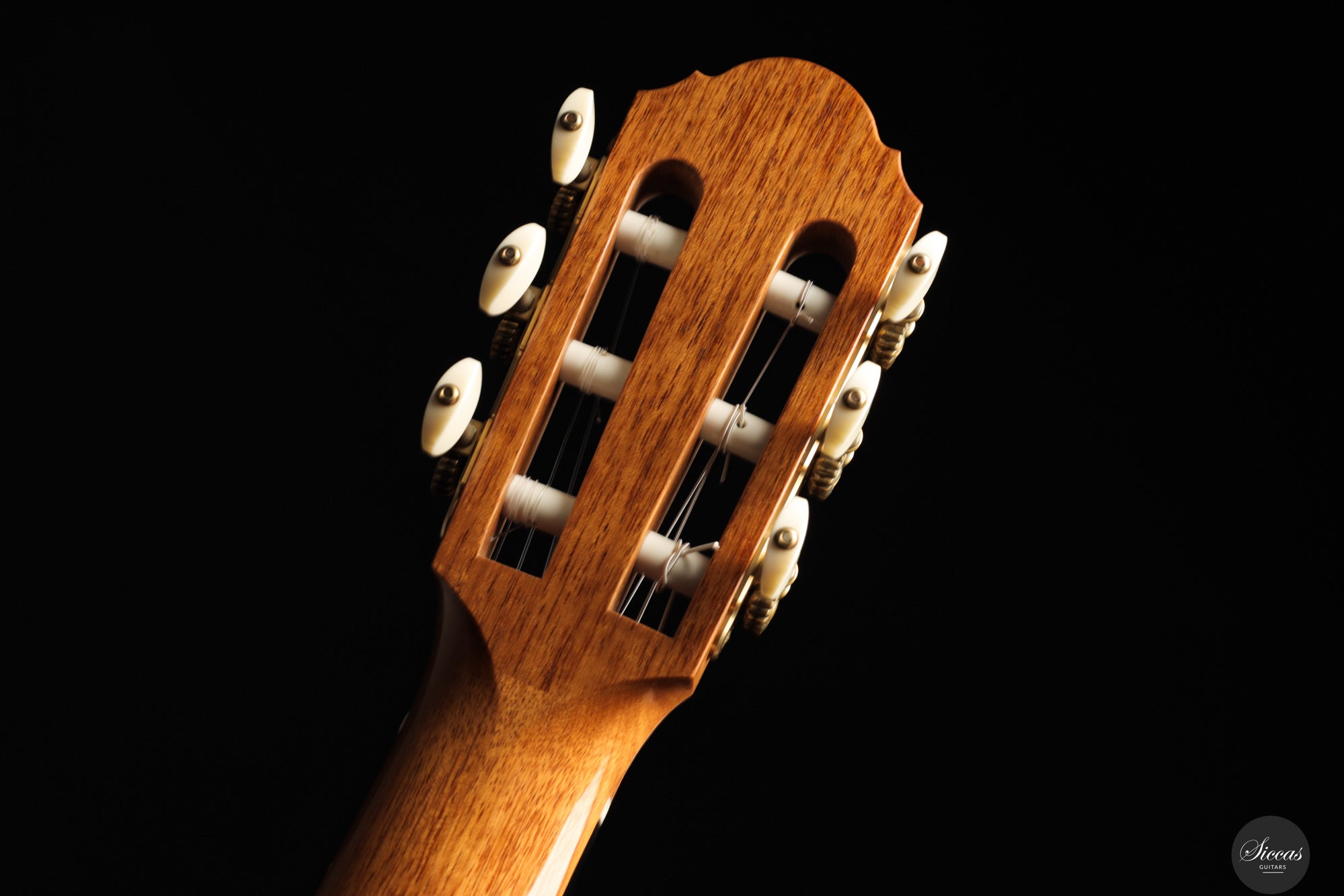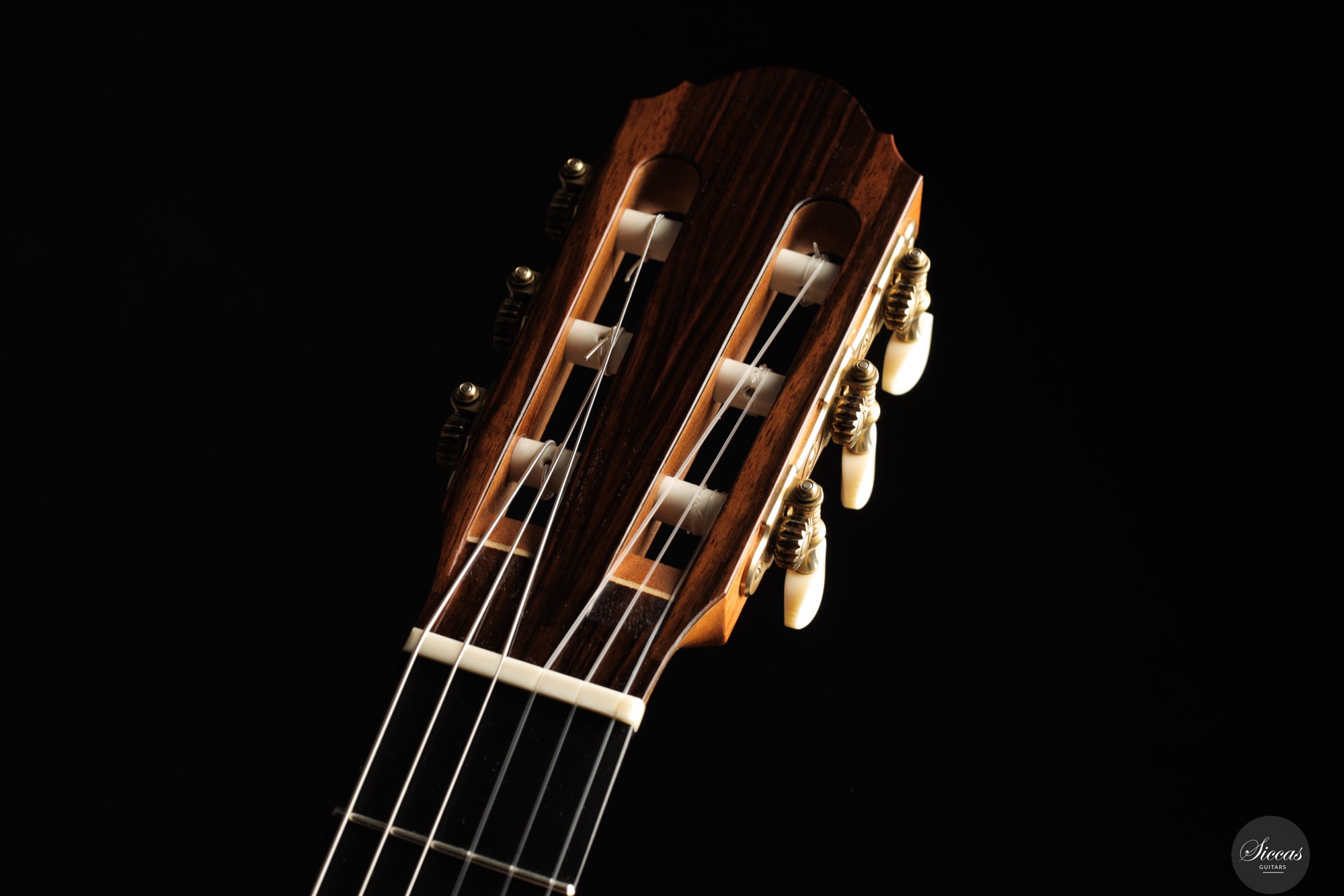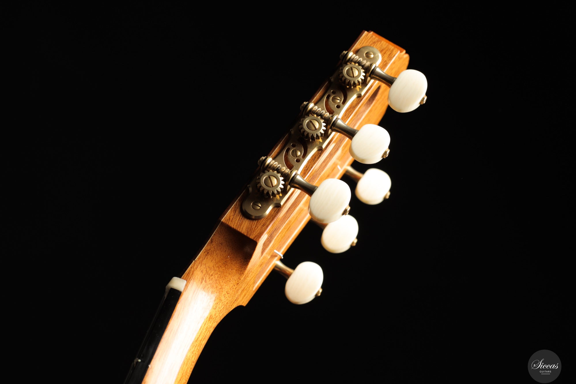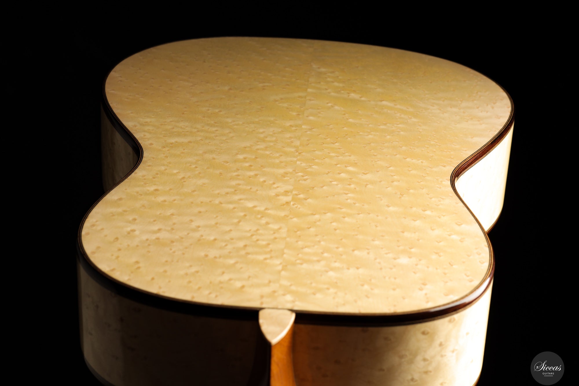 This guitar from 2024 is traditionally built with a spruce top and beautifully figured birdseye maple for the back and sides. The entire instrument is finished with French polish which preserves both resonance and tactile lightness. With a scale length of 640 mm and a nut of 49.5 mm the guitar offers an immediately comfortable feel and a slightly more compact geometry. Gotoh tuning machines complement the clean and precise visual presentation of the instrument. At only 1370 grams the guitar responds quickly and breathes freely even under the lightest touch.