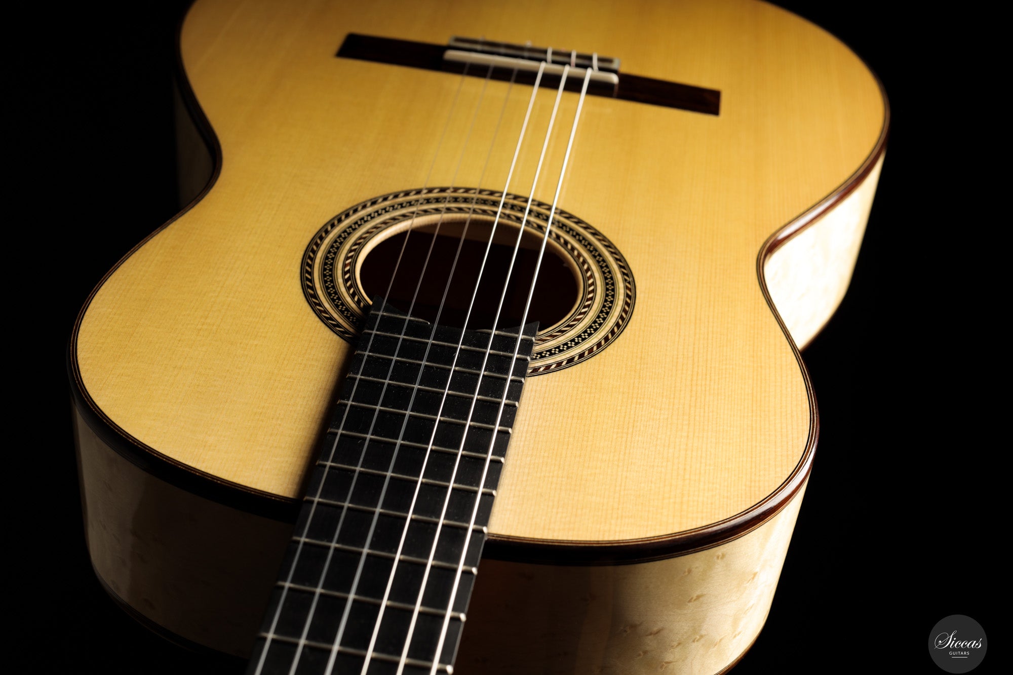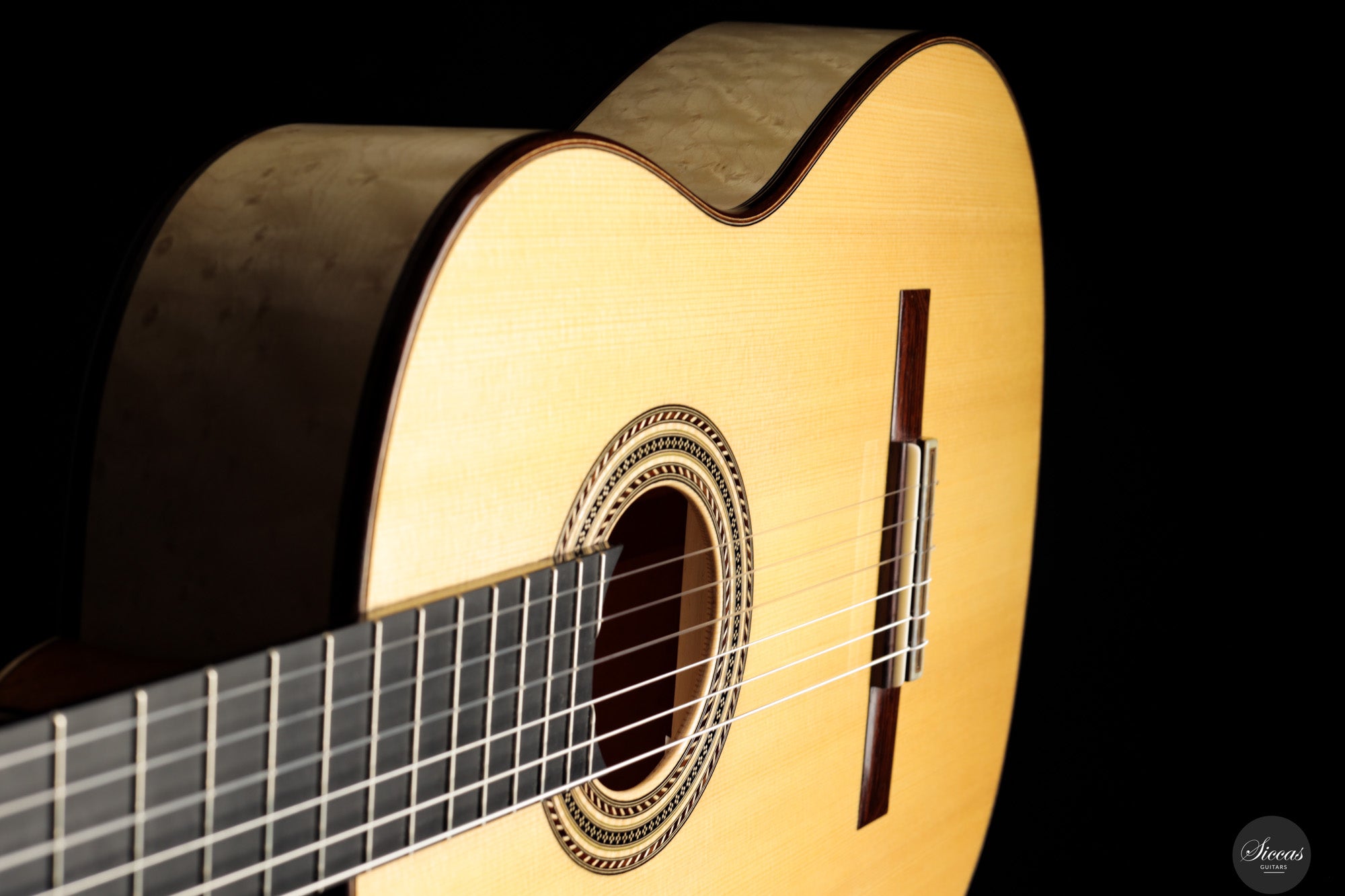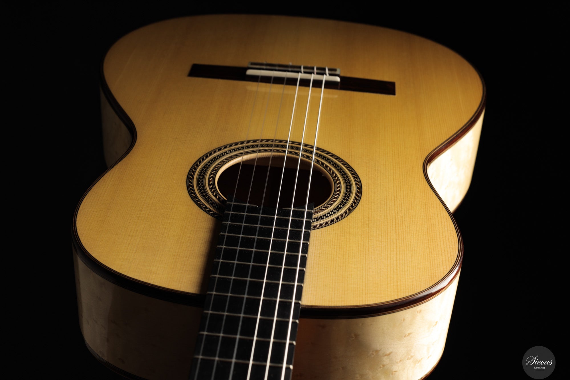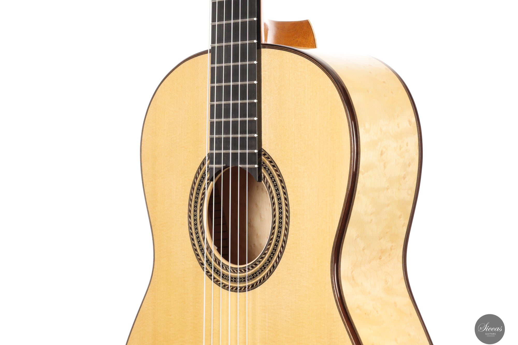 The sound is airy, full bodied and warm with a round softness that gives each note a natural presence. The resonance is strong and the sustain is long which allows melodic lines to unfold with ease. The instrument projects clearly yet keeps a gentle character that feels inviting and expressive. The balance across the registers is even and the guitar reveals many colours with only small variations of the right hand. It offers a reassuring sense of stability without losing its openness. The maple voice is present and gives the guitar a smooth and luminous quality that enhances both lyrical playing and transparent polyphony. This is an instrument that encourages the player to explore a wide tonal palette while remaining consistently comfortable in every position.