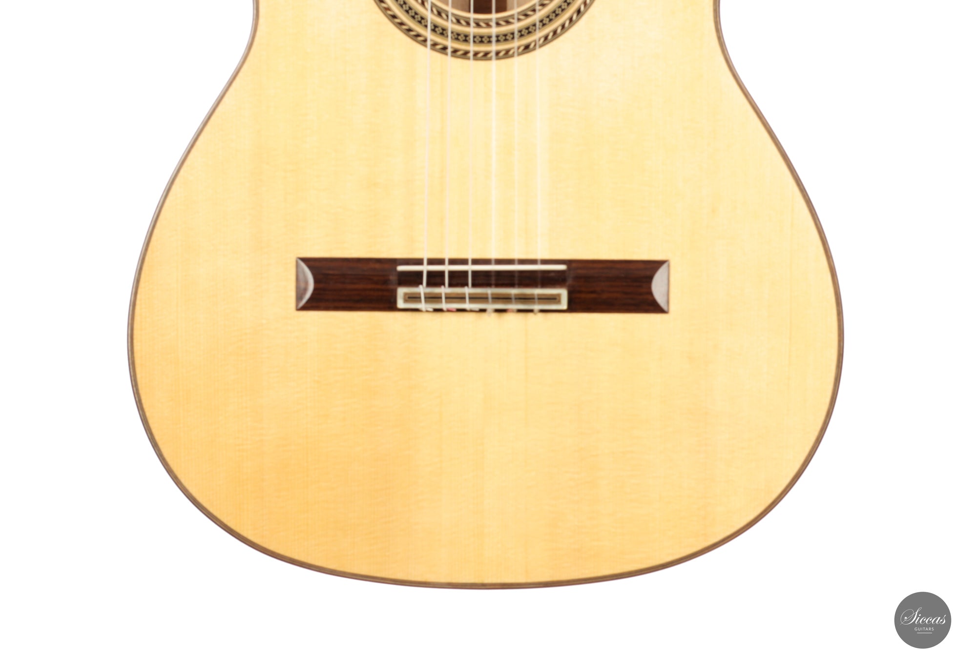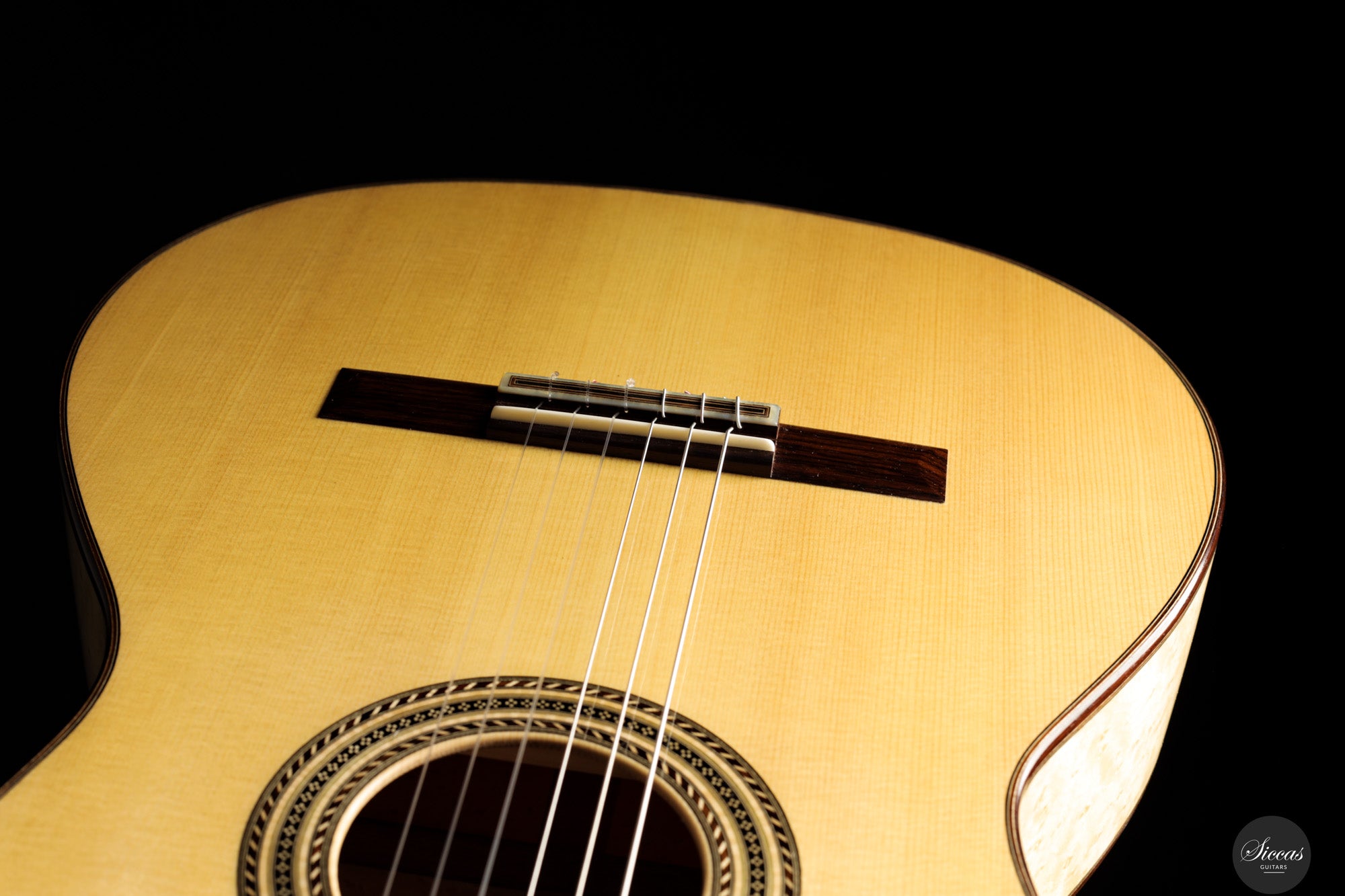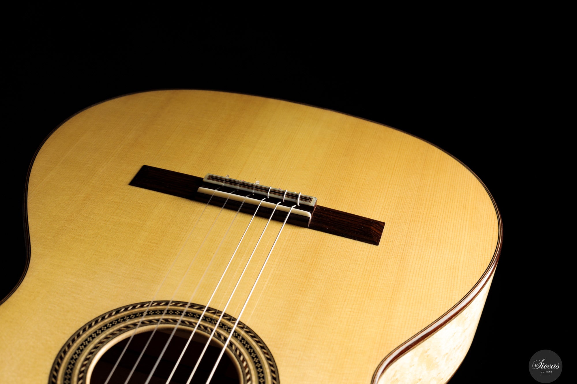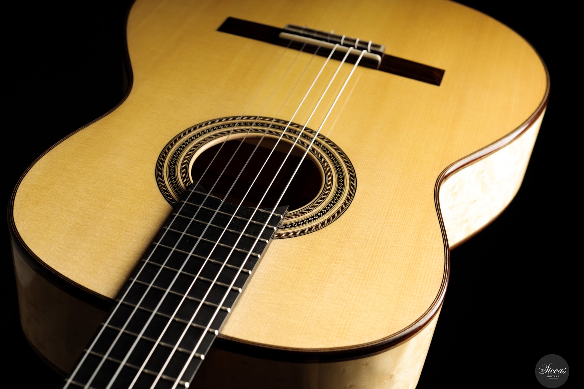 The sound is airy, full bodied and warm with a round softness that gives each note a natural presence. The resonance is strong and the sustain is long which allows melodic lines to unfold with ease. The instrument projects clearly yet keeps a gentle character that feels inviting and expressive. The balance across the registers is even and the guitar reveals many colours with only small variations of the right hand. It offers a reassuring sense of stability without losing its openness. The maple voice is present and gives the guitar a smooth and luminous quality that enhances both lyrical playing and transparent polyphony. This is an instrument that encourages the player to explore a wide tonal palette while remaining consistently comfortable in every position.