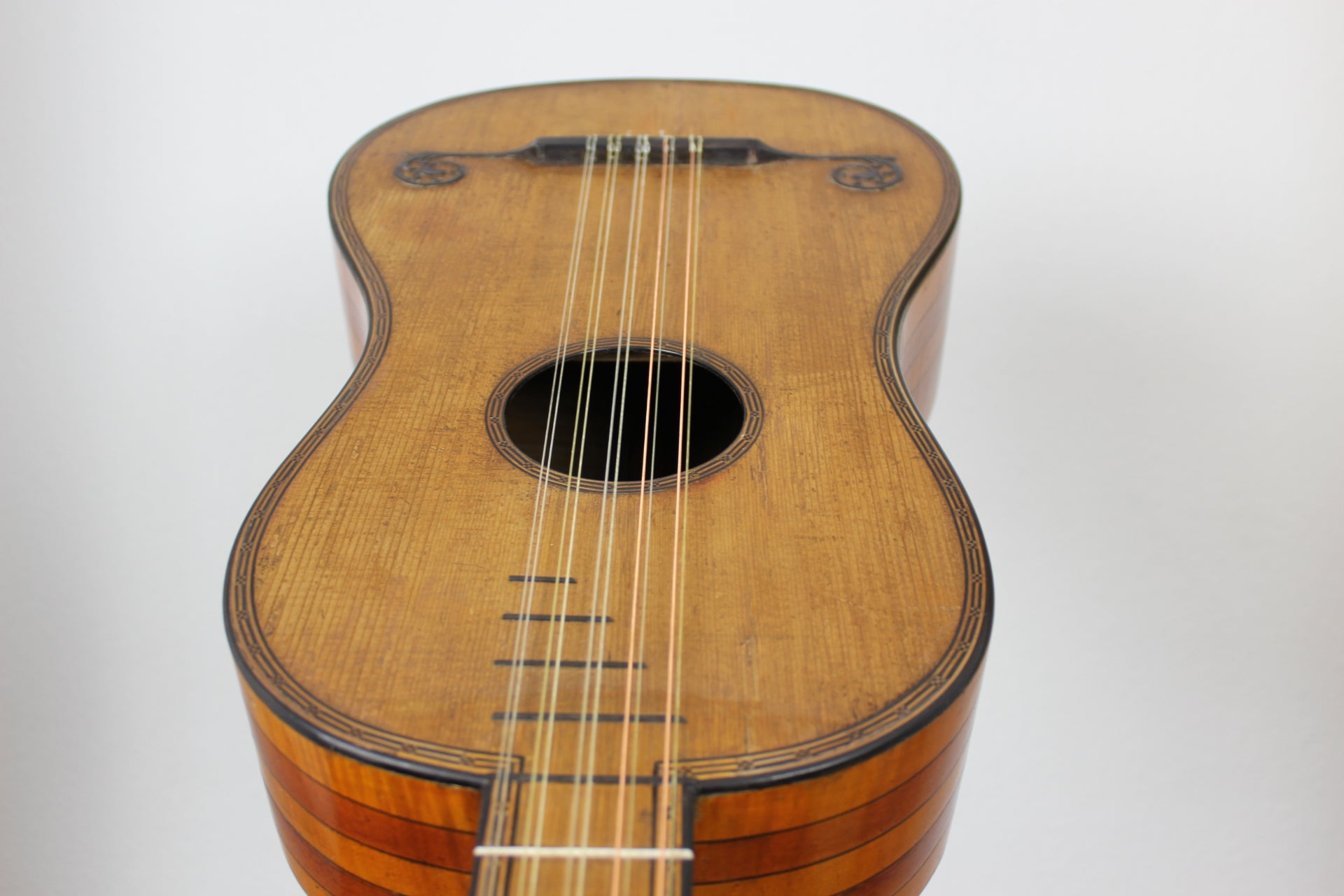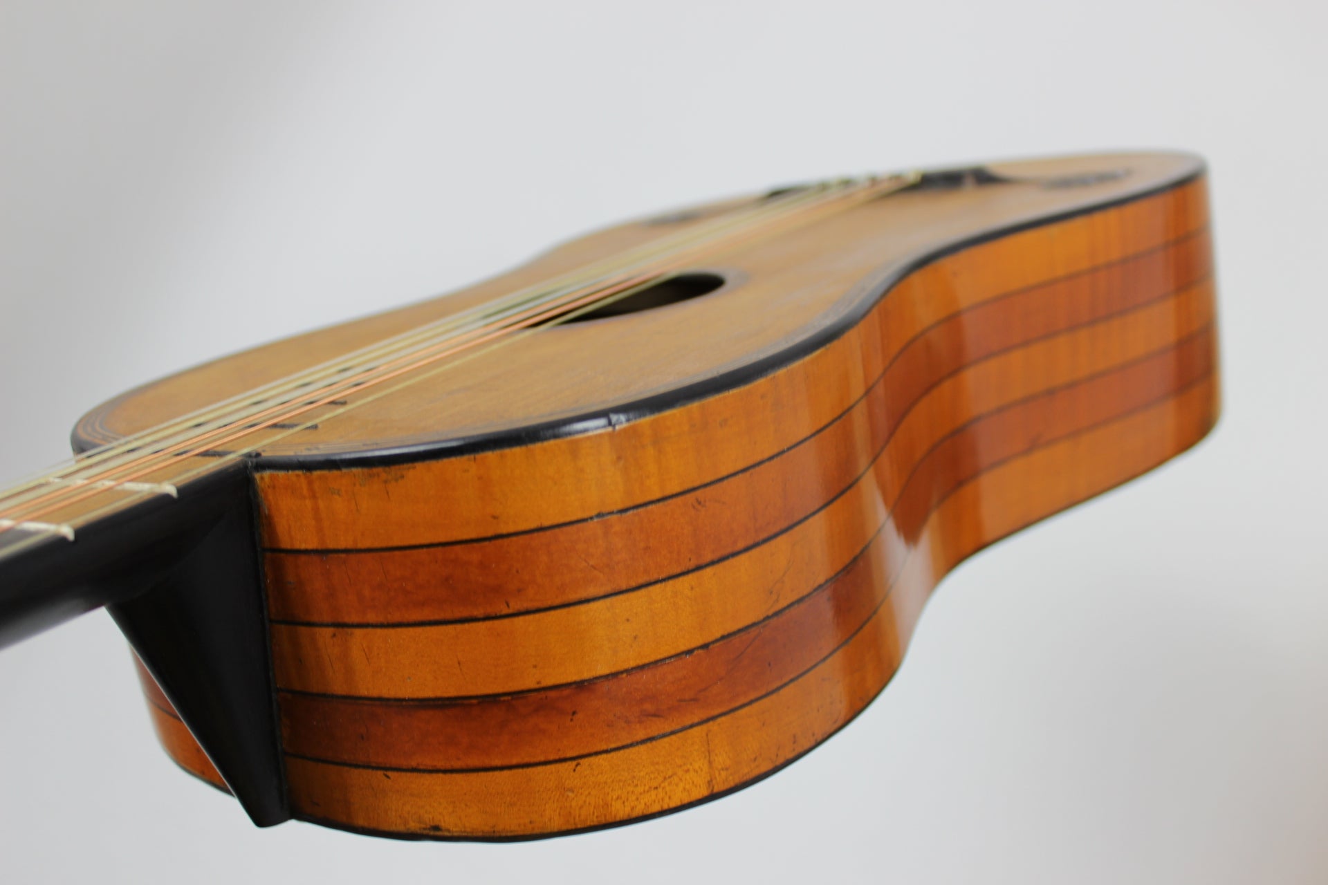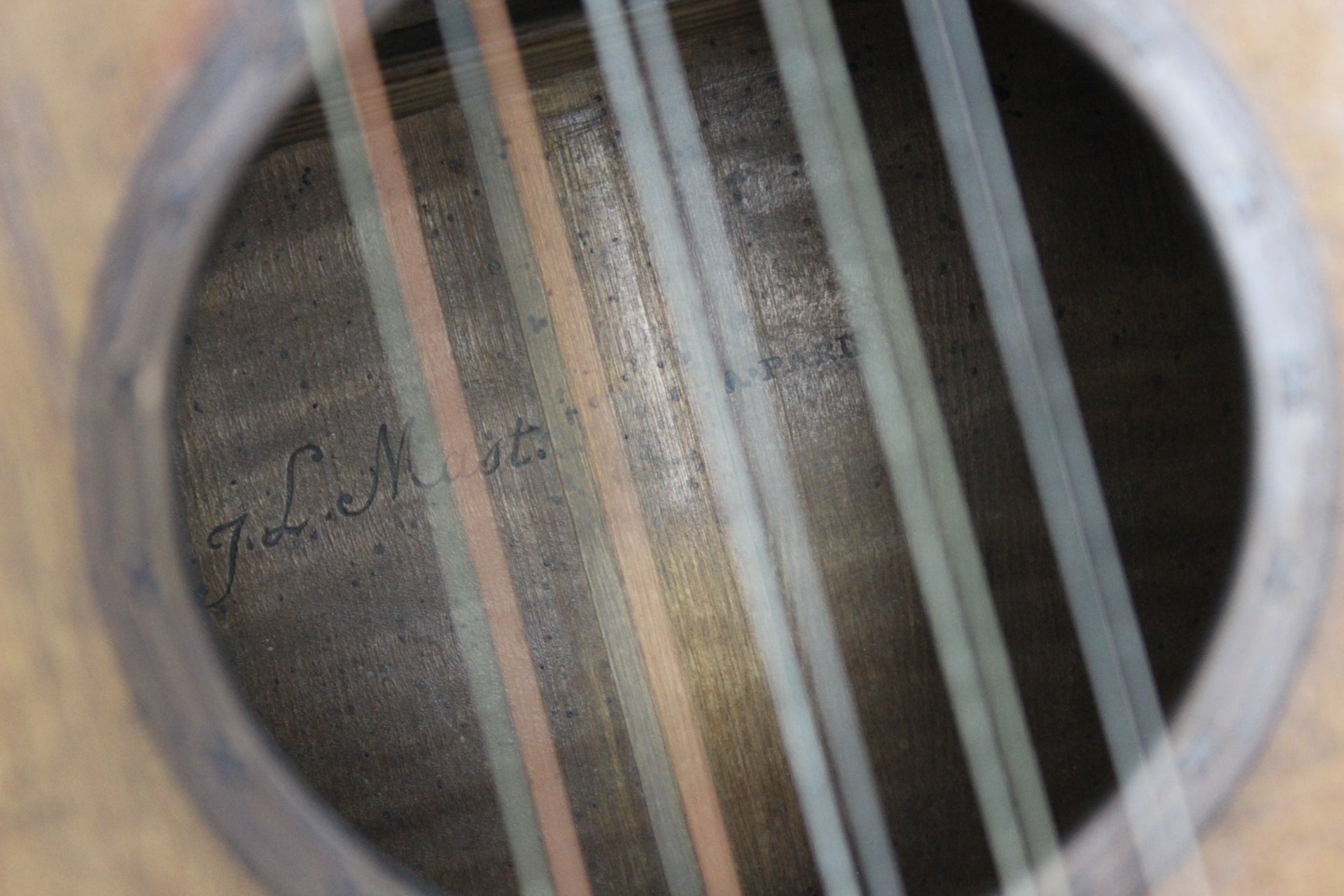Jean Laurent Mast was born in 1748 and died 1791 Mirecourt, France. Although all his work was done in Mirecourt, the output was stamped 'Paris'. The guitar is branded internally with 'J.L. Mast à Paris'. It's in very good condition and has only some minor repairs near the fretboard were a piece was replaced. The top is made of spruce, back and sides are made of maple. A lovely guitar!