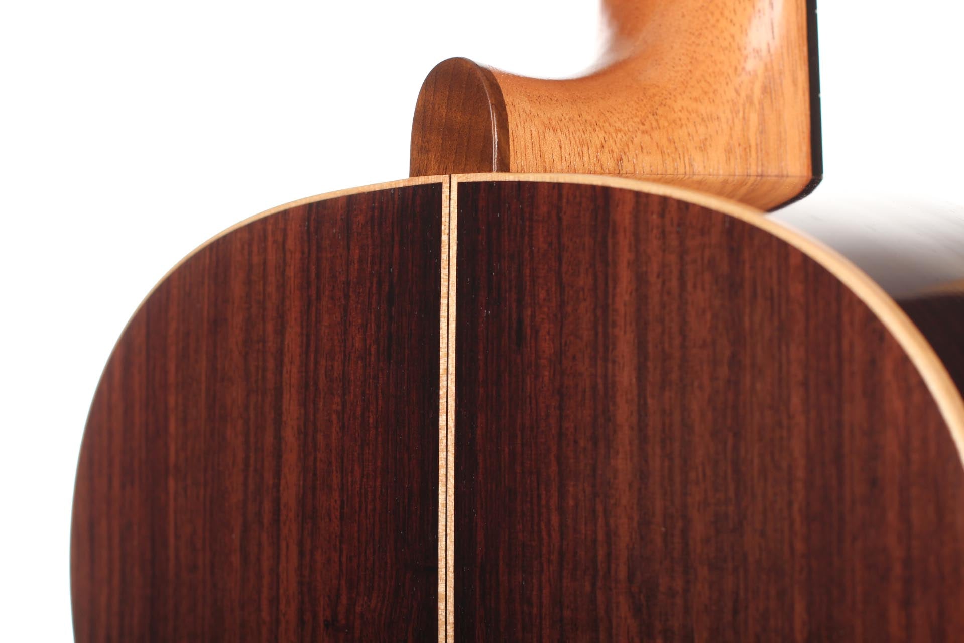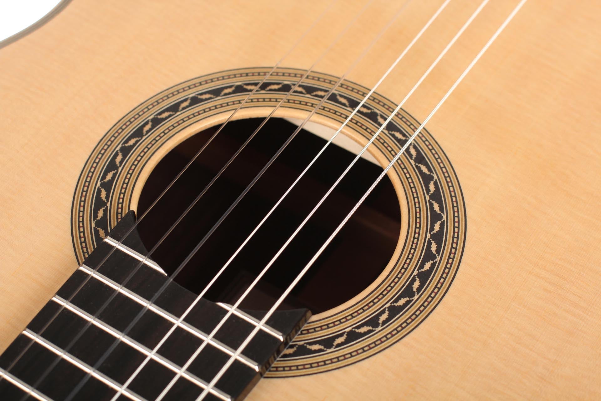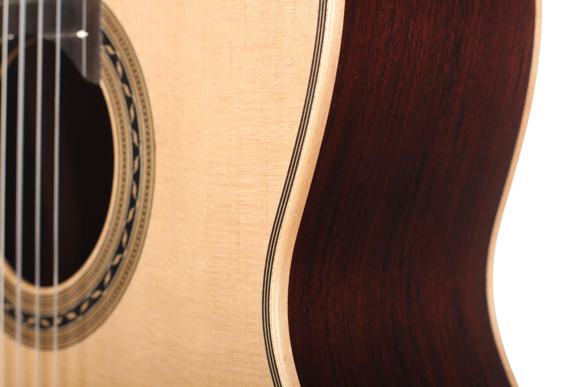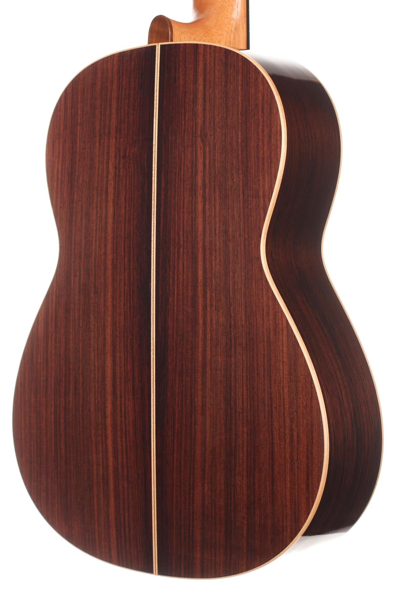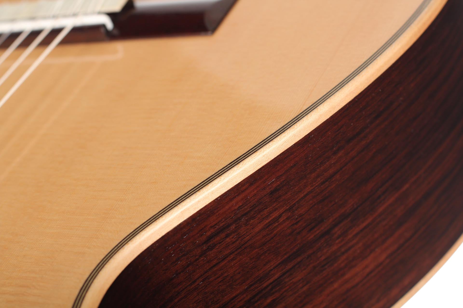 This Model, guitar no. 95, is a classic beauty. The bright spruce top stands in pleasant contrast to the Indian rosewood back and sides and the dark finely worked decorations in binding and the pretty rosette. The gorgeously grained headstock completes this instrument’s precious overall impression. Being very lightly built, the guitar is very responsive and has a balanced and direct sound with warm basses and mids and clear trebles. The tuners are made by Rubner. All French polished. A Hiscox Pro II case is included.