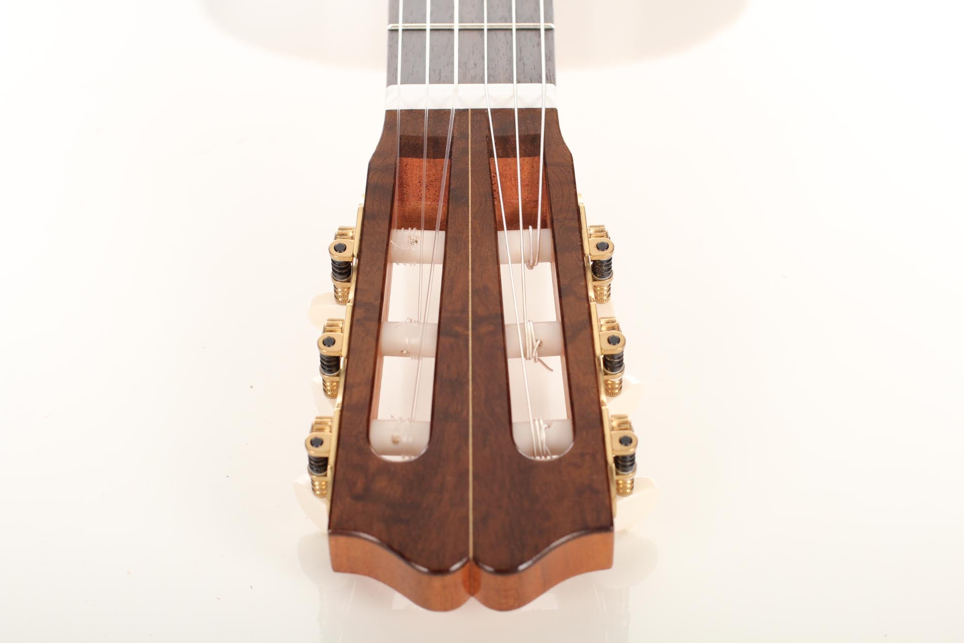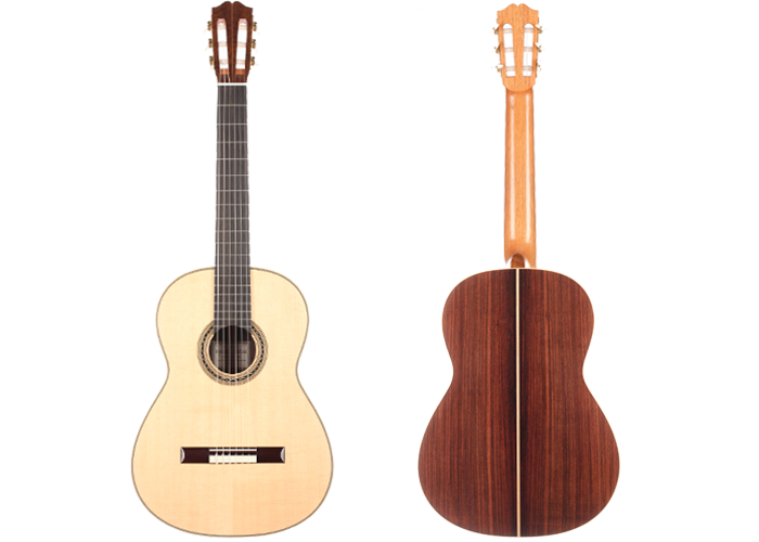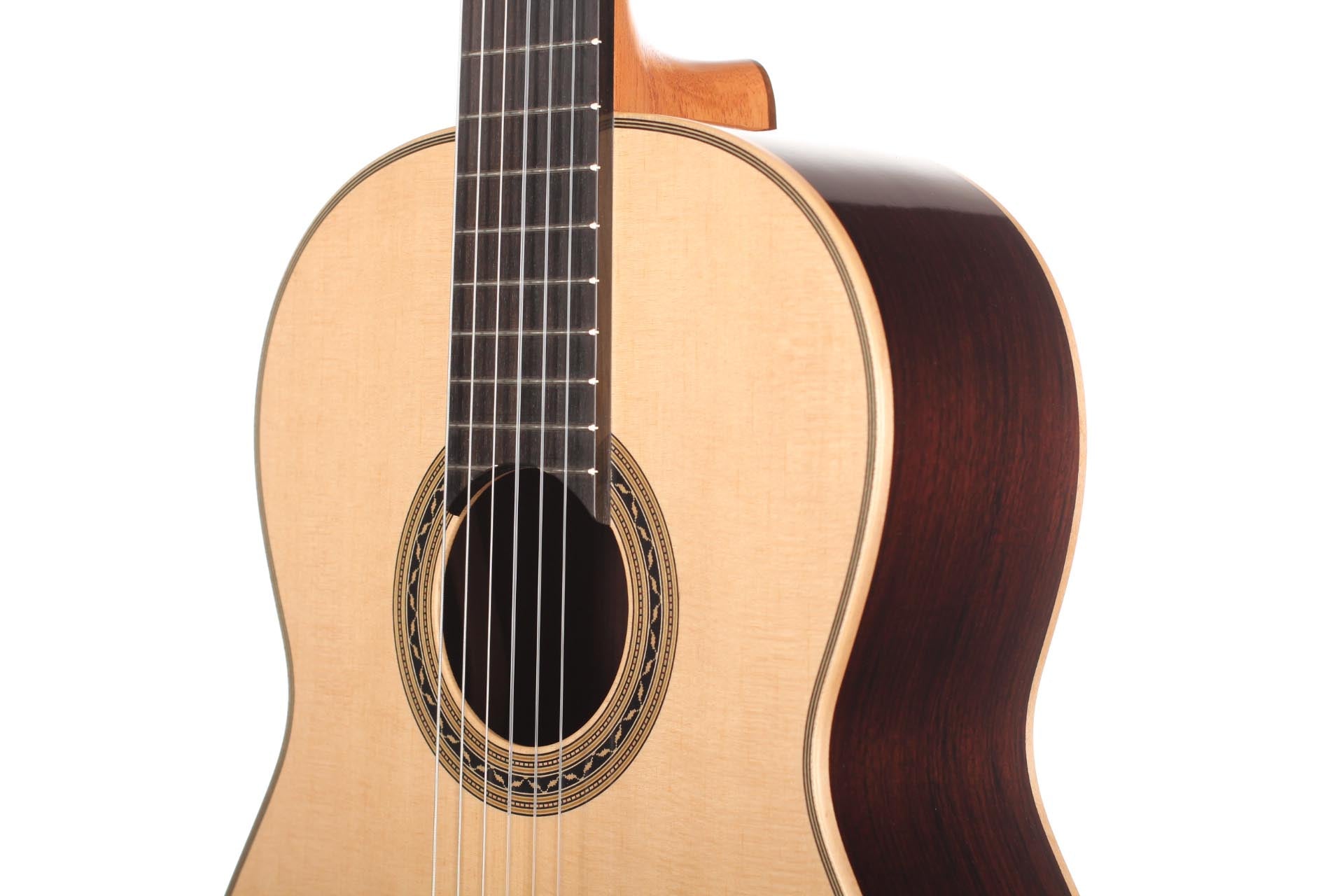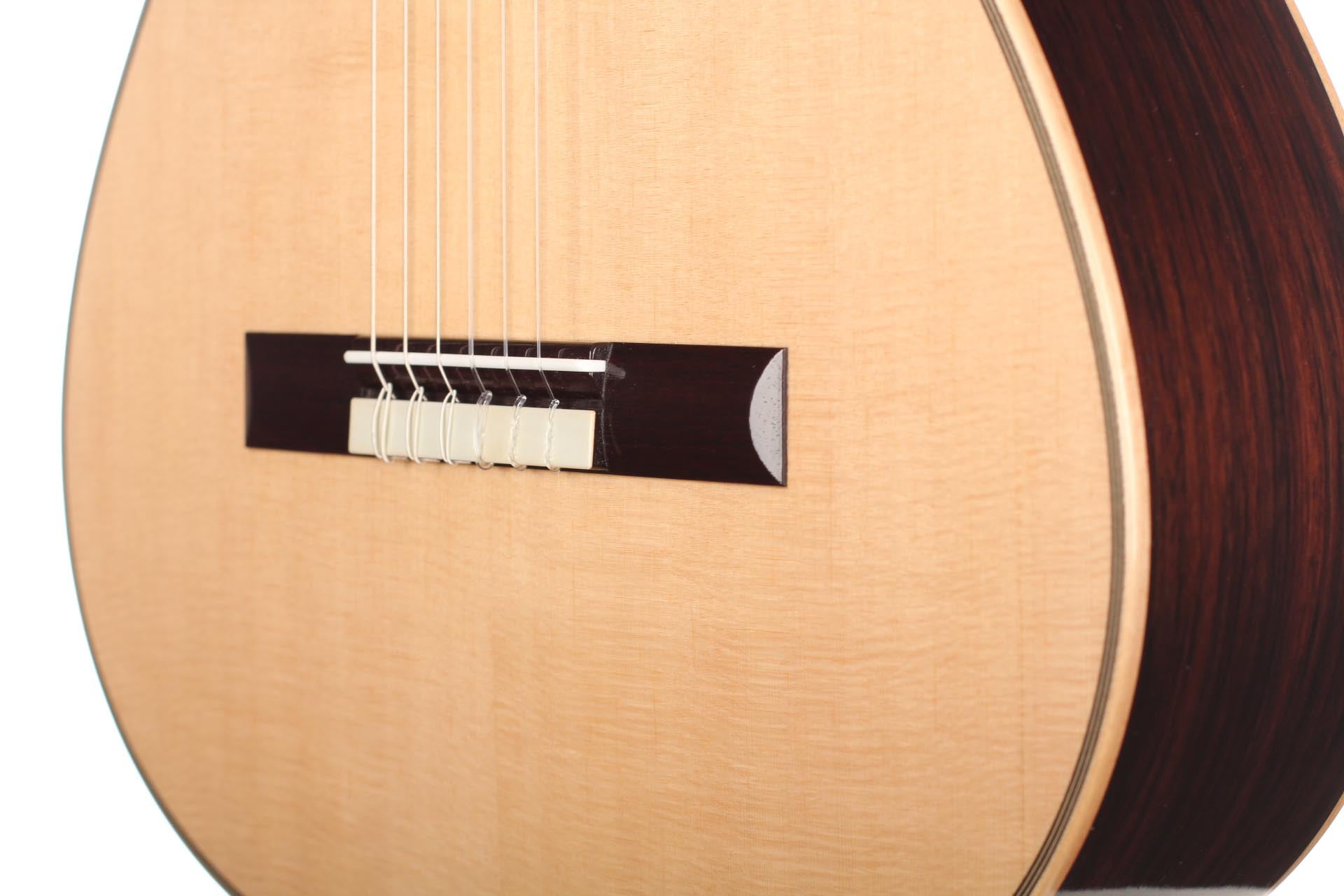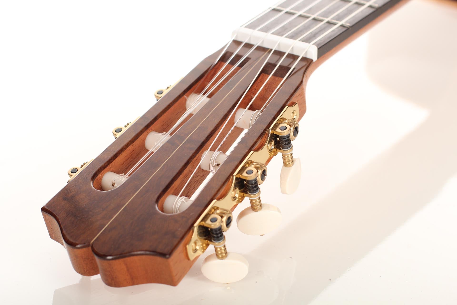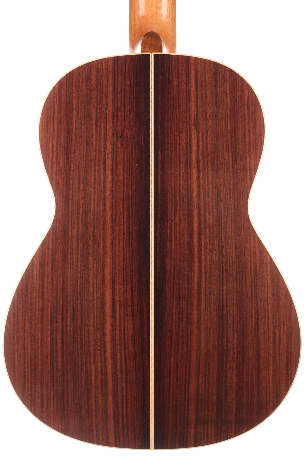 This Model, guitar no. 95, is a classic beauty. The bright spruce top stands in pleasant contrast to the Indian rosewood back and sides and the dark finely worked decorations in binding and the pretty rosette. The gorgeously grained headstock completes this instrument’s precious overall impression. Being very lightly built, the guitar is very responsive and has a balanced and direct sound with warm basses and mids and clear trebles. The tuners are made by Rubner. All French polished. A Hiscox Pro II case is included.