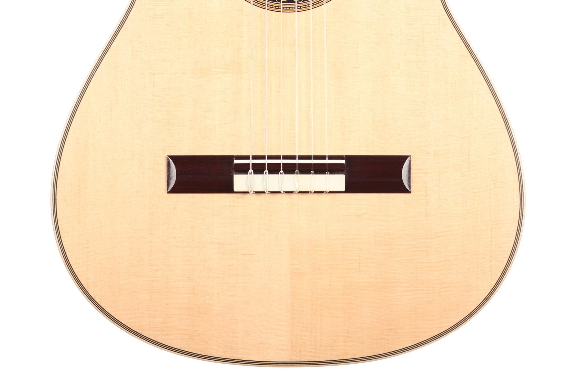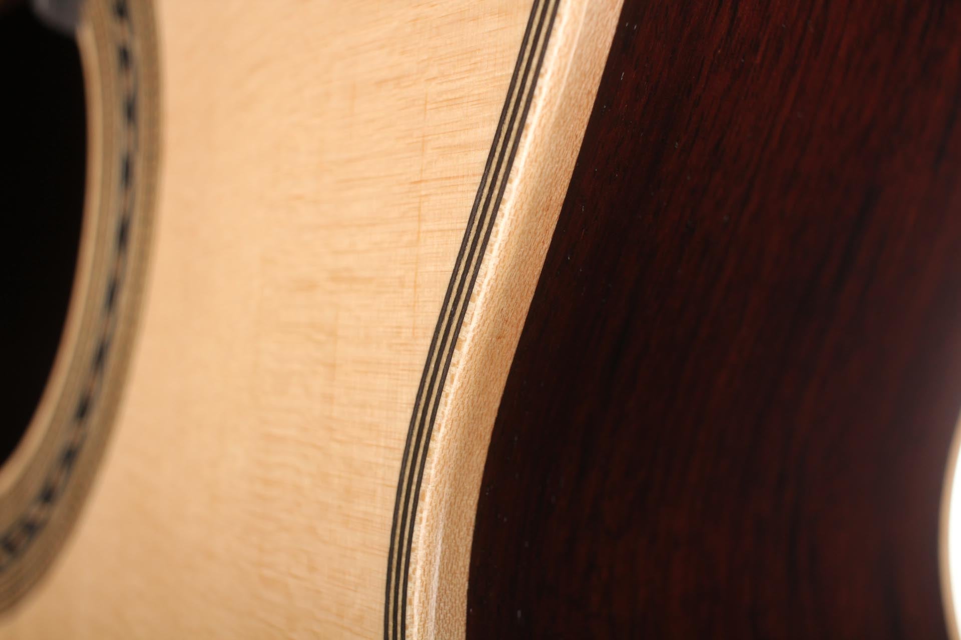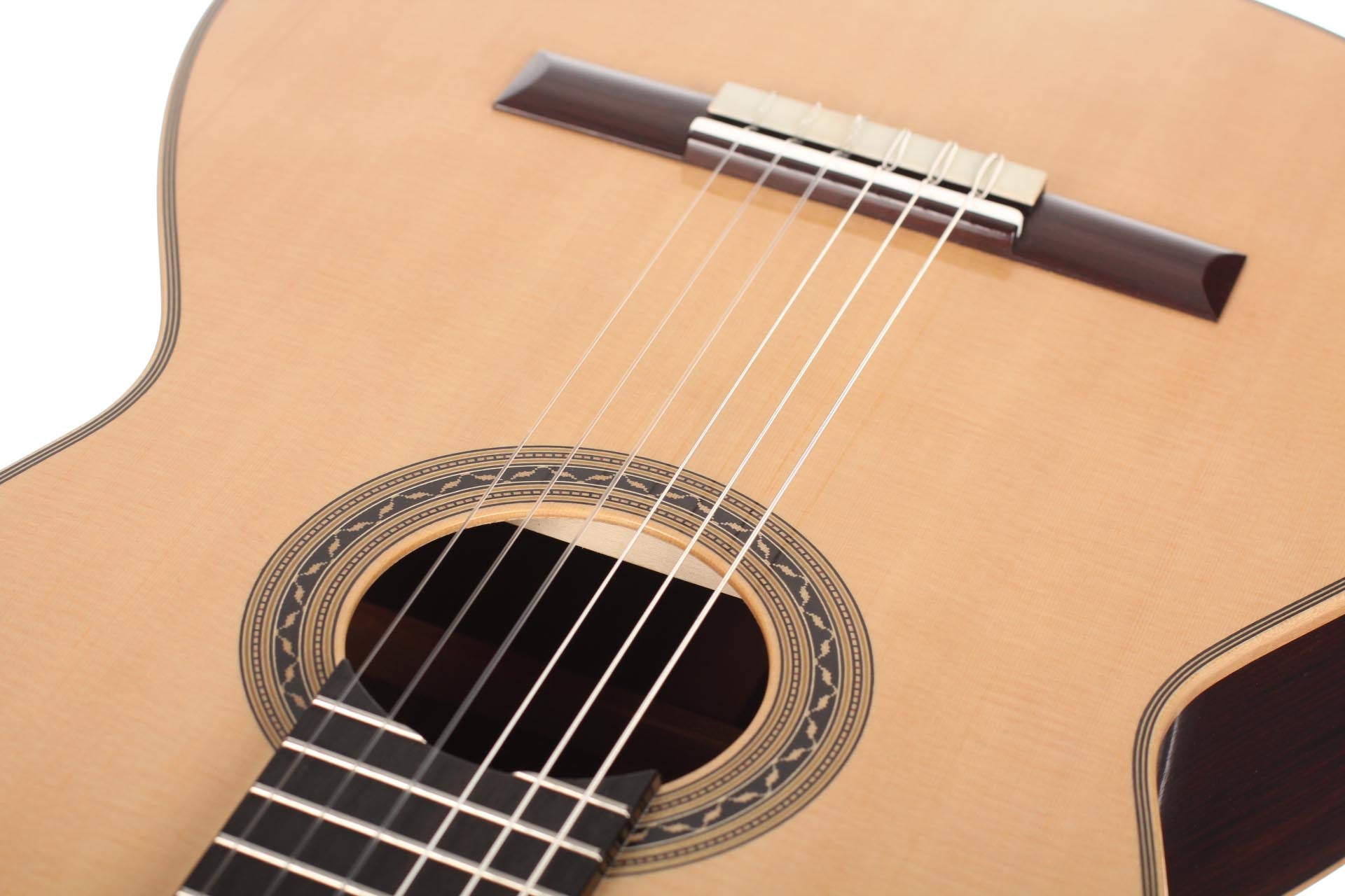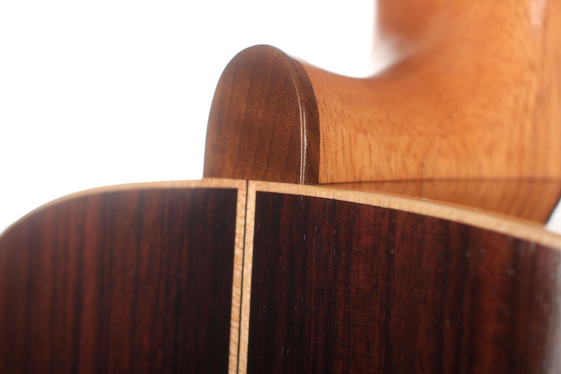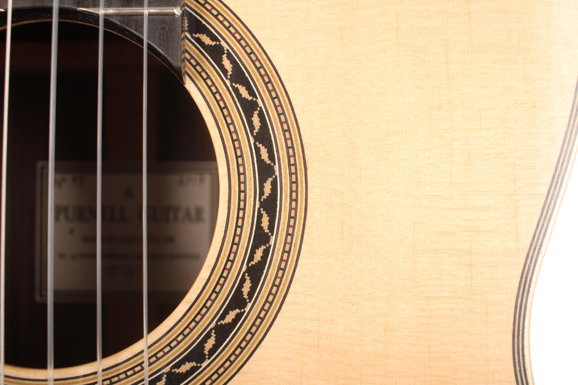 This Model, guitar no. 95, is a classic beauty. The bright spruce top stands in pleasant contrast to the Indian rosewood back and sides and the dark finely worked decorations in binding and the pretty rosette. The gorgeously grained headstock completes this instrument’s precious overall impression. Being very lightly built, the guitar is very responsive and has a balanced and direct sound with warm basses and mids and clear trebles. The tuners are made by Rubner. All French polished. A Hiscox Pro II case is included.
