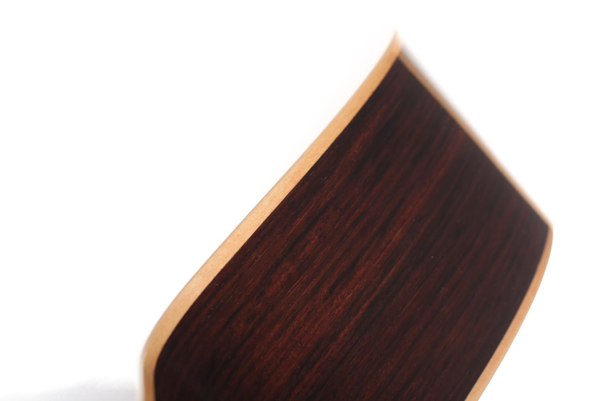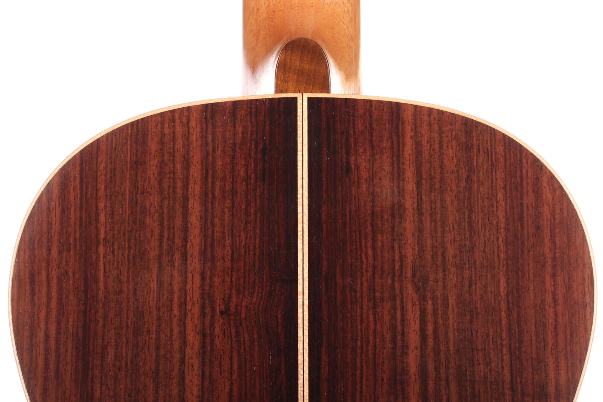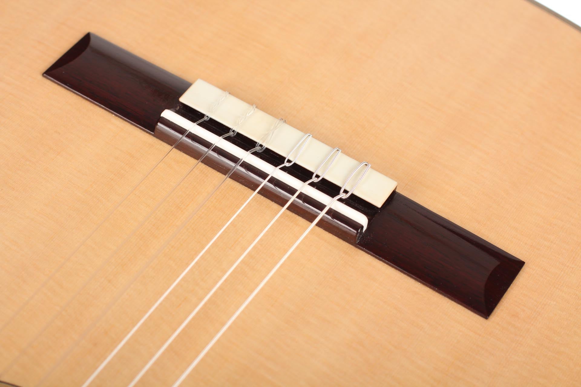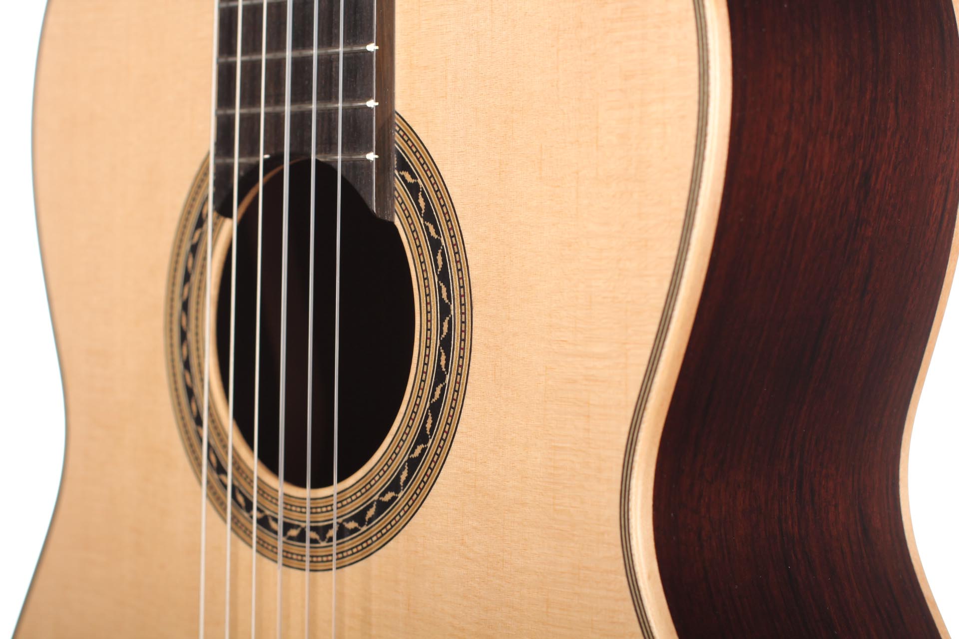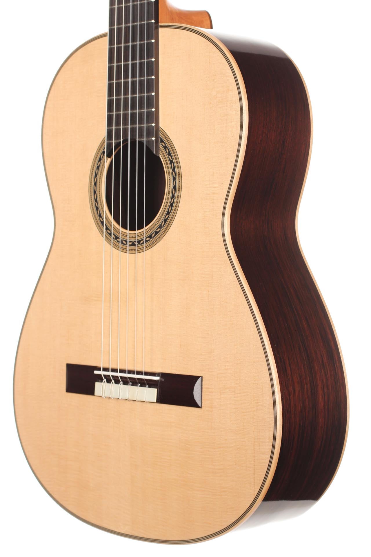 This Model, guitar no. 95, is a classic beauty. The bright spruce top stands in pleasant contrast to the Indian rosewood back and sides and the dark finely worked decorations in binding and the pretty rosette. The gorgeously grained headstock completes this instrument’s precious overall impression. Being very lightly built, the guitar is very responsive and has a balanced and direct sound with warm basses and mids and clear trebles. The tuners are made by Rubner. All French polished. A Hiscox Pro II case is included.
