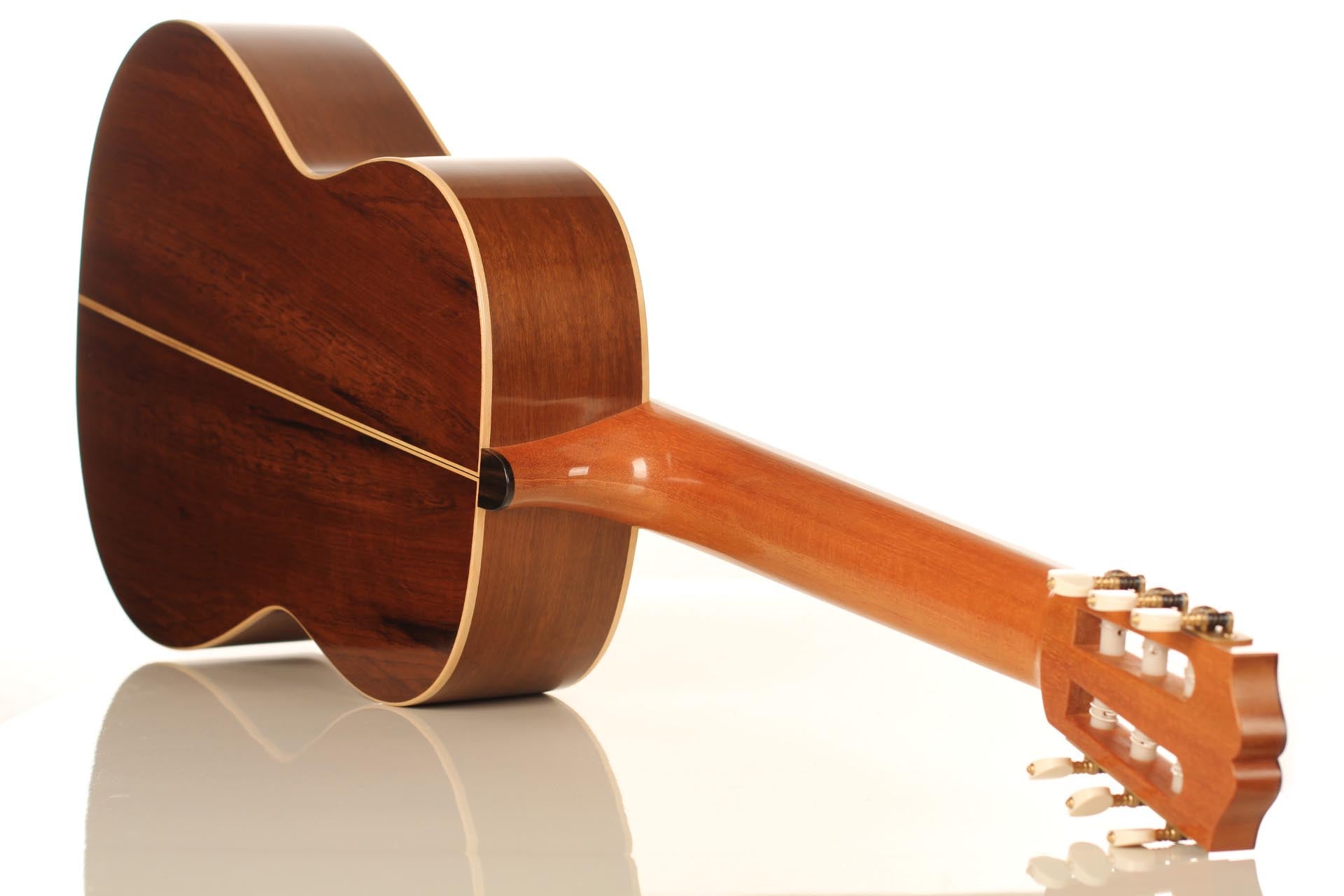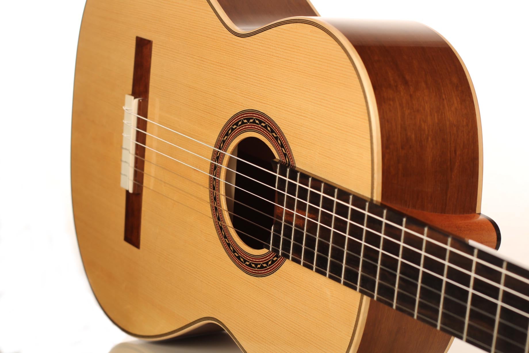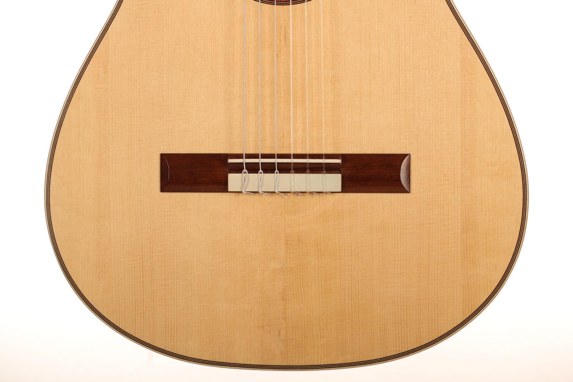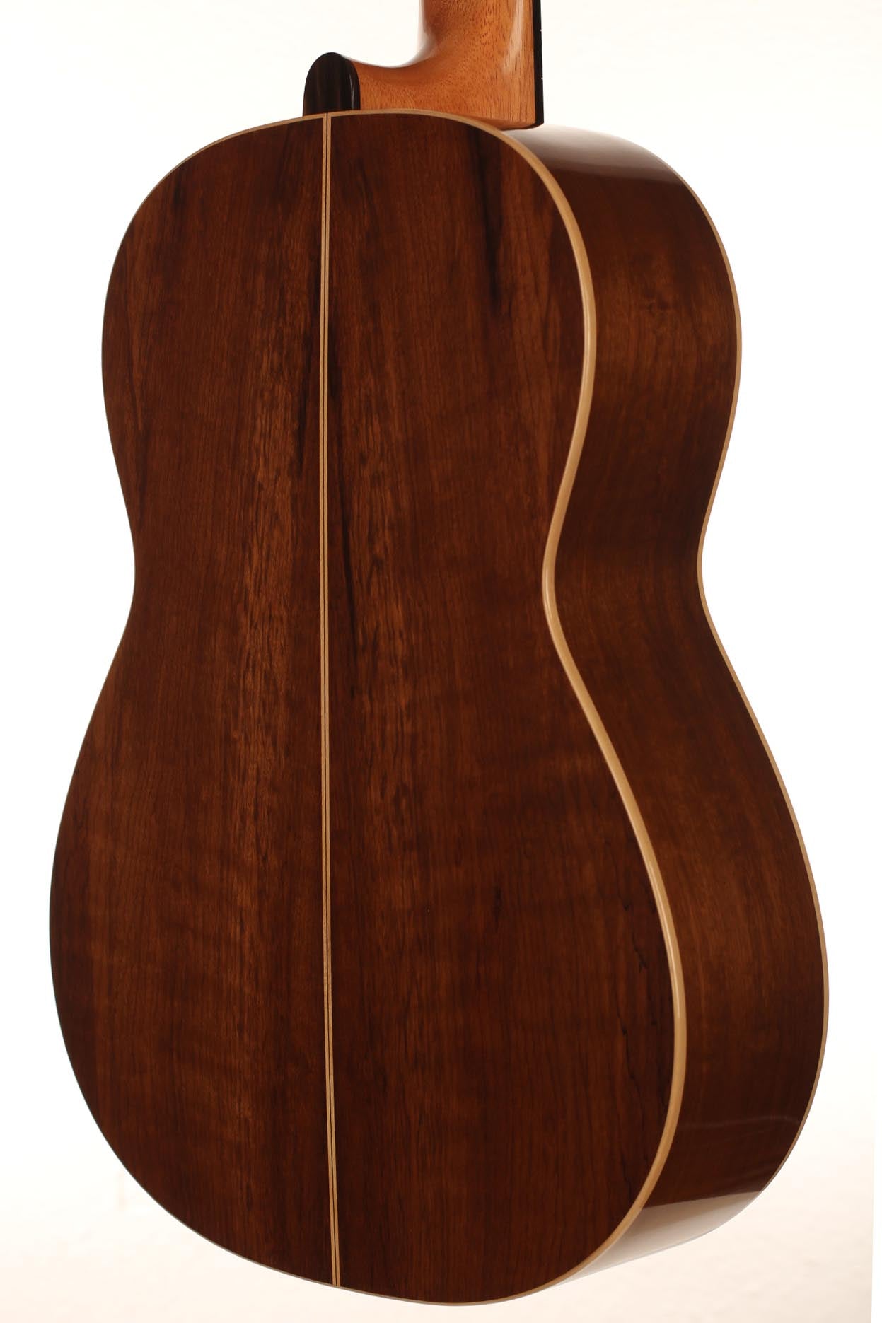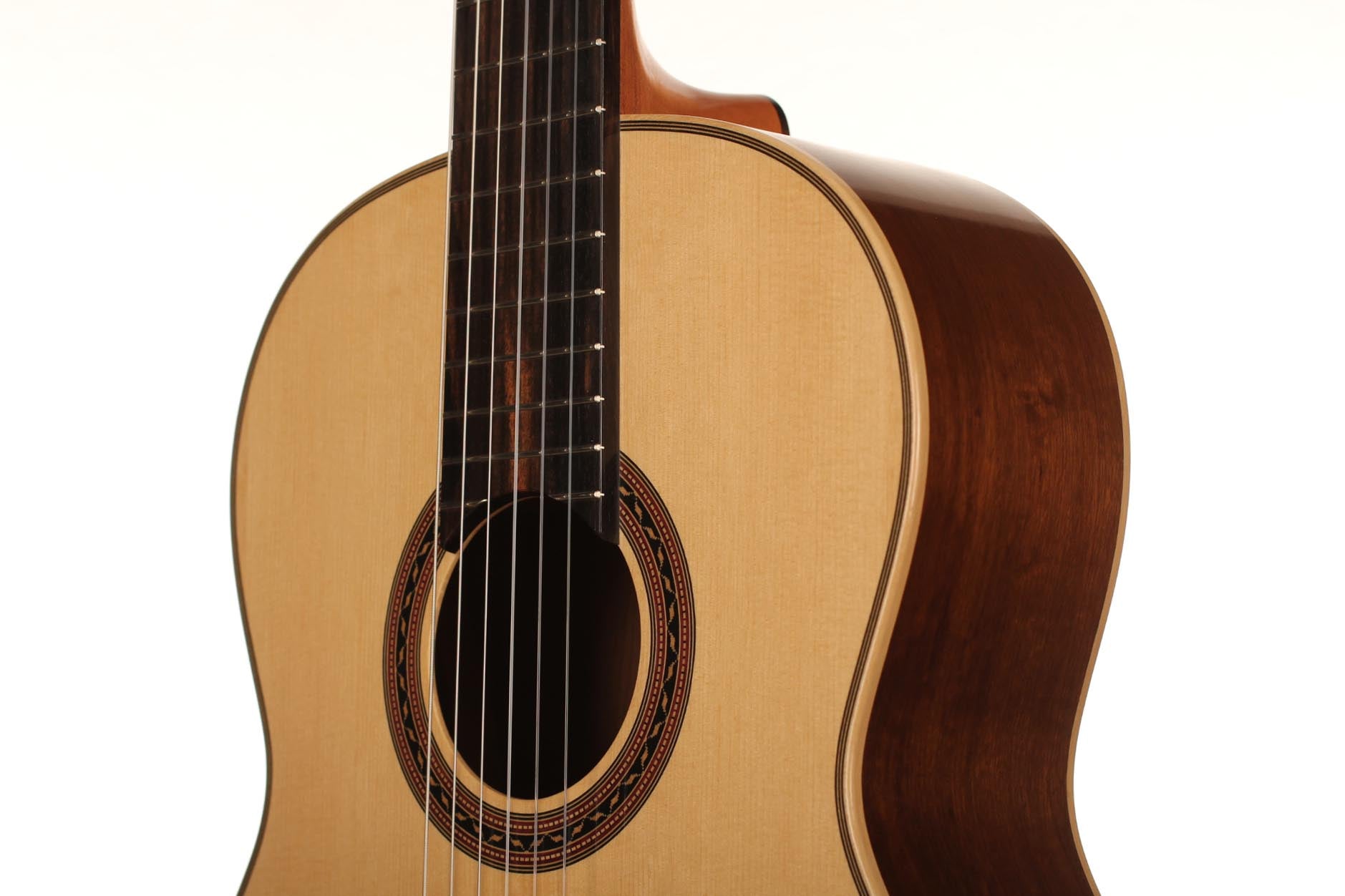 This guitar, no. 98, is entirely CITES-free and built with highly resonant not-endangered woods. This gorgeous instrument was built in a pure classic style and so is its sound. It has clear pearly trebles, with an incredible distinction of the tones, and old seductive basses. It is a very light and responsive guitar with a lot of charm. All French polished. A Hiscox Pro II case is included.