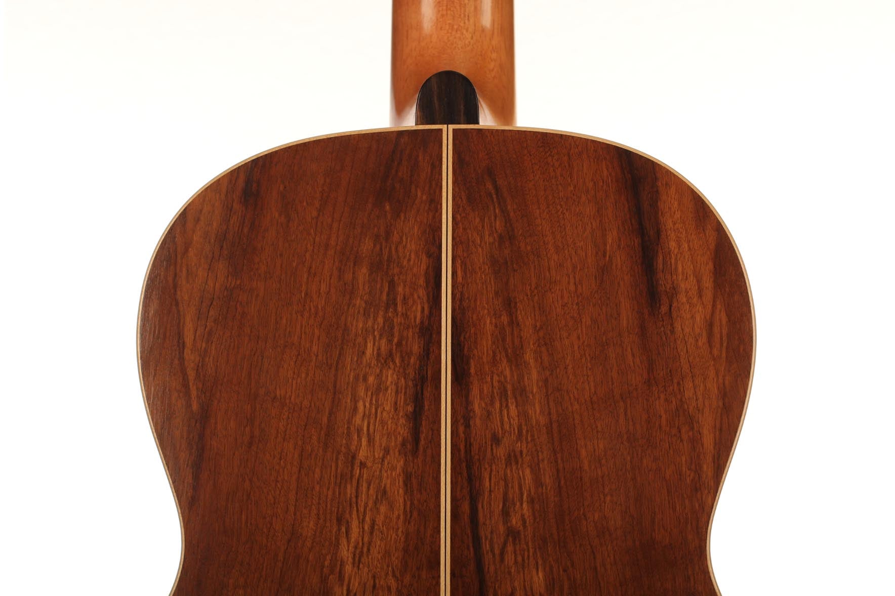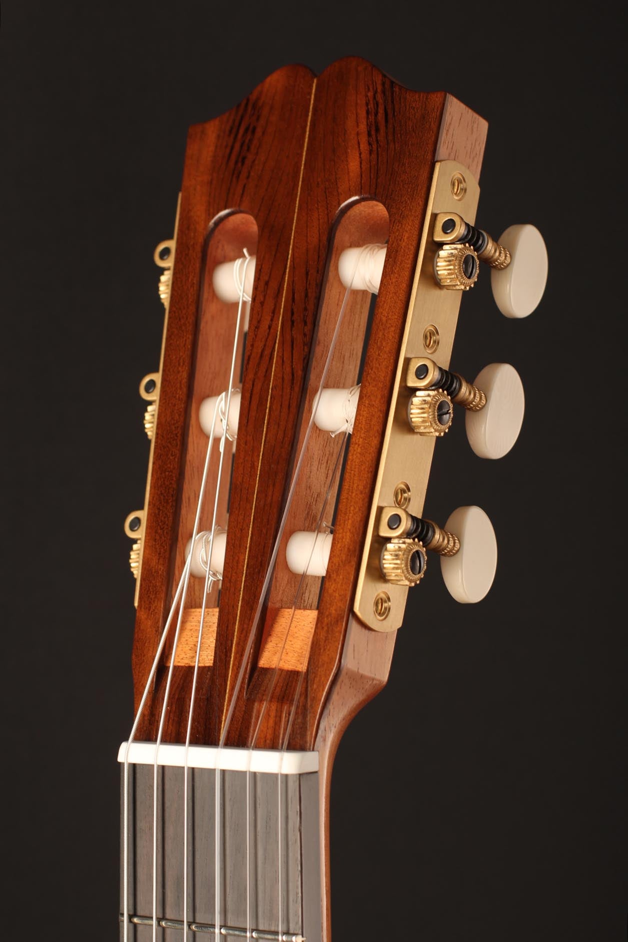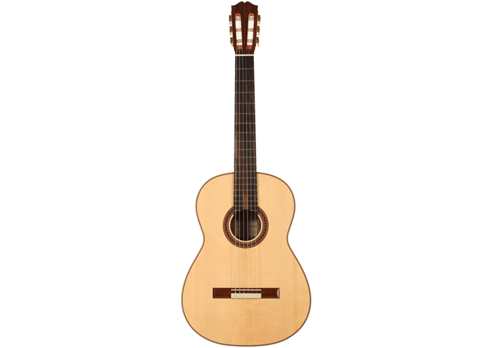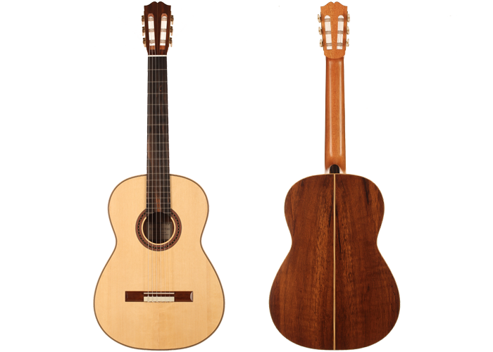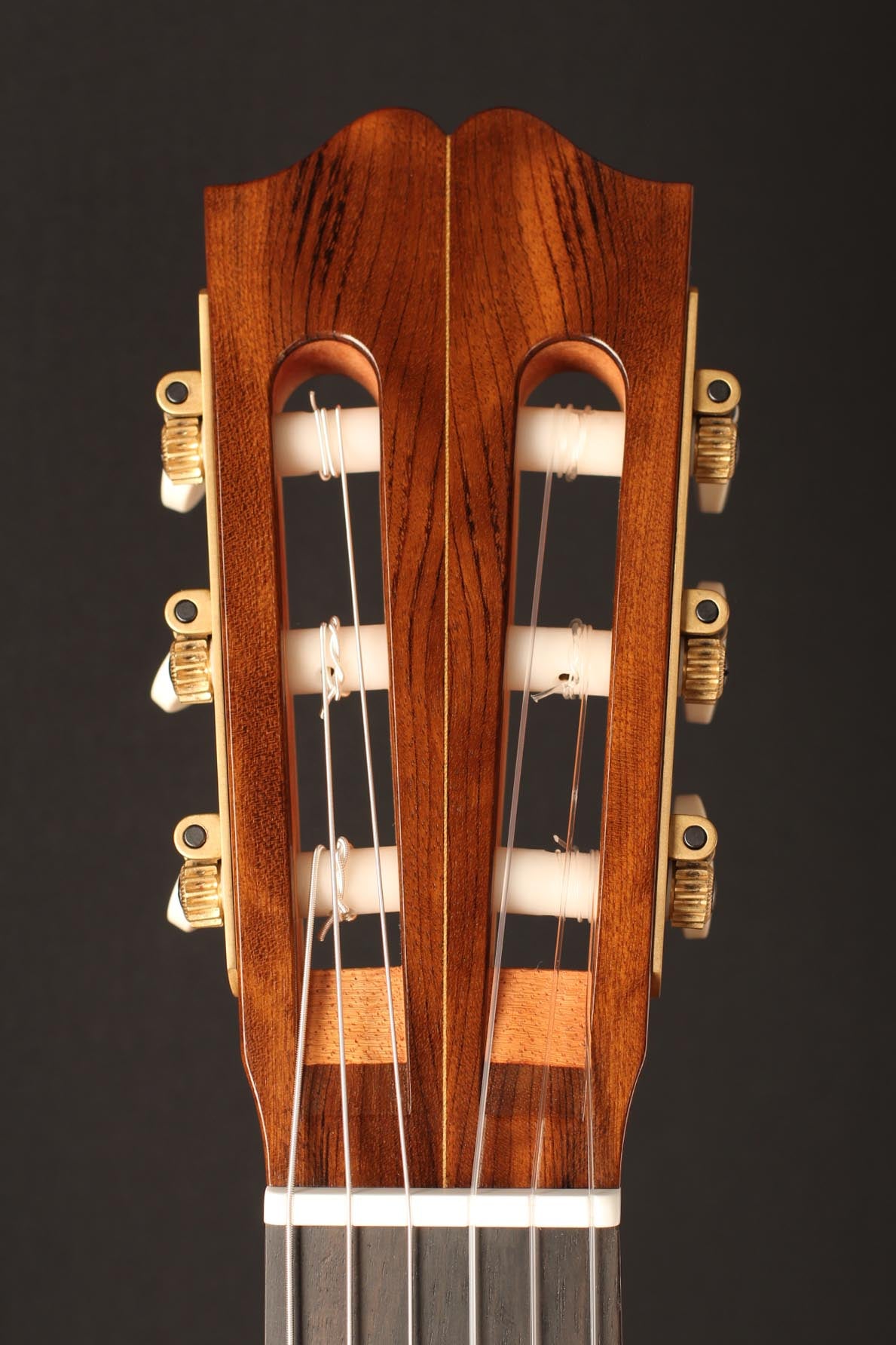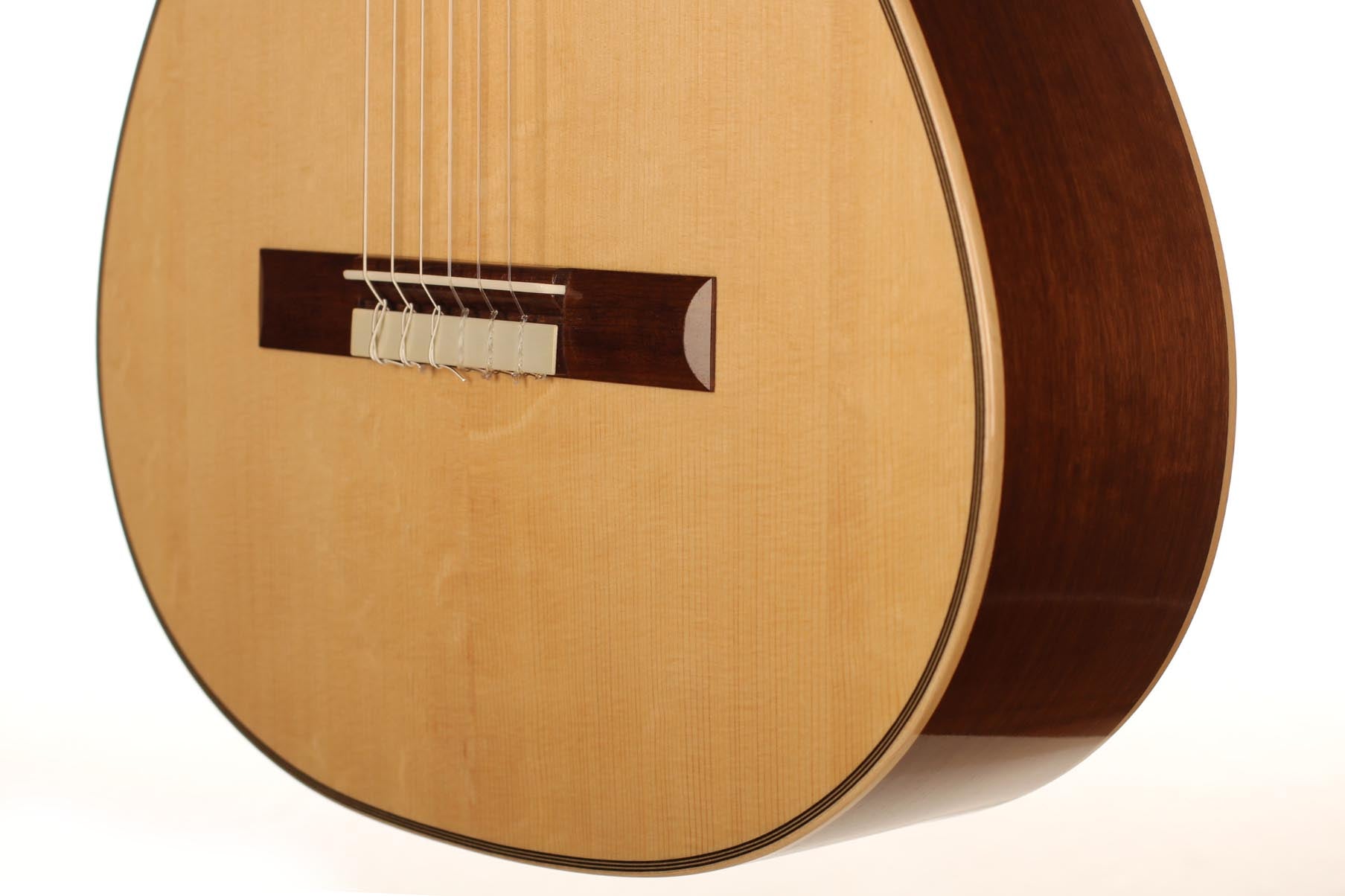 This guitar, no. 98, is entirely CITES-free and built with highly resonant not-endangered woods. This gorgeous instrument was built in a pure classic style and so is its sound. It has clear pearly trebles, with an incredible distinction of the tones, and old seductive basses. It is a very light and responsive guitar with a lot of charm. All French polished. A Hiscox Pro II case is included.