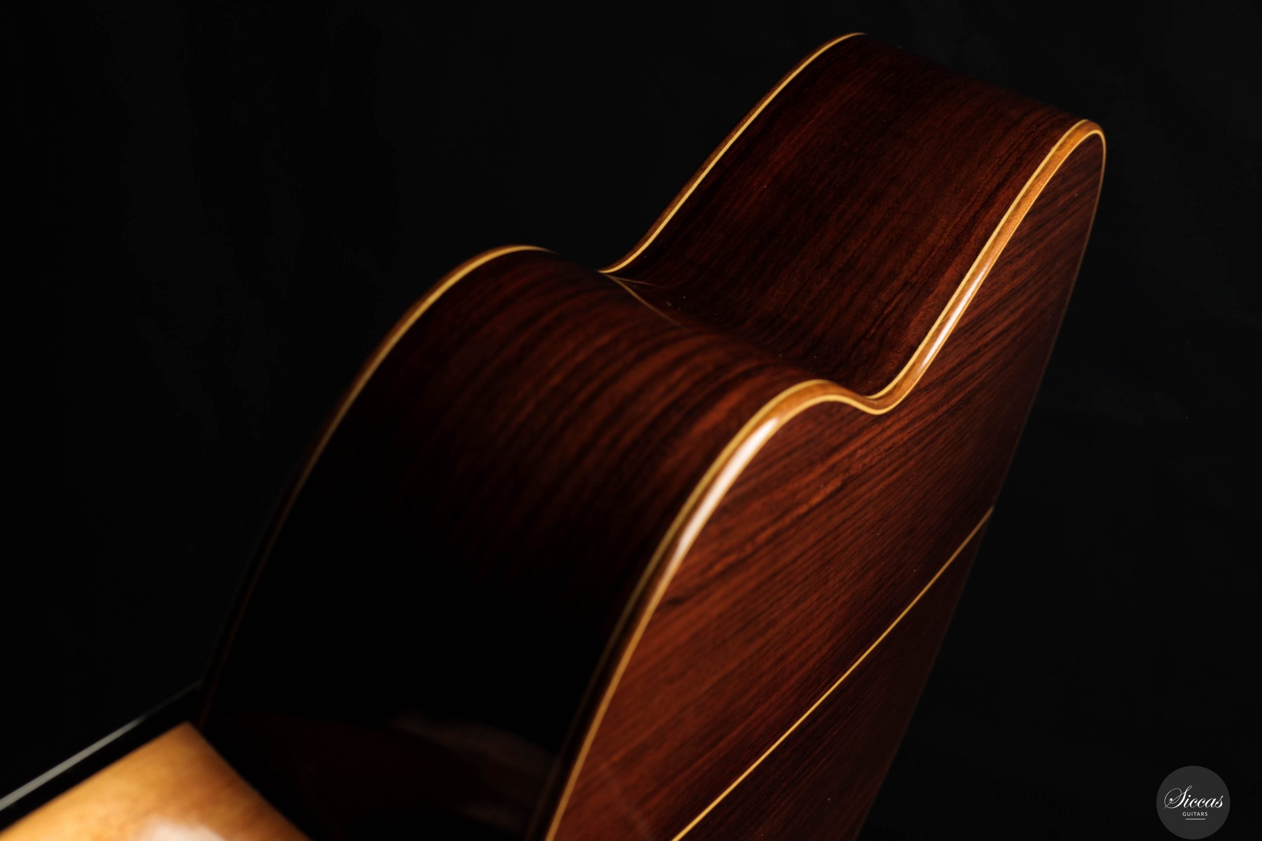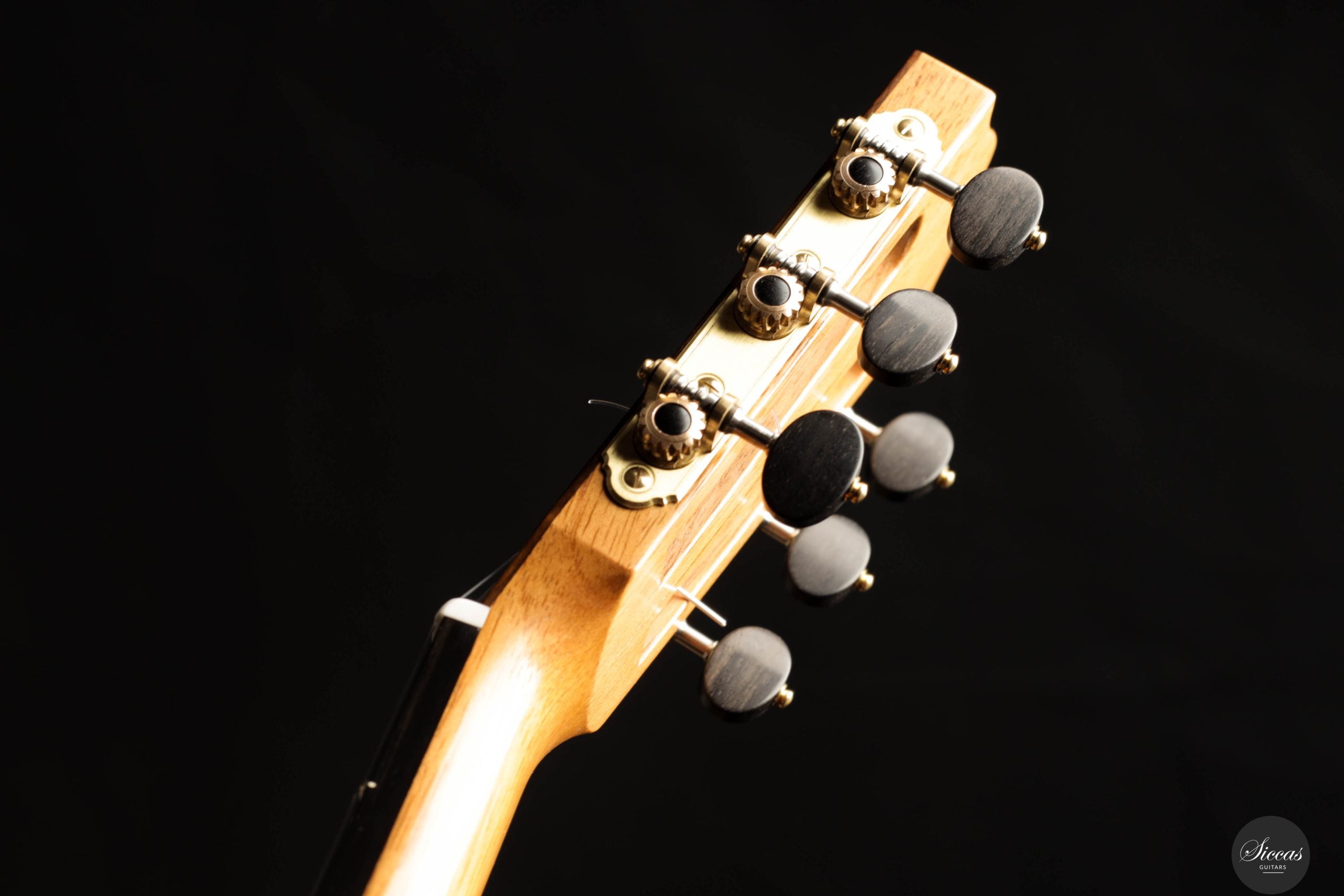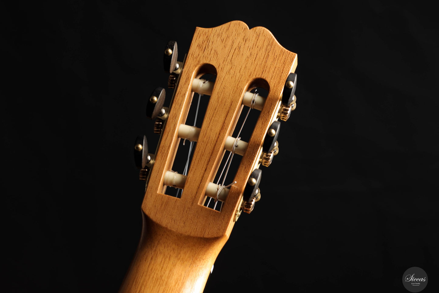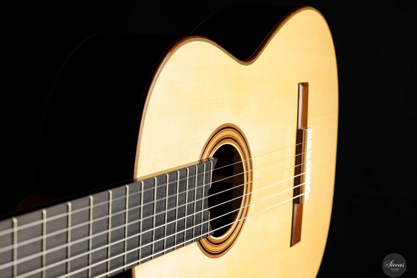 Acoustically, this guitar offers a very focused and clear tone, giving the player excellent articulation and precision. Thanks to its lightweight construction, weighing only about 1,370 grams including the tuning machines, it also provides a remarkable sense of control and responsiveness.