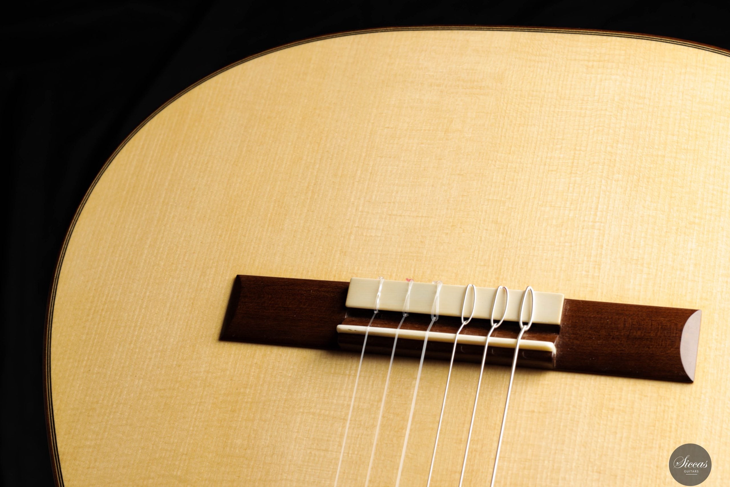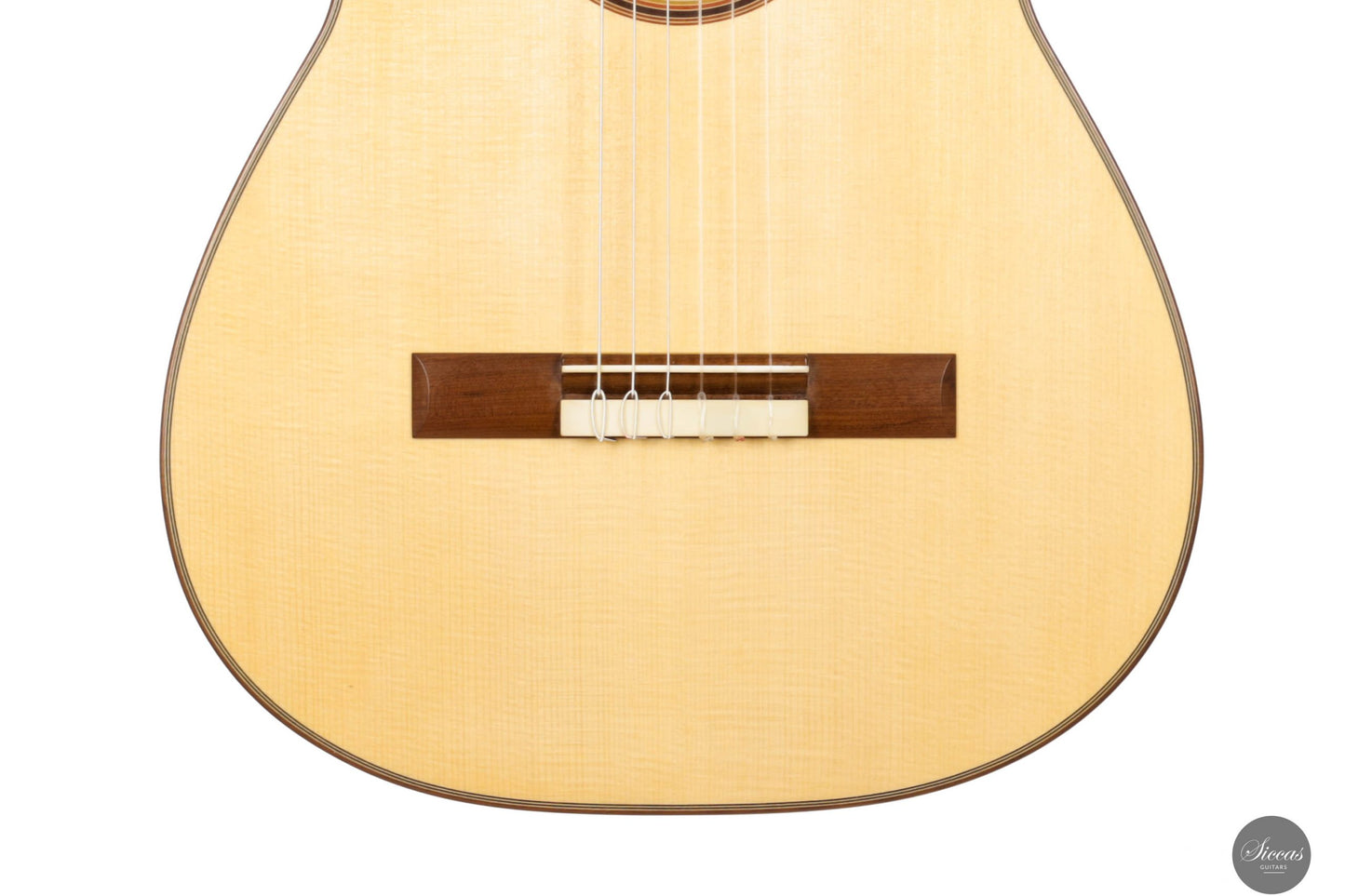 The spruce soundboard is reinforced with a traditional bracing system, consisting of three thin, almost parallel wide struts and four transverse struts located towards the lower bout—two on the bass side and two on the treble side.