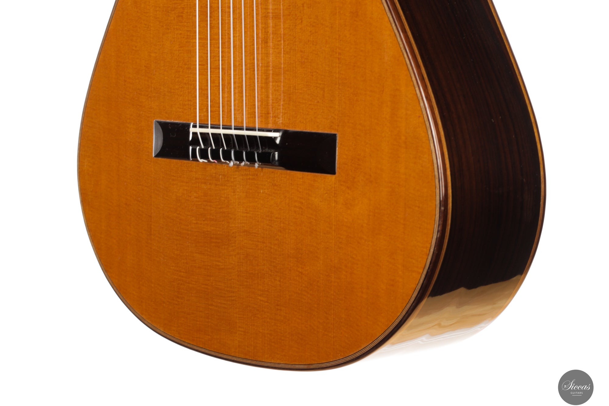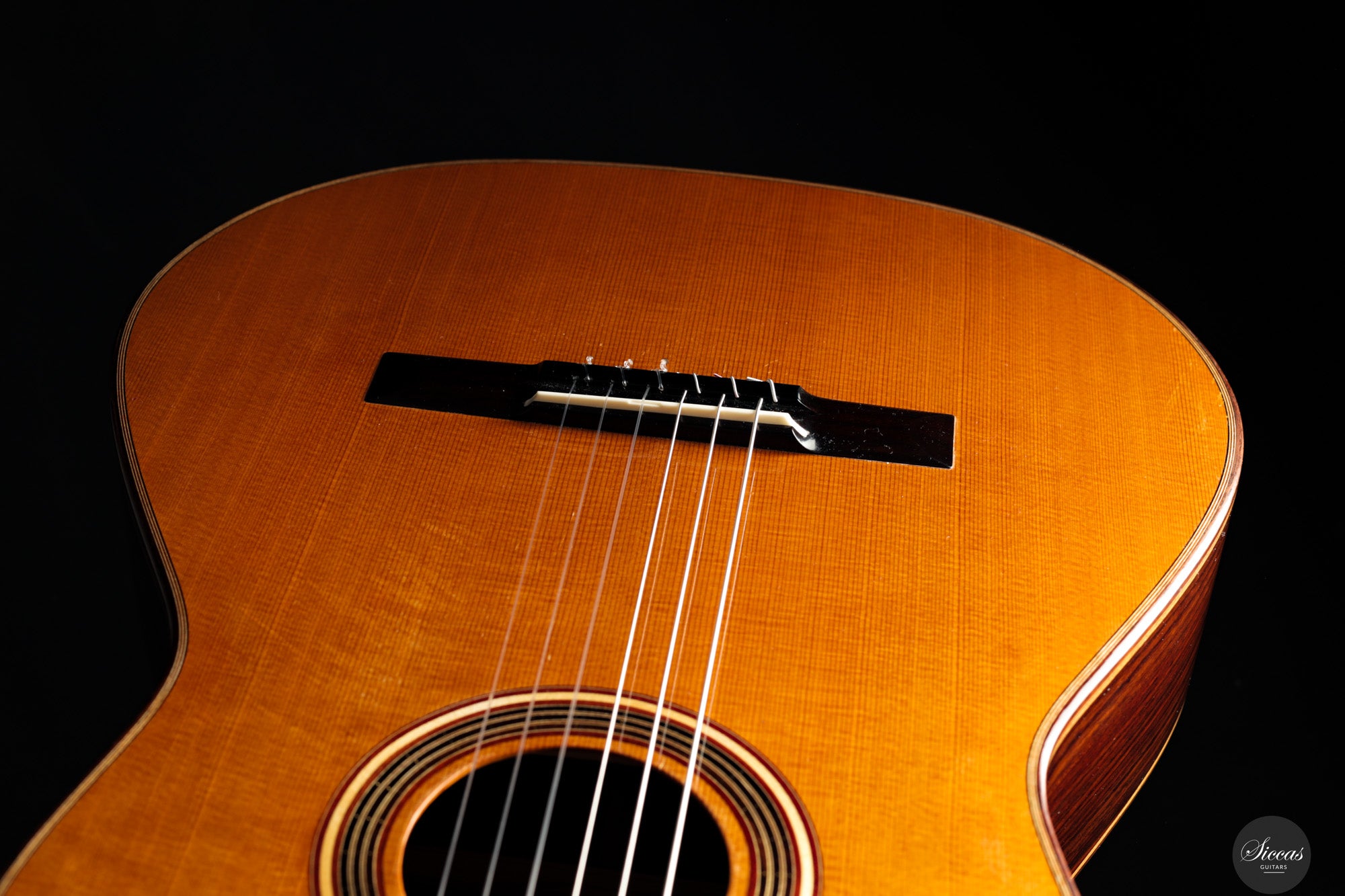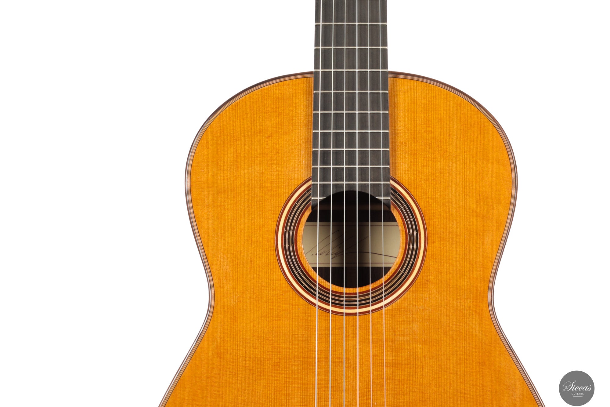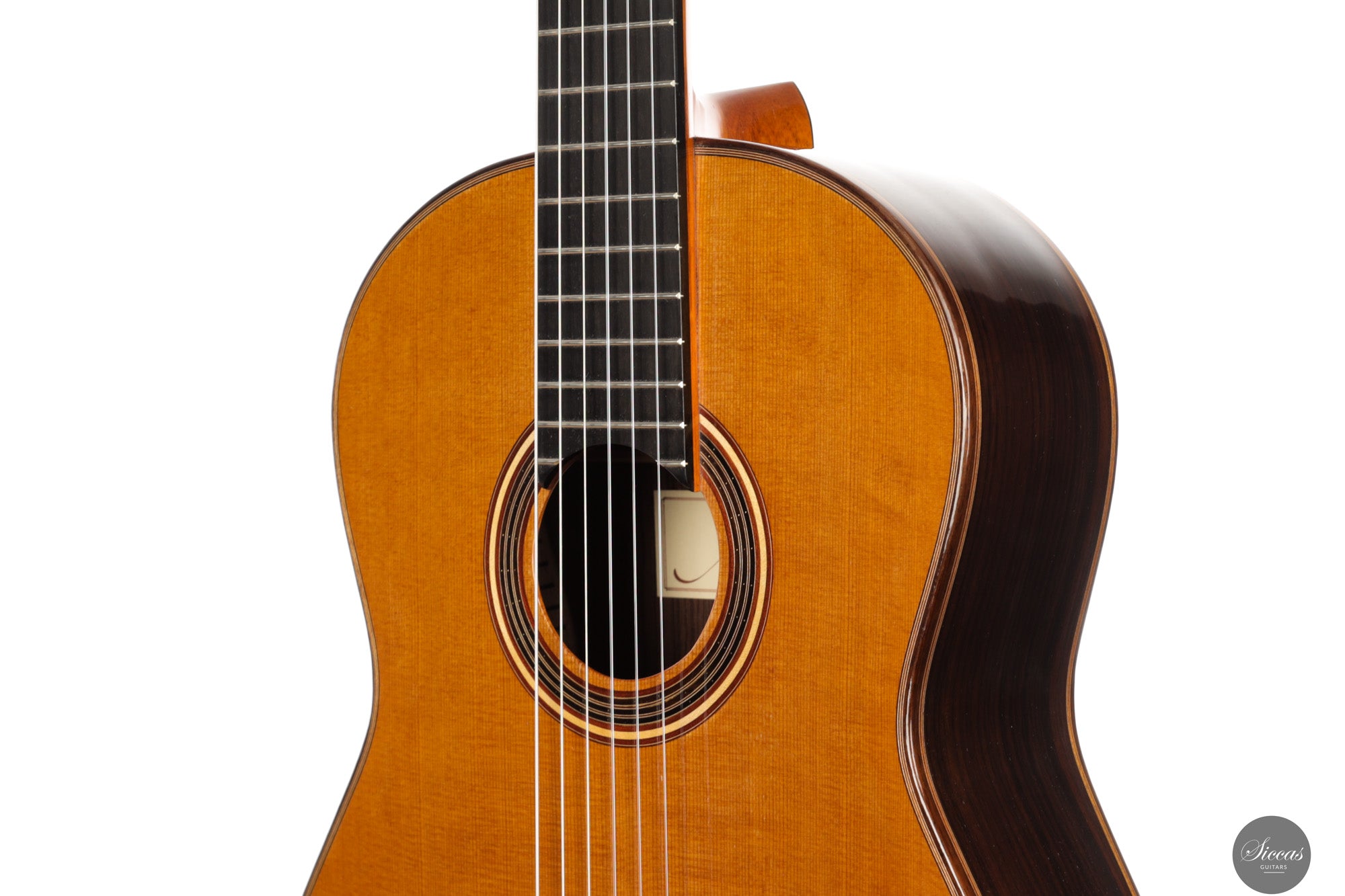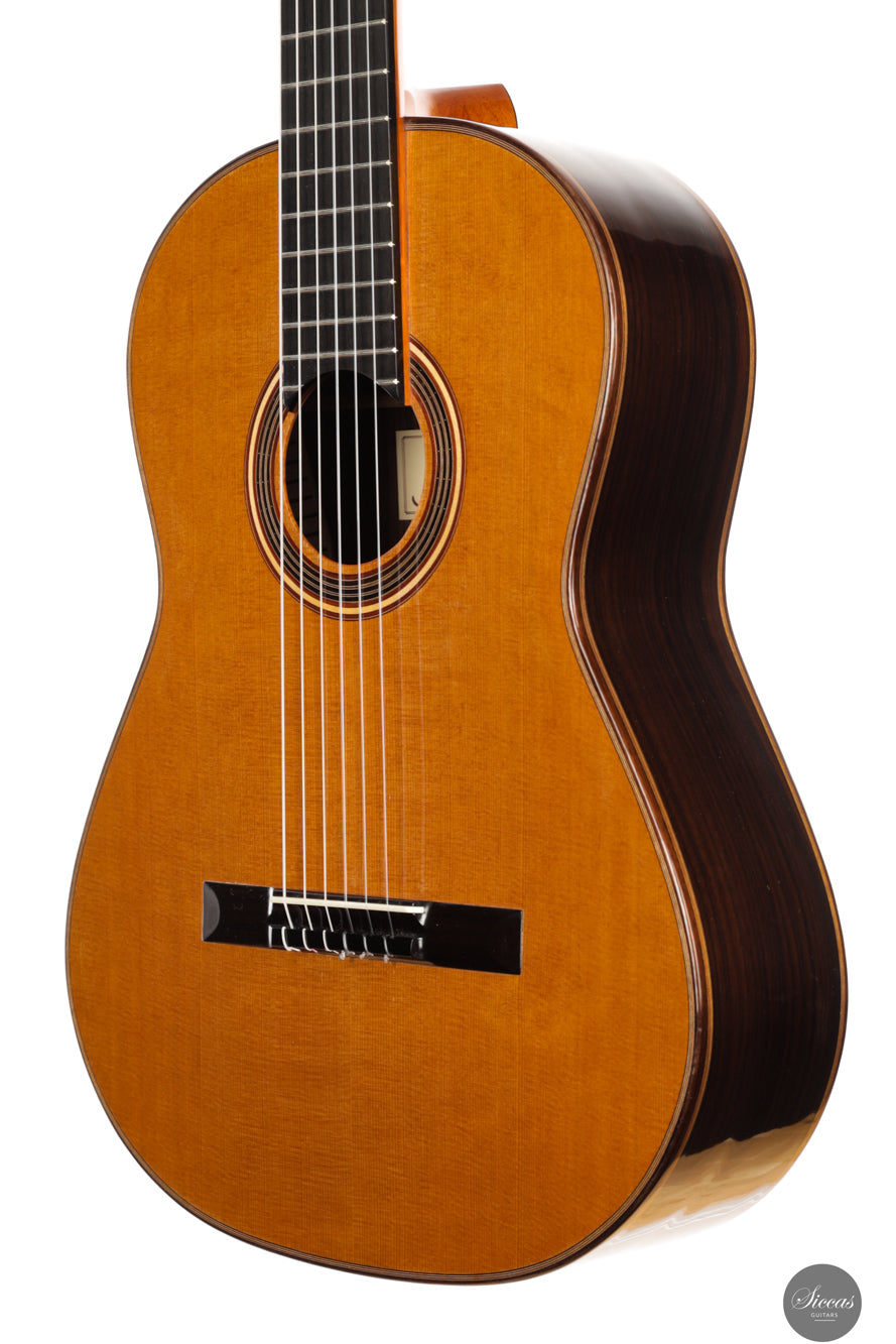 A lightweight 2017 double top by Jakob Lebisch with cedar top and Indian rosewood that offers enormous power fast response and impressive projection. The tone remains clear and balanced even under pressure and the guitar feels immediately ready for concert use.