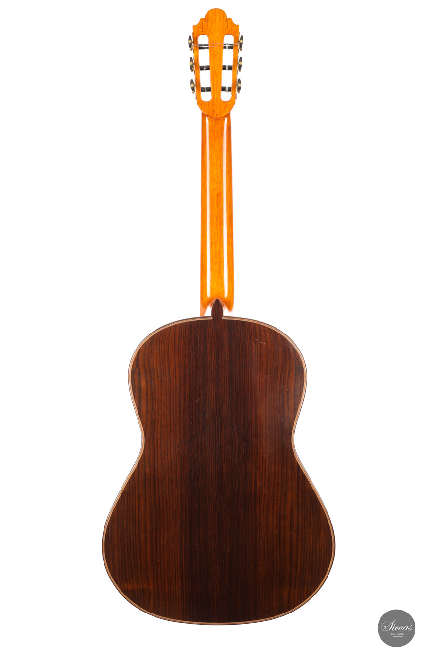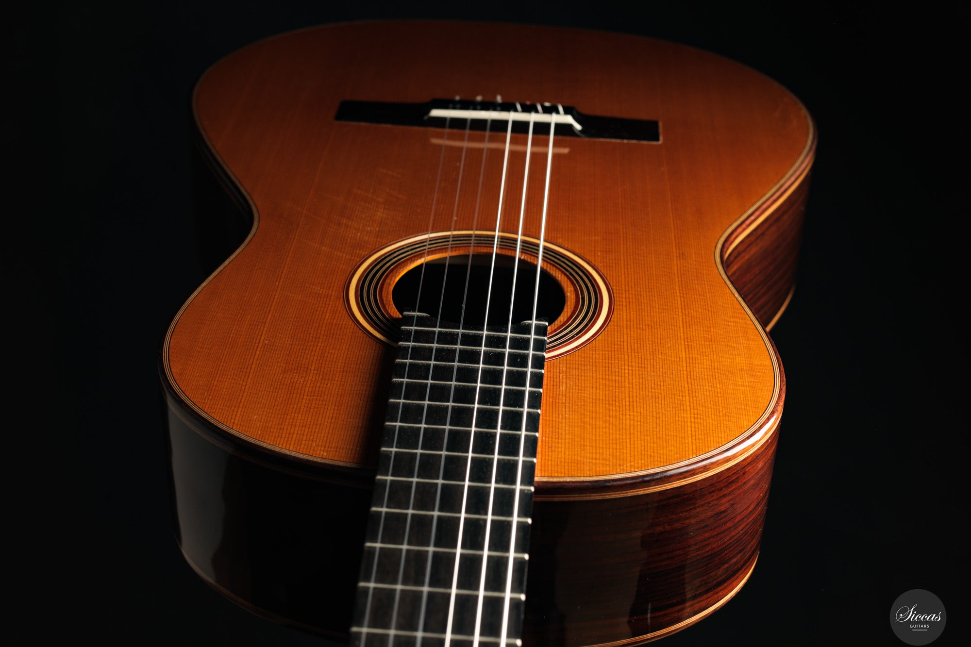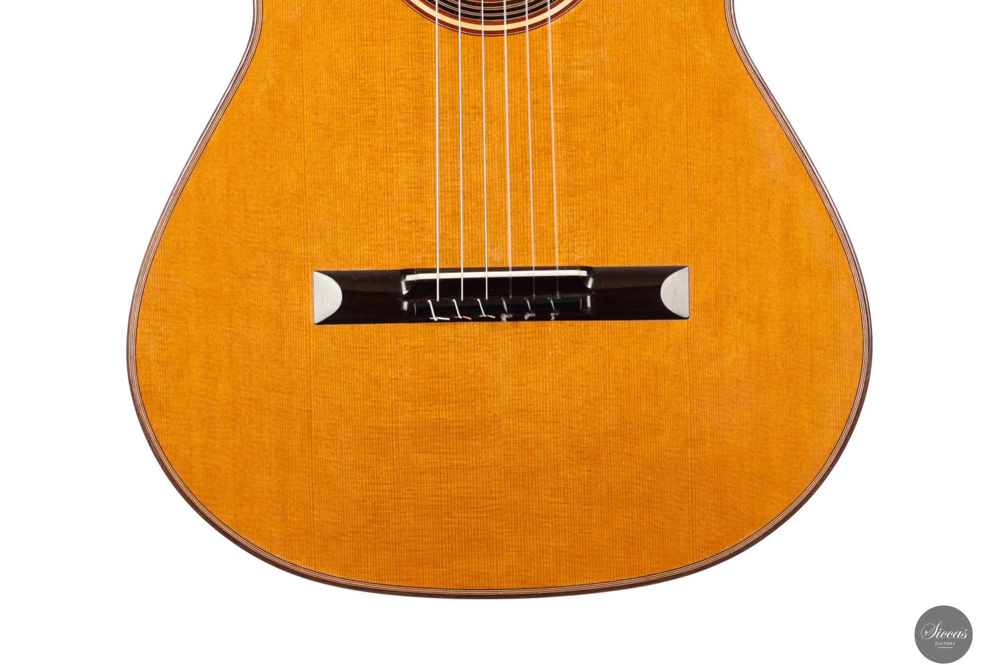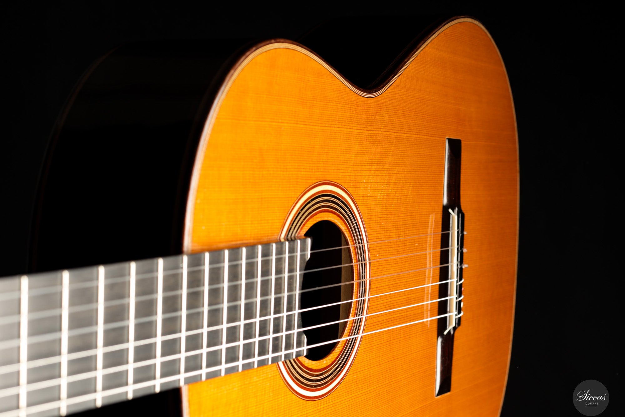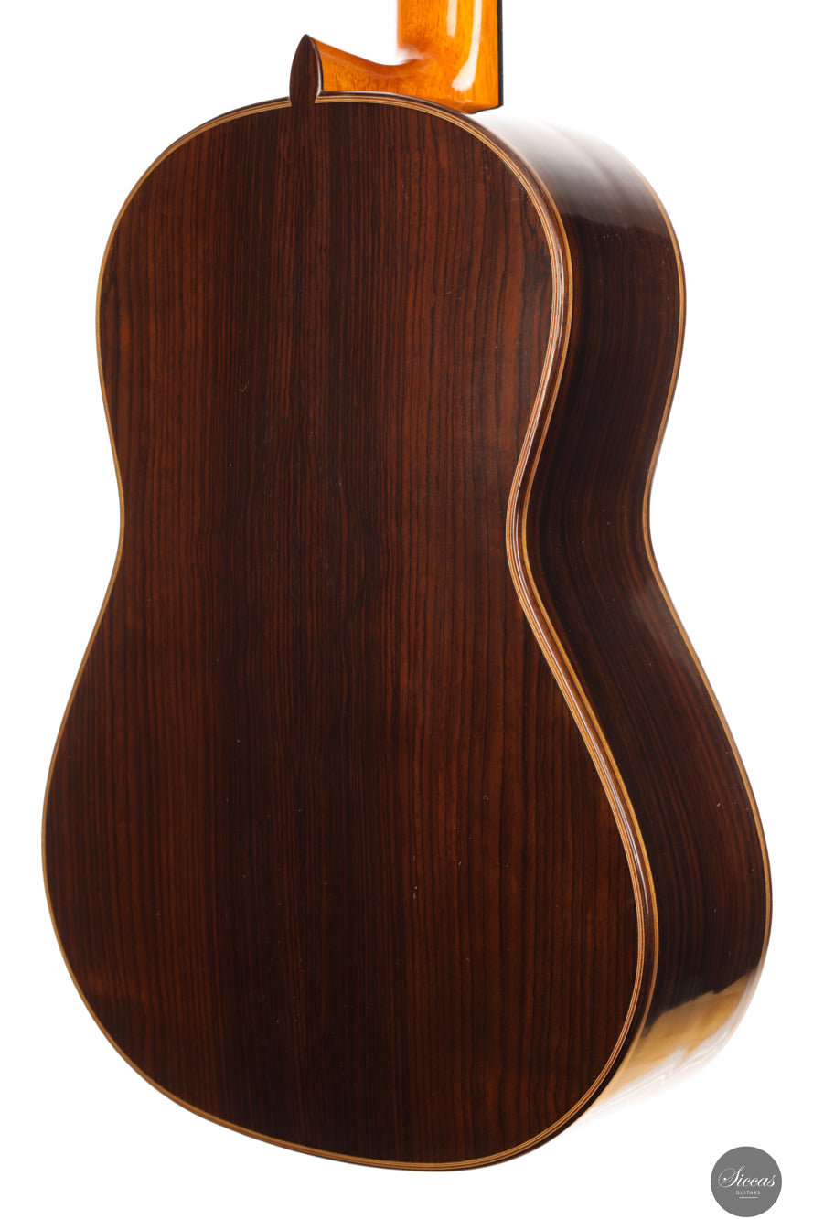 A lightweight 2017 double top by Jakob Lebisch with cedar top and Indian rosewood that offers enormous power fast response and impressive projection. The tone remains clear and balanced even under pressure and the guitar feels immediately ready for concert use.