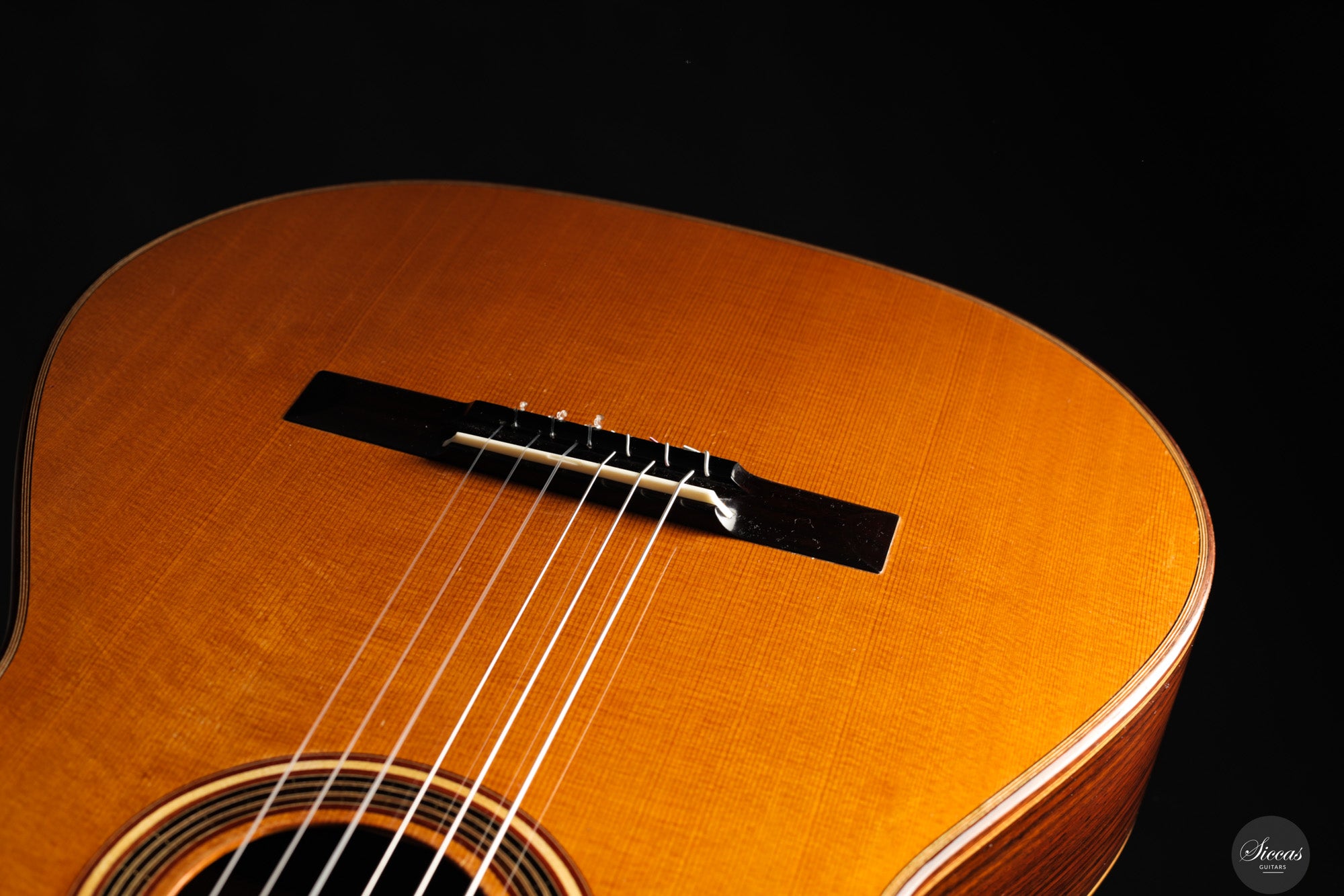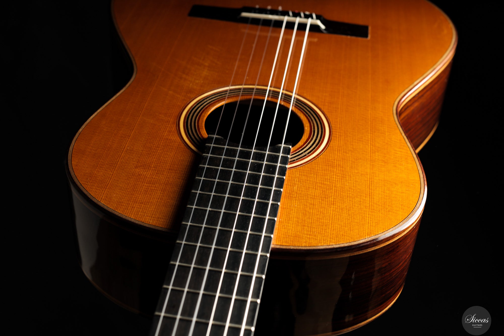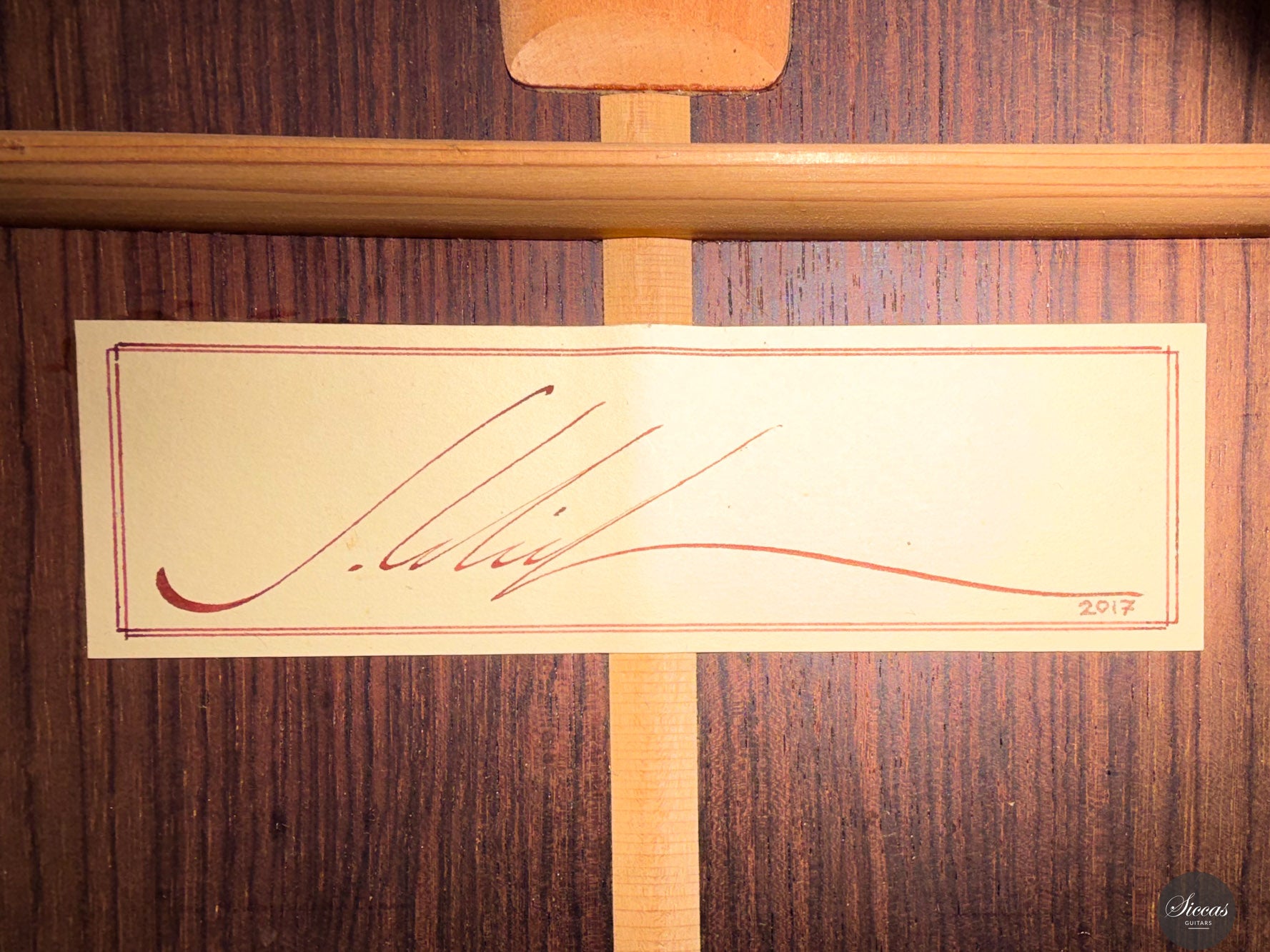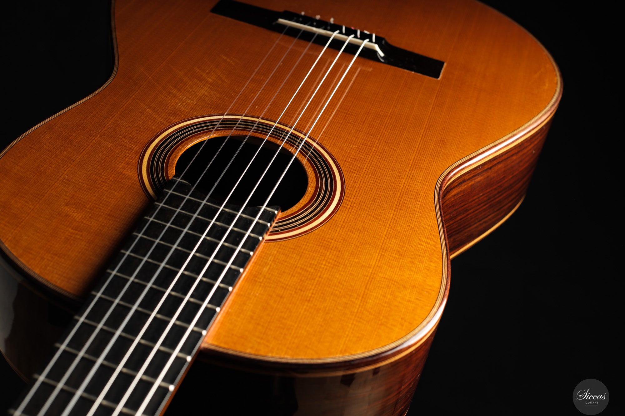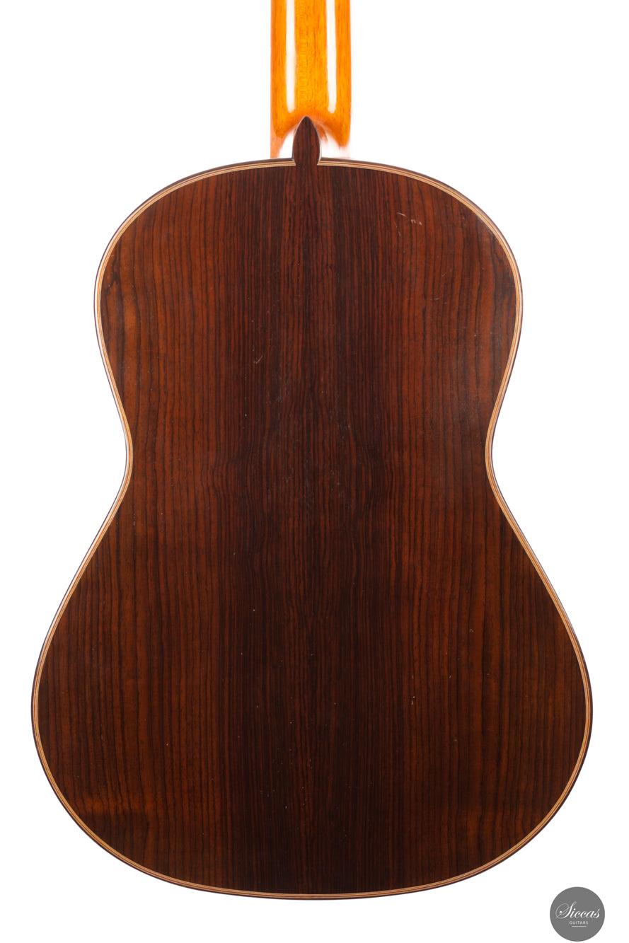 A lightweight 2017 double top by Jakob Lebisch with cedar top and Indian rosewood that offers enormous power fast response and impressive projection. The tone remains clear and balanced even under pressure and the guitar feels immediately ready for concert use.