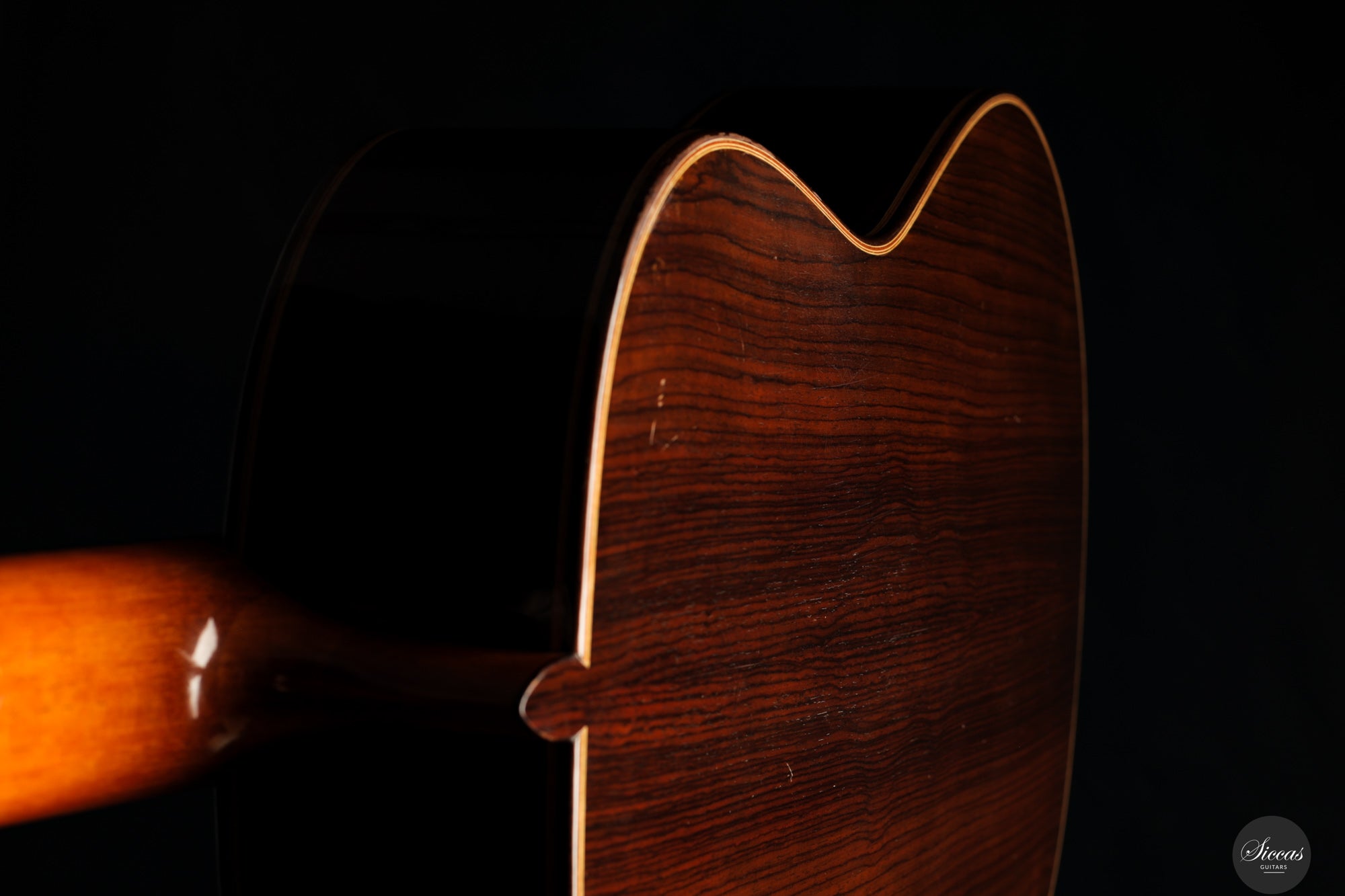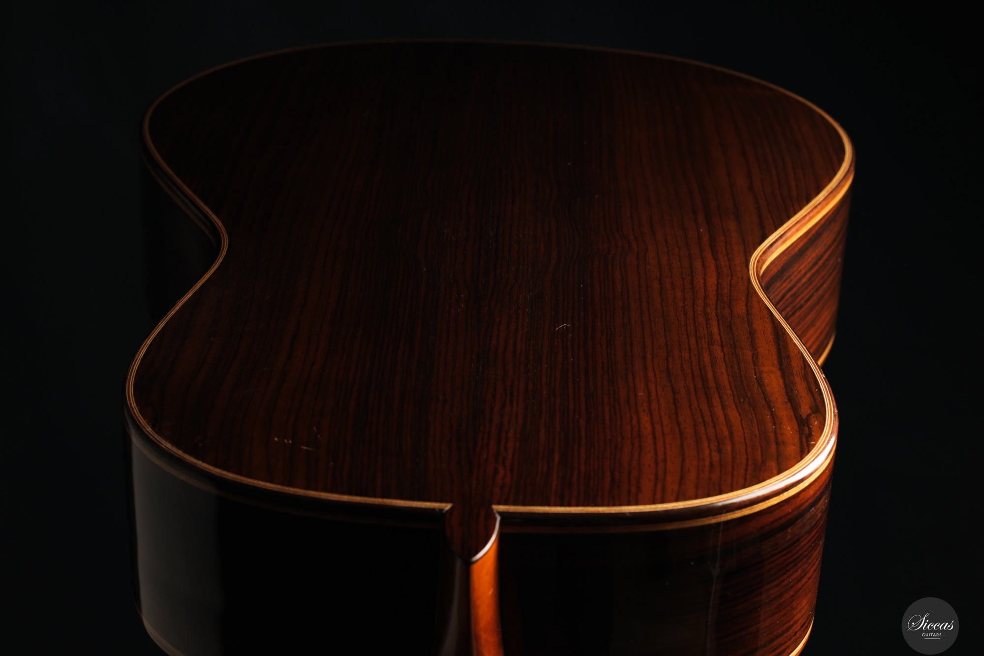 This double top guitar from 2017 reflects the qualities for which Jakob Lebisch is so well known. The cedar soundboard works together with the internal core to create a very fast and highly reactive surface. The body of Indian rosewood is finished with French polish and the entire instrument remains remarkably light in the hands. The air body resonance lies around E which gives the guitar a naturally open and clear presencem with deep basses and well-supported trebles. Klaus Scheller tuning machines support precise and stable tuning.