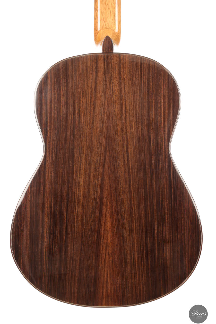 This 2024 guitar, numbered 47-197, features a double top construction with a cedar top and Indian rosewood doubled back and sides. The raised fingerboard is helpful when playing in the upper registers of the fretboard. The rich and gritty treble, coupled with tight basses, make for a powerful instrument that is by no means overwhelming but very inspiring for the guitarist.