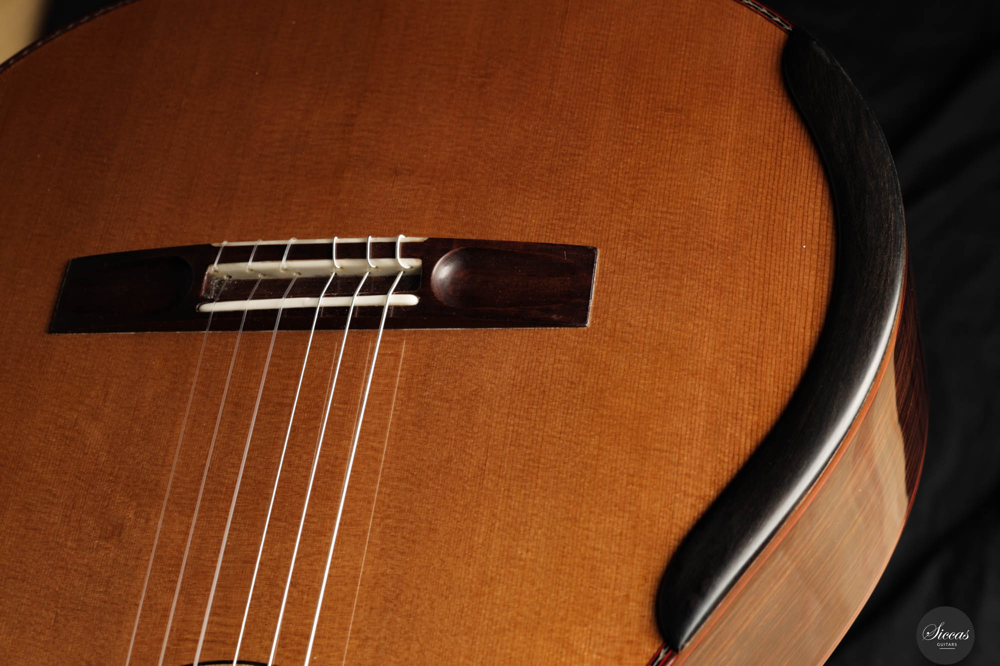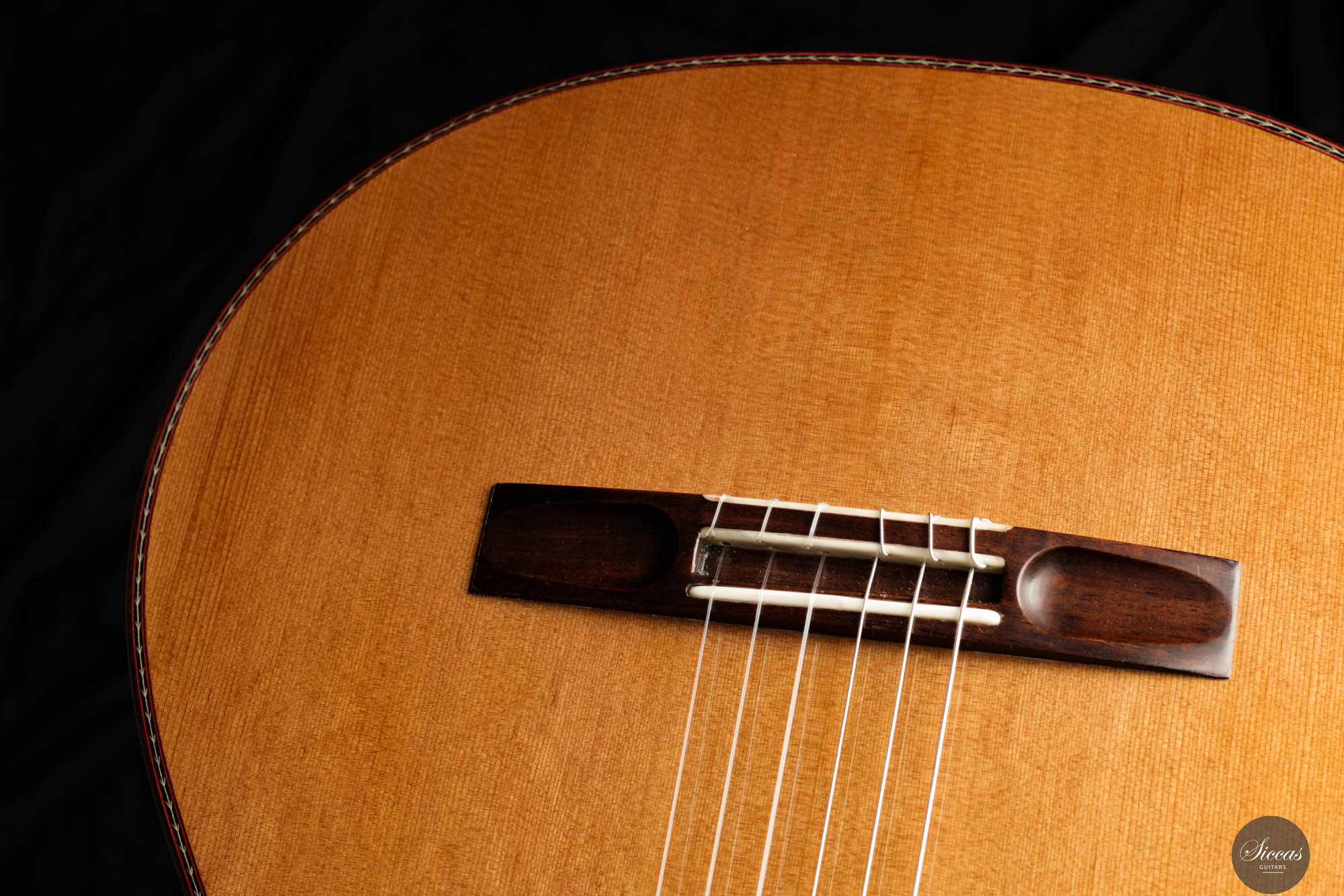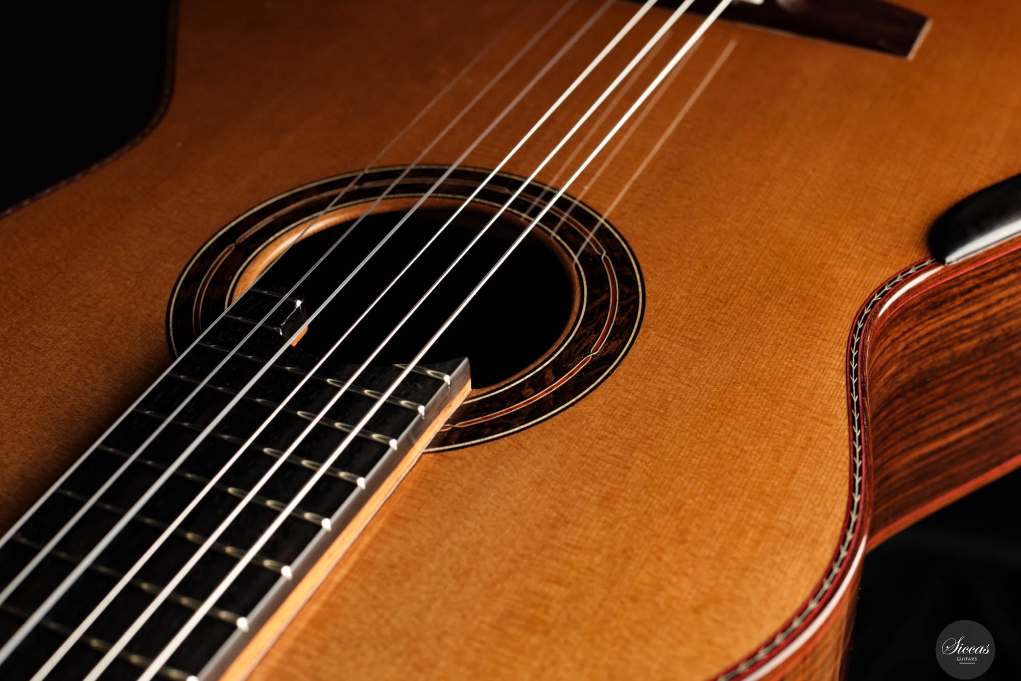 This 2025 guitar, one of the luthier’s latest works, beautifully showcases the perfect balance of tradition and modern innovation. It features a cedar soundboard, a choice prized for its warm and rich tonal quality. The soundboard is supported by a radial bracing system, a contemporary approach to guitar construction, further enhanced by the inclusion of carbon fiber in the struts. This innovative design not only refines the instrument’s tonal response but also strengthens its structural integrity. Additionally, the sides are doubled with mahogany on the inside, creating a rigid yet resonant body that significantly contributes to the guitar’s impressive projection. The result is an instrument that blends classic aesthetics with cutting-edge technology, offering a powerful, refined, and highly expressive sound.