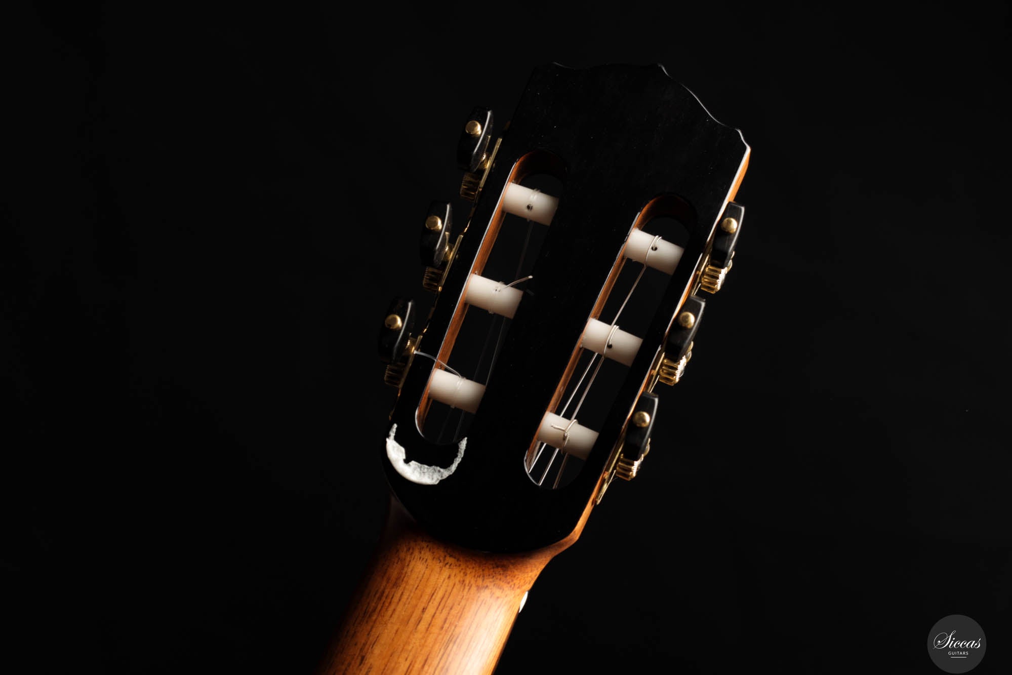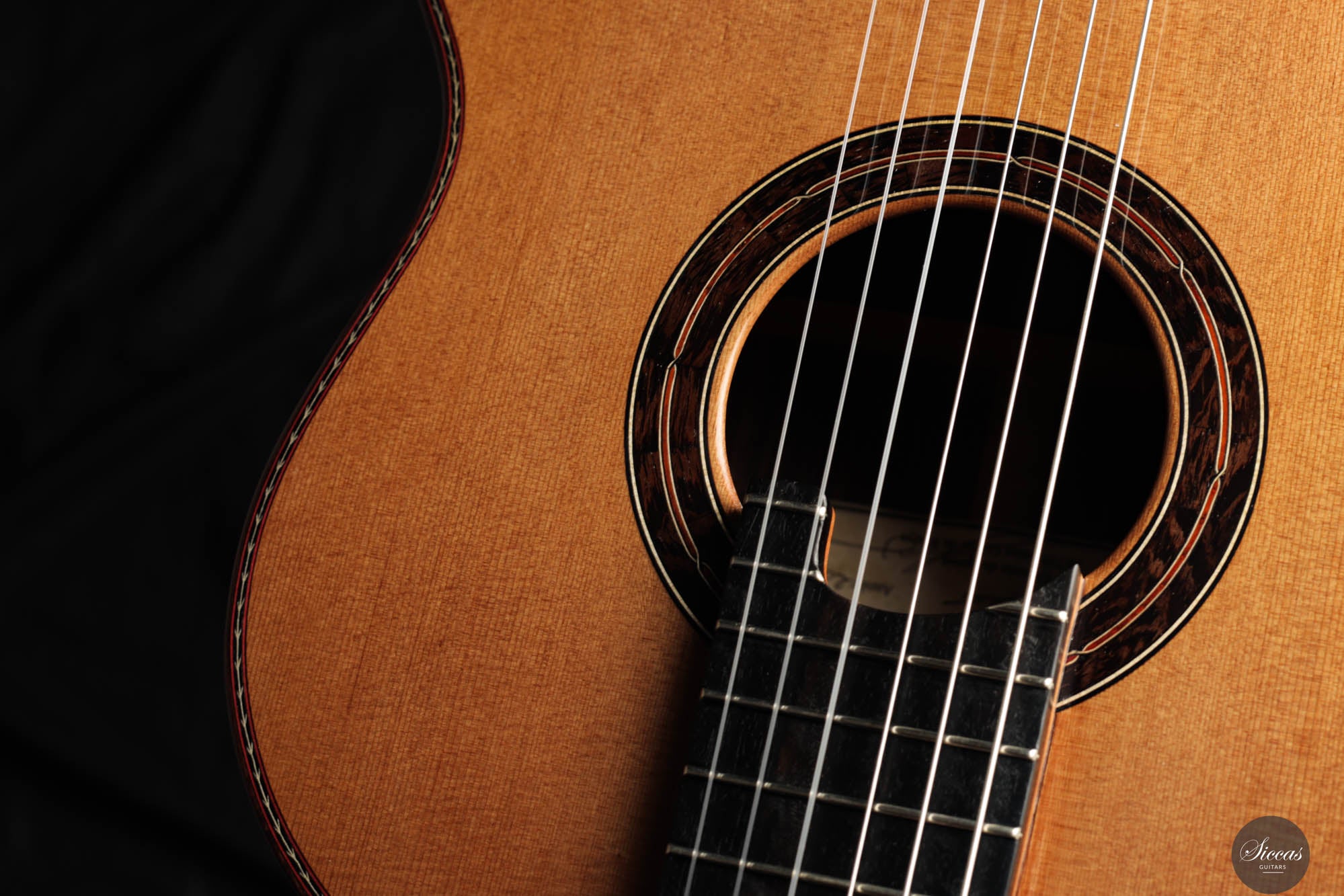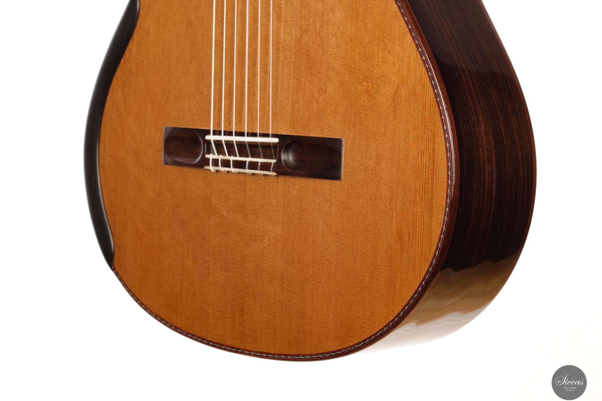 This 2025 guitar, one of the luthier’s latest works, beautifully showcases the perfect balance of tradition and modern innovation. It features a cedar soundboard, a choice prized for its warm and rich tonal quality. The soundboard is supported by a radial bracing system, a contemporary approach to guitar construction, further enhanced by the inclusion of carbon fiber in the struts. This innovative design not only refines the instrument’s tonal response but also strengthens its structural integrity. Additionally, the sides are doubled with mahogany on the inside, creating a rigid yet resonant body that significantly contributes to the guitar’s impressive projection. The result is an instrument that blends classic aesthetics with cutting-edge technology, offering a powerful, refined, and highly expressive sound.