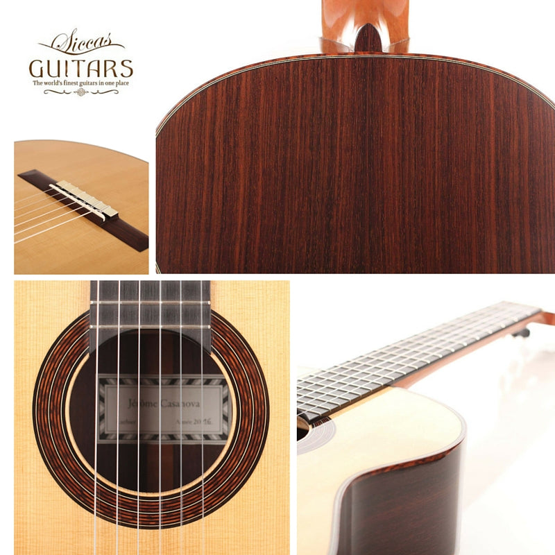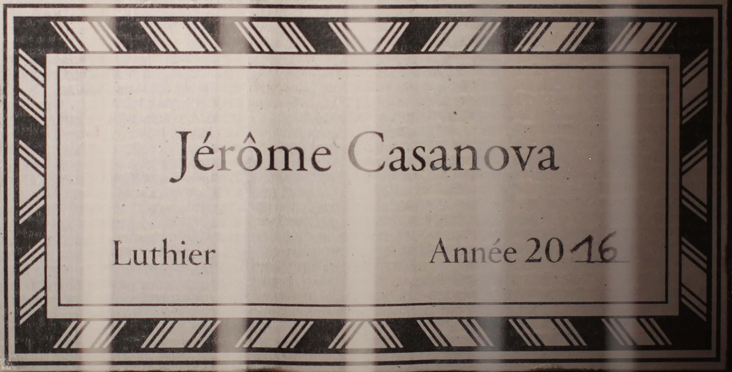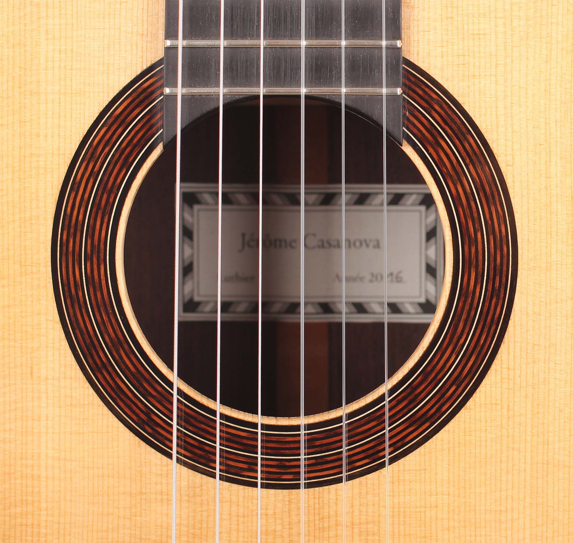 Jérôme Casanova is a French luthier and has opened his own workshop in 2003. He’s specialized in building and restoring guitars. He builds three or four guitars (classical, contemporary or copy of ancient models) every year. The remaining time he restores plucked stringed instruments. This guitar has a spruce top with traditional fan-strutting and Indian rosewood back and sides. The stunning looking binding is made of Snakewood. It’s a very well-balanced instrument with depth and richness, the trebles are clear and it's really comfortable to play. The tuning machines are made by Alessi.