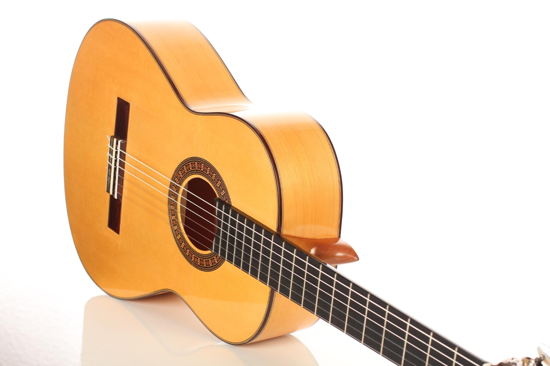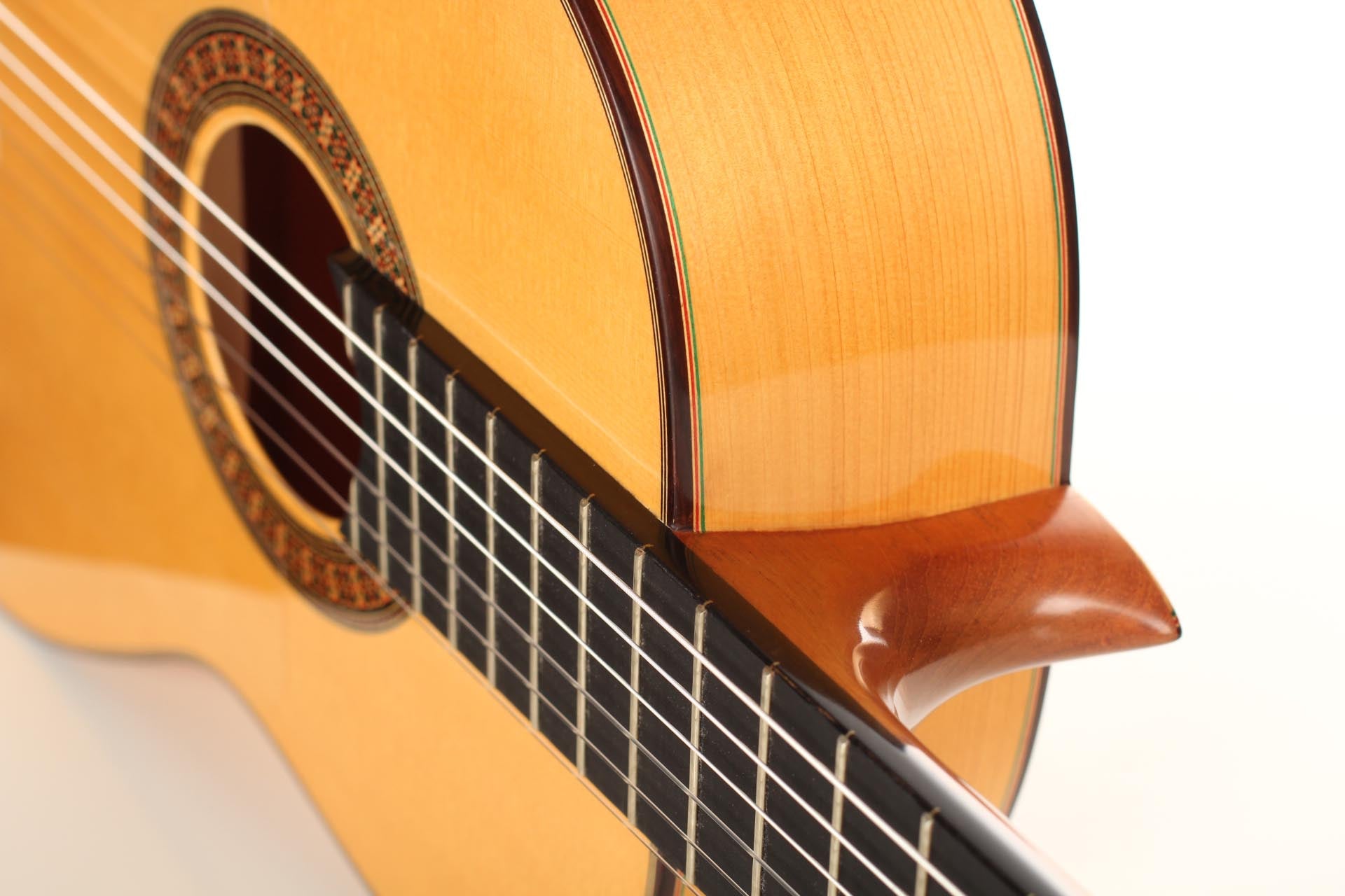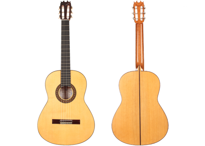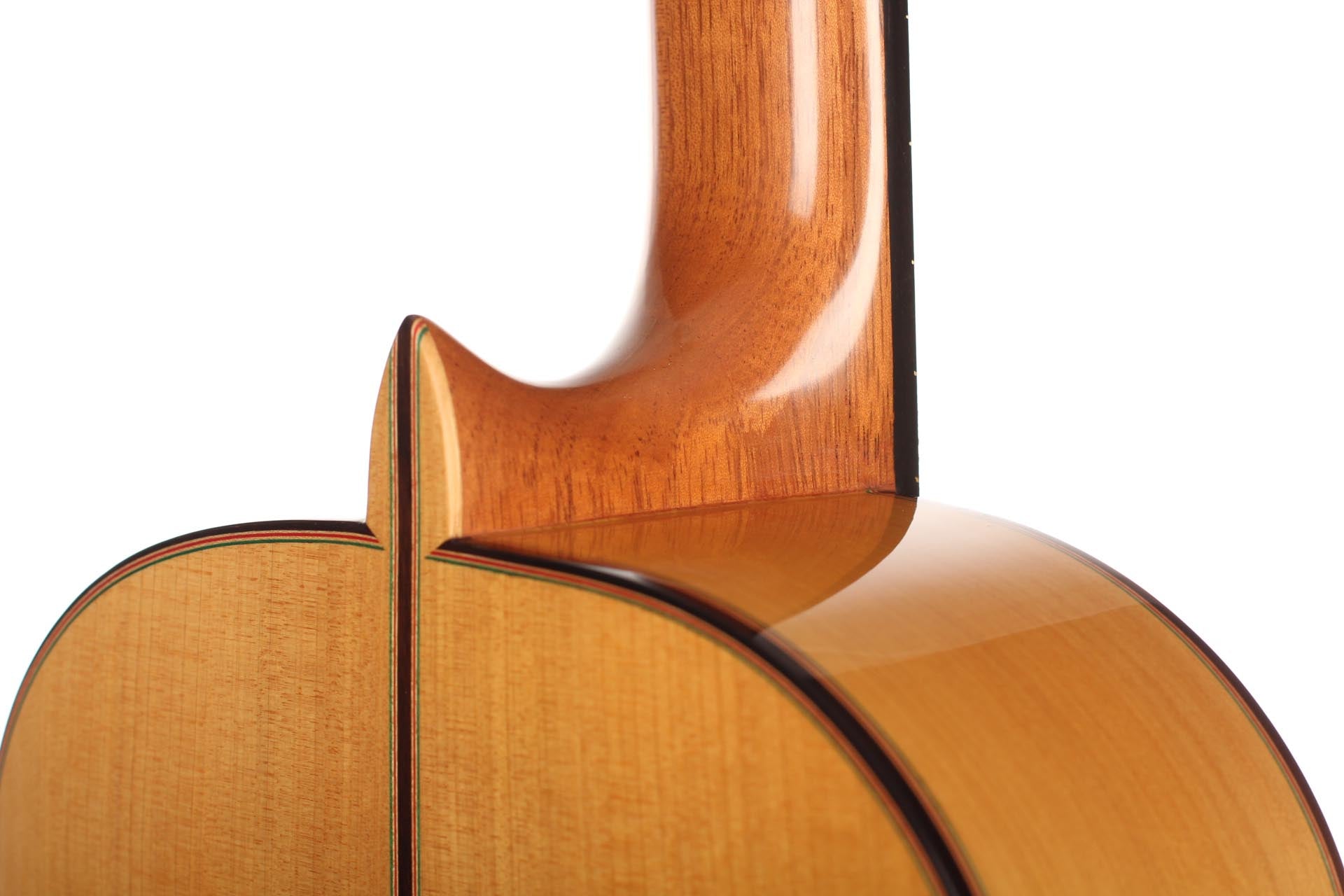 This guitar was built in 2018 and is brand new. It has a spruce top and cypress back and sides. The quality of the woods along with the richness and character of the tone makes it a very fine flamenco guitar. The projection of the tone is spectacular, and the harmonic definition in the chords is splendid. A hard-shell case is included.
