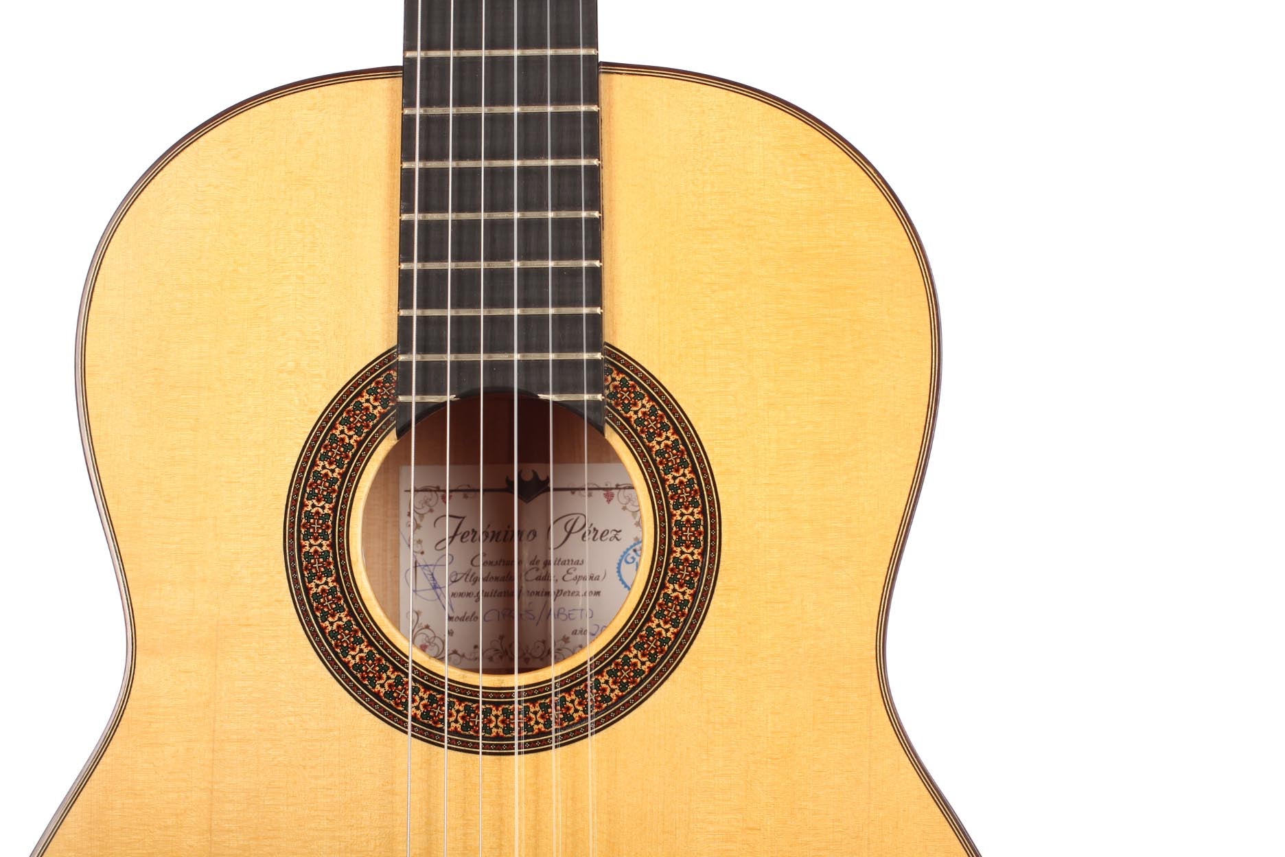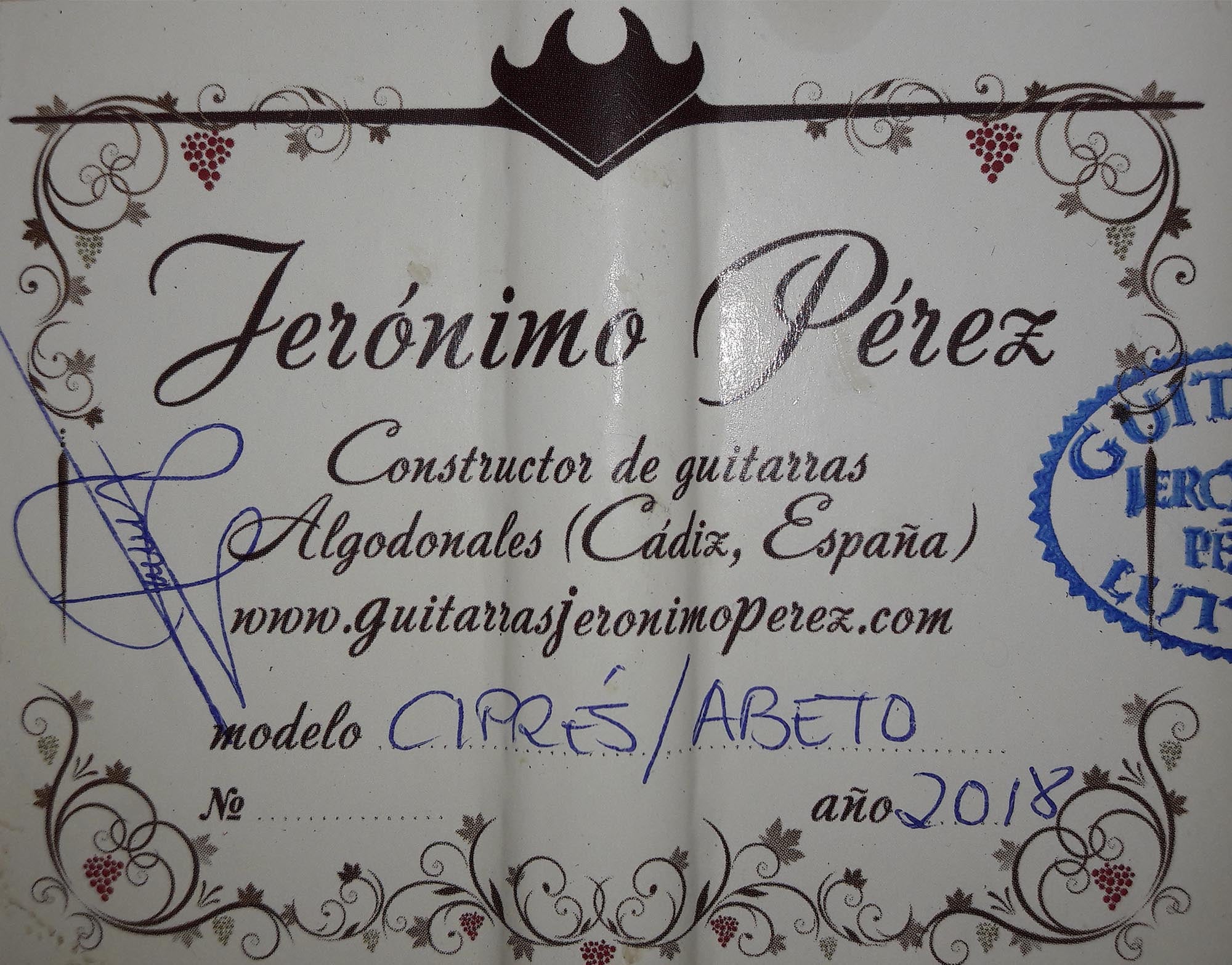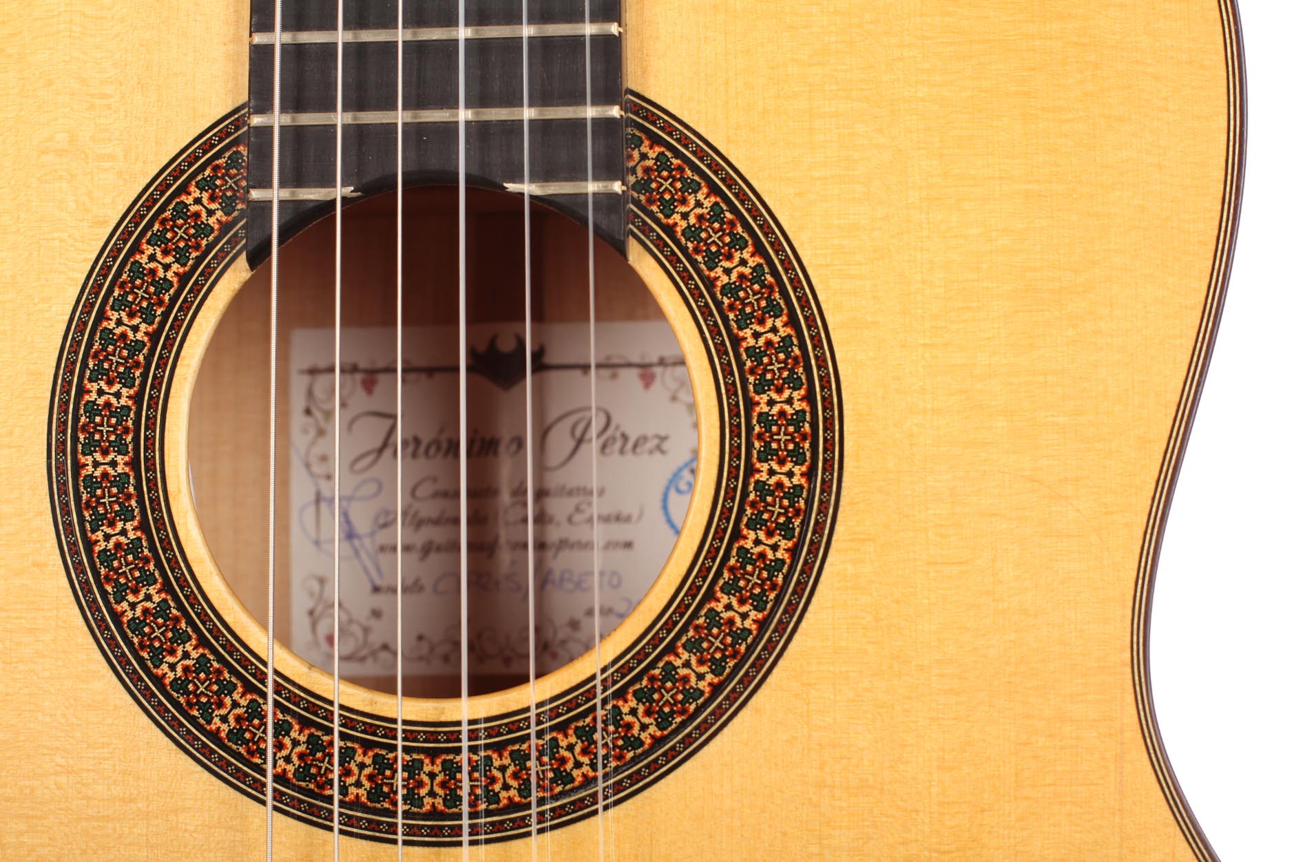 This flamenco guitar was made by Jerónimo Pérez de Algodonales, in Cadiz. Flamenco guitarists such as Antonio Rey, Paco Cepero, Diego del Morao, Miguel Salado, Bolita, Jesús Guerrero, Antonio Moya… etc. came to his workshop looking for one of his instruments.