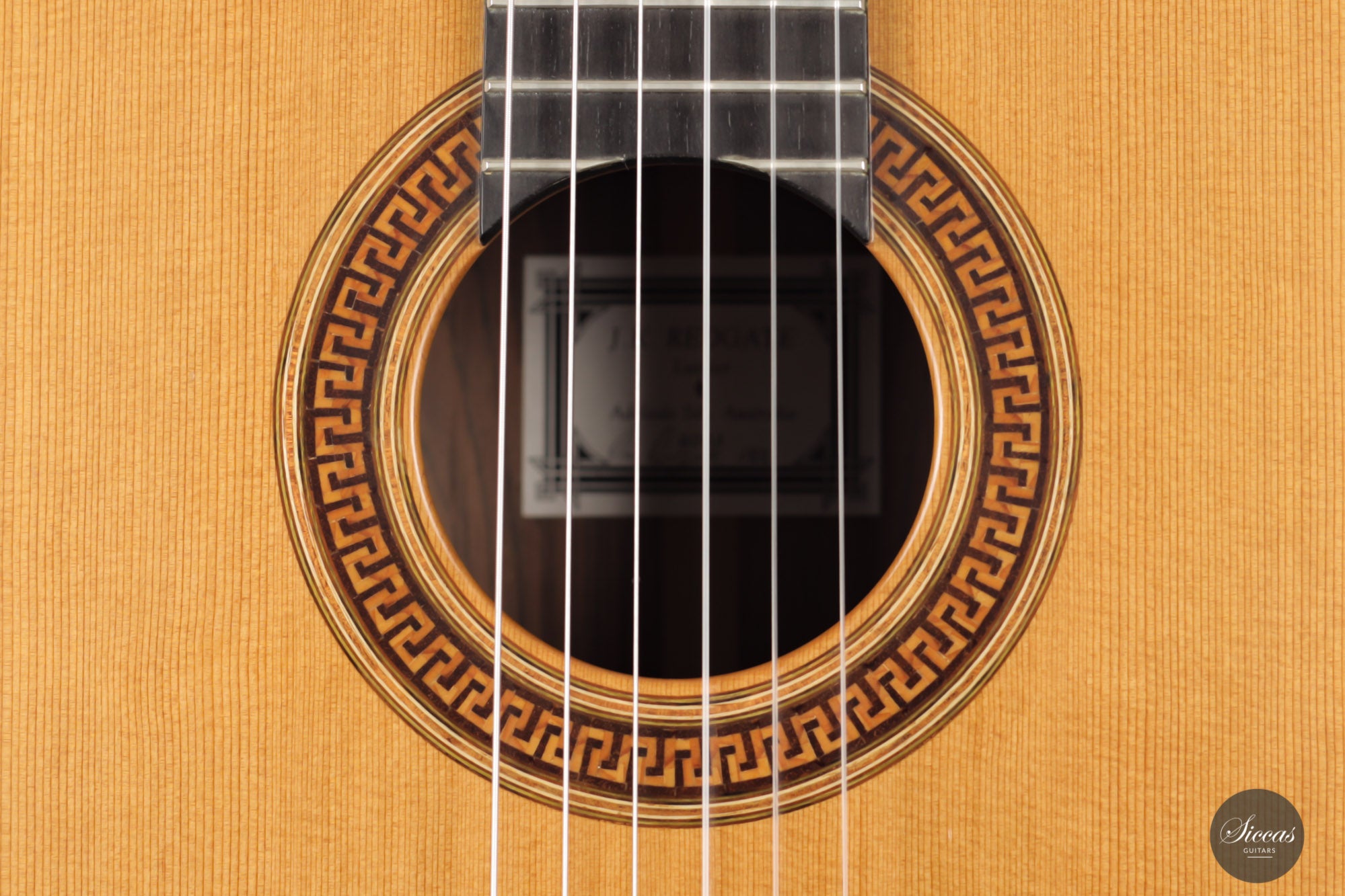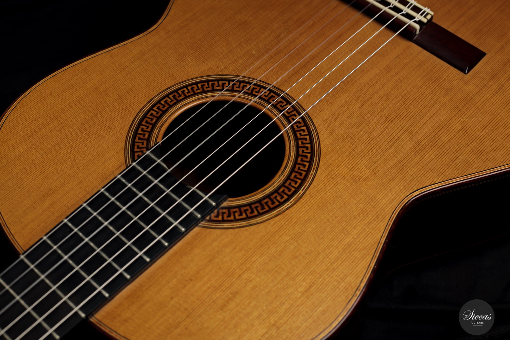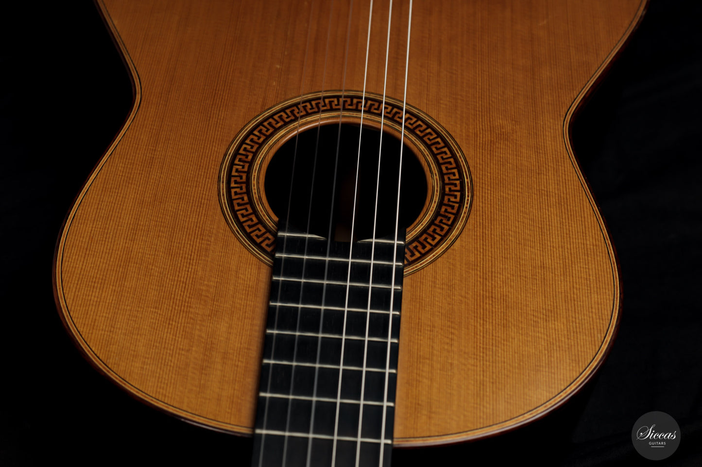 This 2001 Jim Redgate combines soberness and a strong character. It has a balsa-made lattice bracing reinforced with carbon fiber. The back is slightly arched, reminiscent of the cello's, and two wooden bars were fixed to the lower bout to strengthen the sides. These elements contribute to a broad projection of the sound and great stability. The matt and dark cedar top is elegantly decorated with an in-tone rosette recalling antique roman architecture. The guitar shows minor and superficial playing marks on the soundboard and the back.