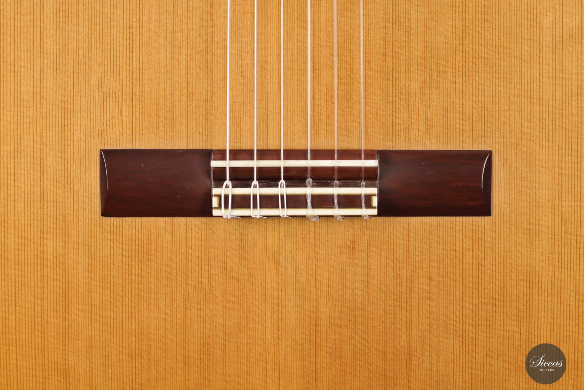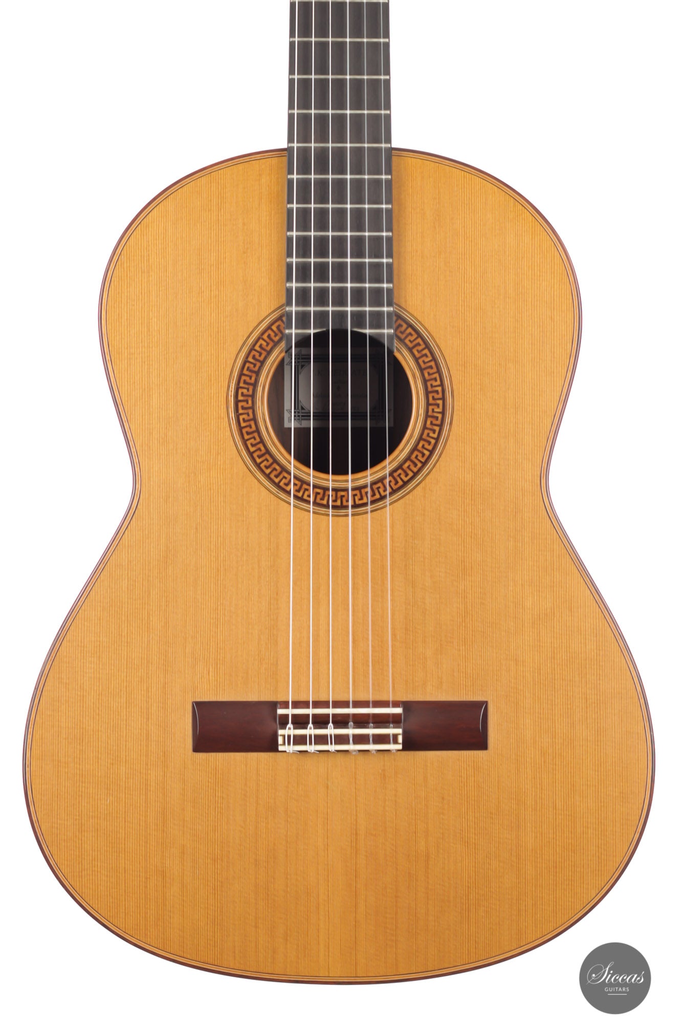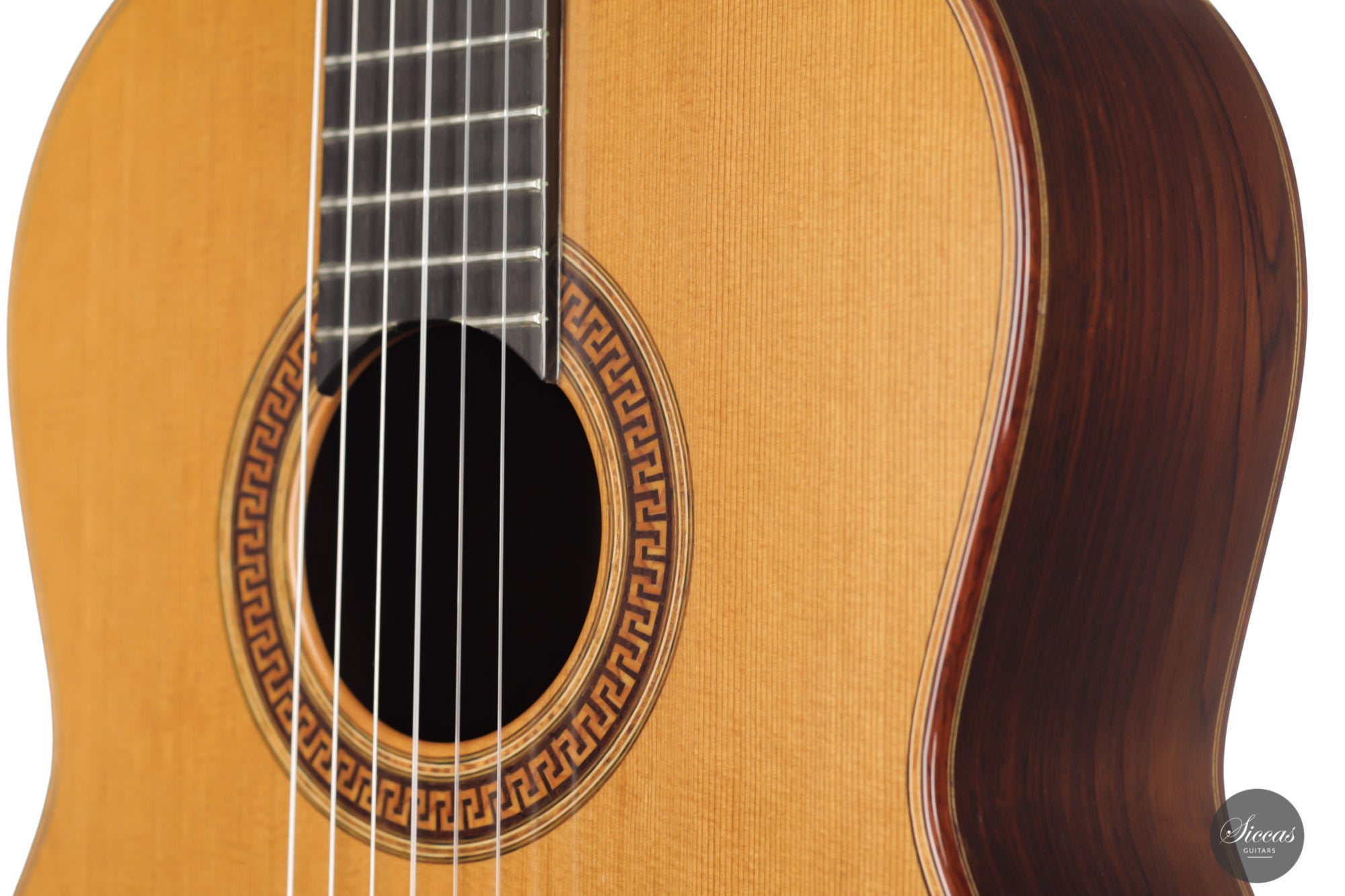 This 2001 Jim Redgate combines soberness and a strong character. It has a balsa-made lattice bracing reinforced with carbon fiber. The back is slightly arched, reminiscent of the cello's, and two wooden bars were fixed to the lower bout to strengthen the sides. These elements contribute to a broad projection of the sound and great stability. The matt and dark cedar top is elegantly decorated with an in-tone rosette recalling antique roman architecture. The guitar shows minor and superficial playing marks on the soundboard and the back.