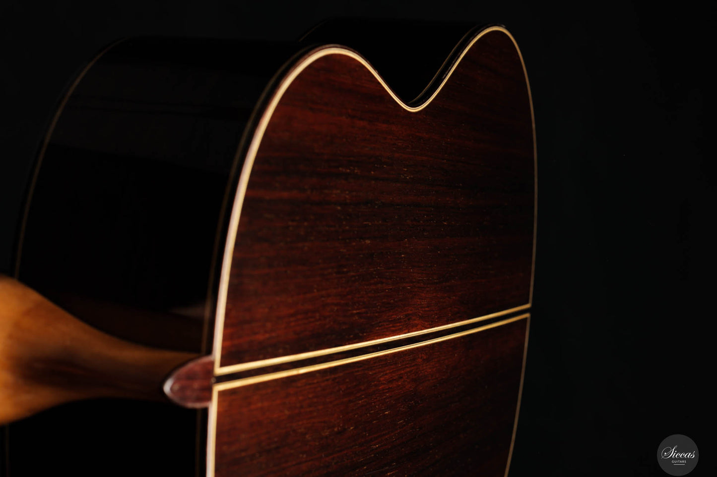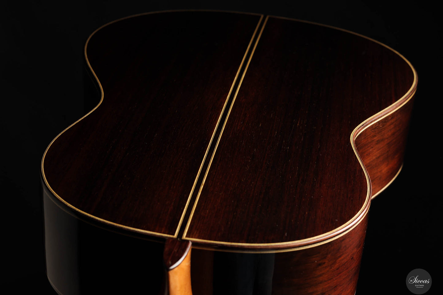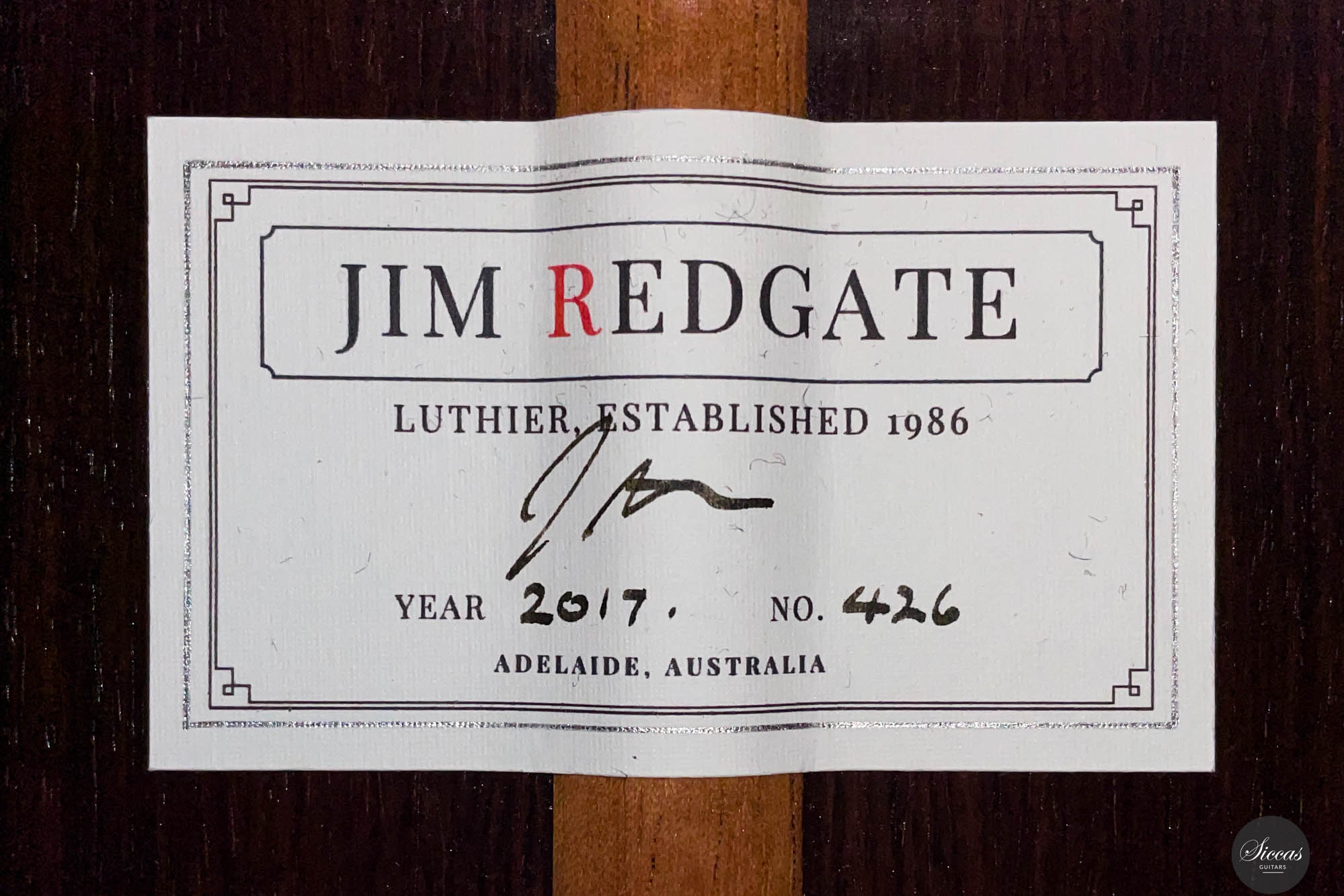The 2017 No. 426 Jim Redgate guitar is a masterpiece of modern luthiery, a perfect blend of aesthetic beauty and exceptional acoustic performance. Crafted with meticulous attention to detail, this model showcases a beautifully delicate cedar doubletop renowned for its nuanced sound and responsiveness. This is complemented by the dark, rich tones of Amazonas rosewood for the back and sides, adding depth and complexity to the guitar's overall sound. The elegance of this guitar is further enhanced by the intricate purfling, bindings, and rosette, each a testament to Redgate's commitment to unparalleled craftsmanship. Every aspect of this guitar, from the choice of materials to the precision of its construction, reflects a profound understanding of both the art and science of guitar making. The result is an instrument that not only looks stunning but also meets the exacting demands of the most discerning musicians.