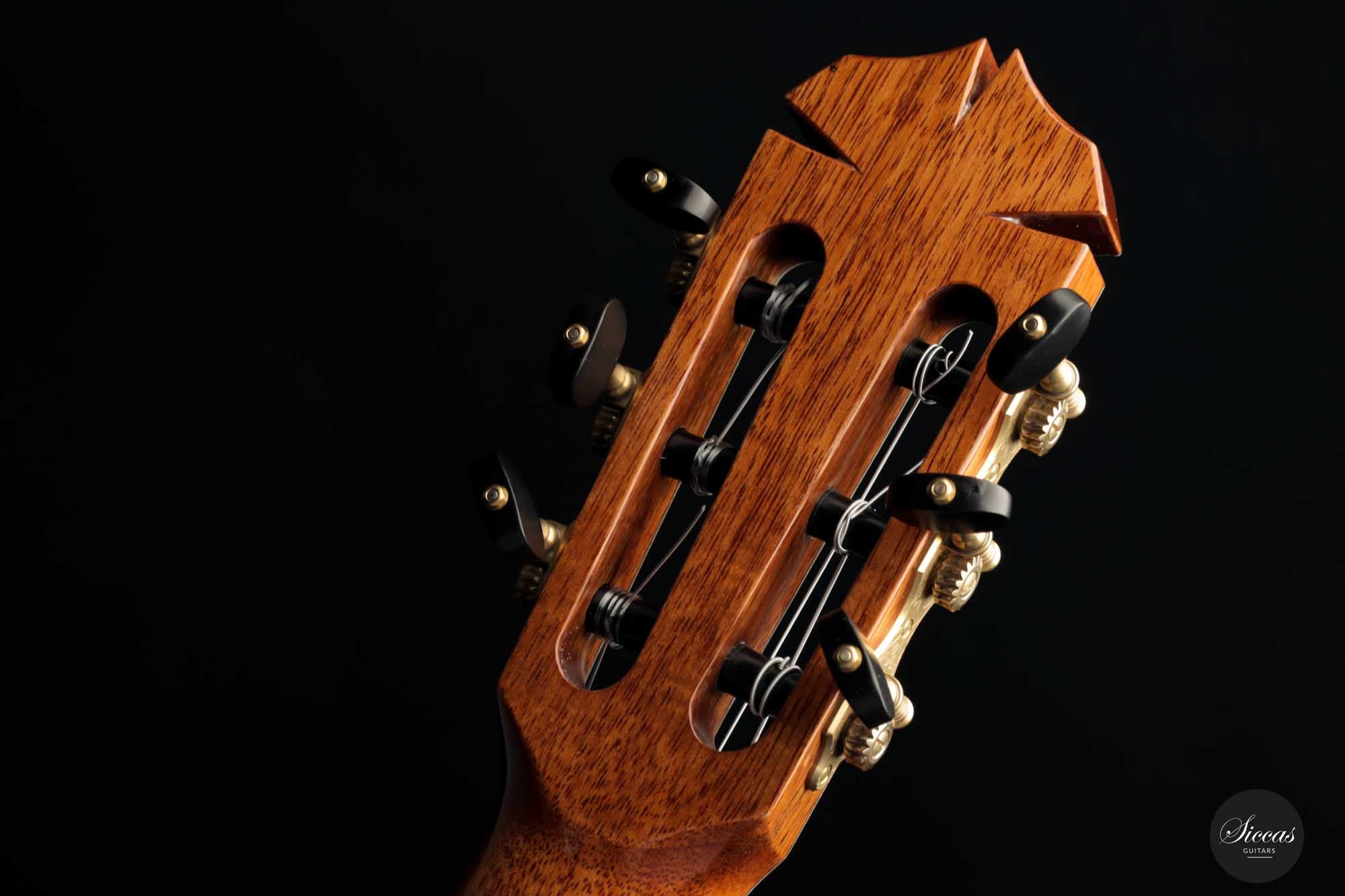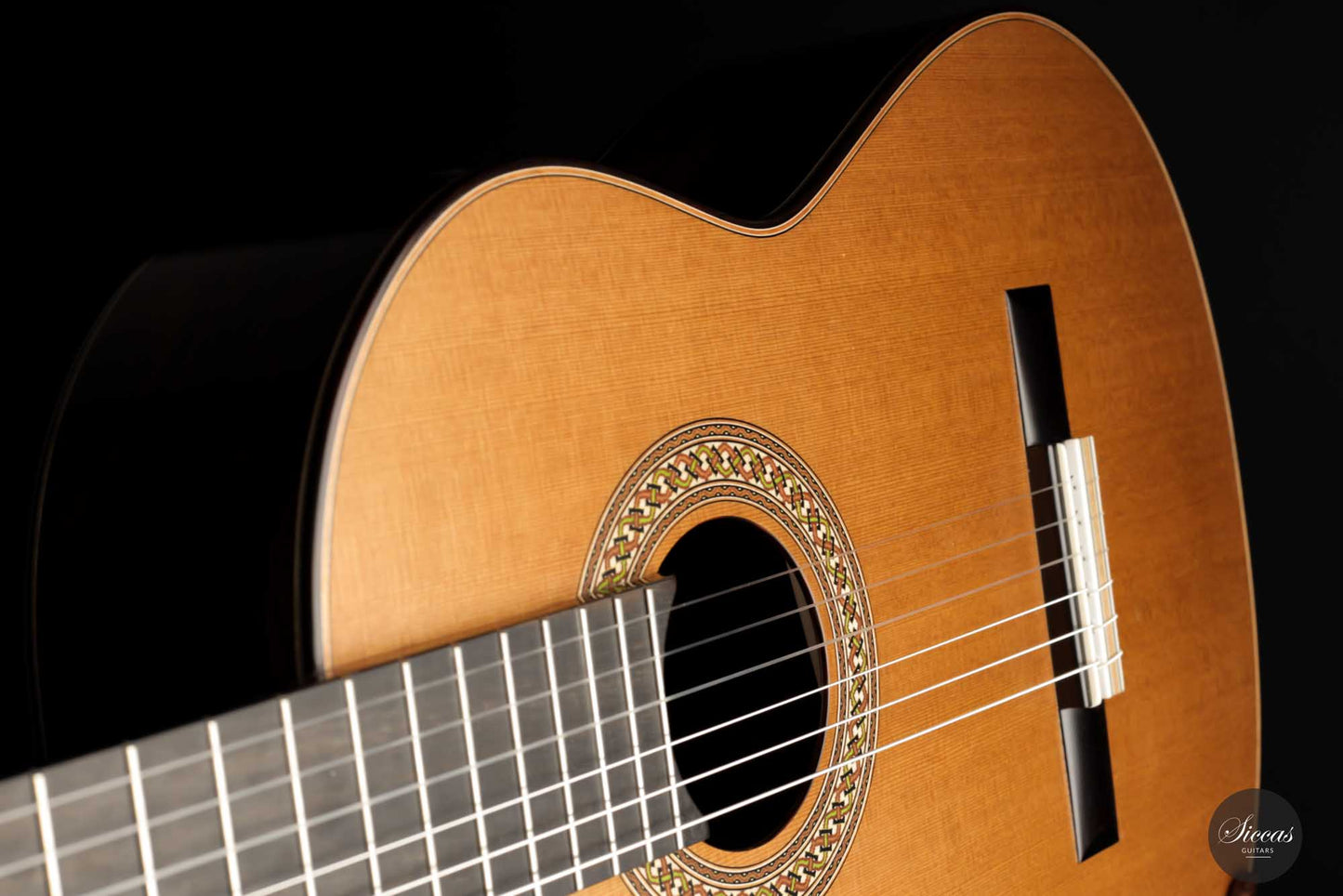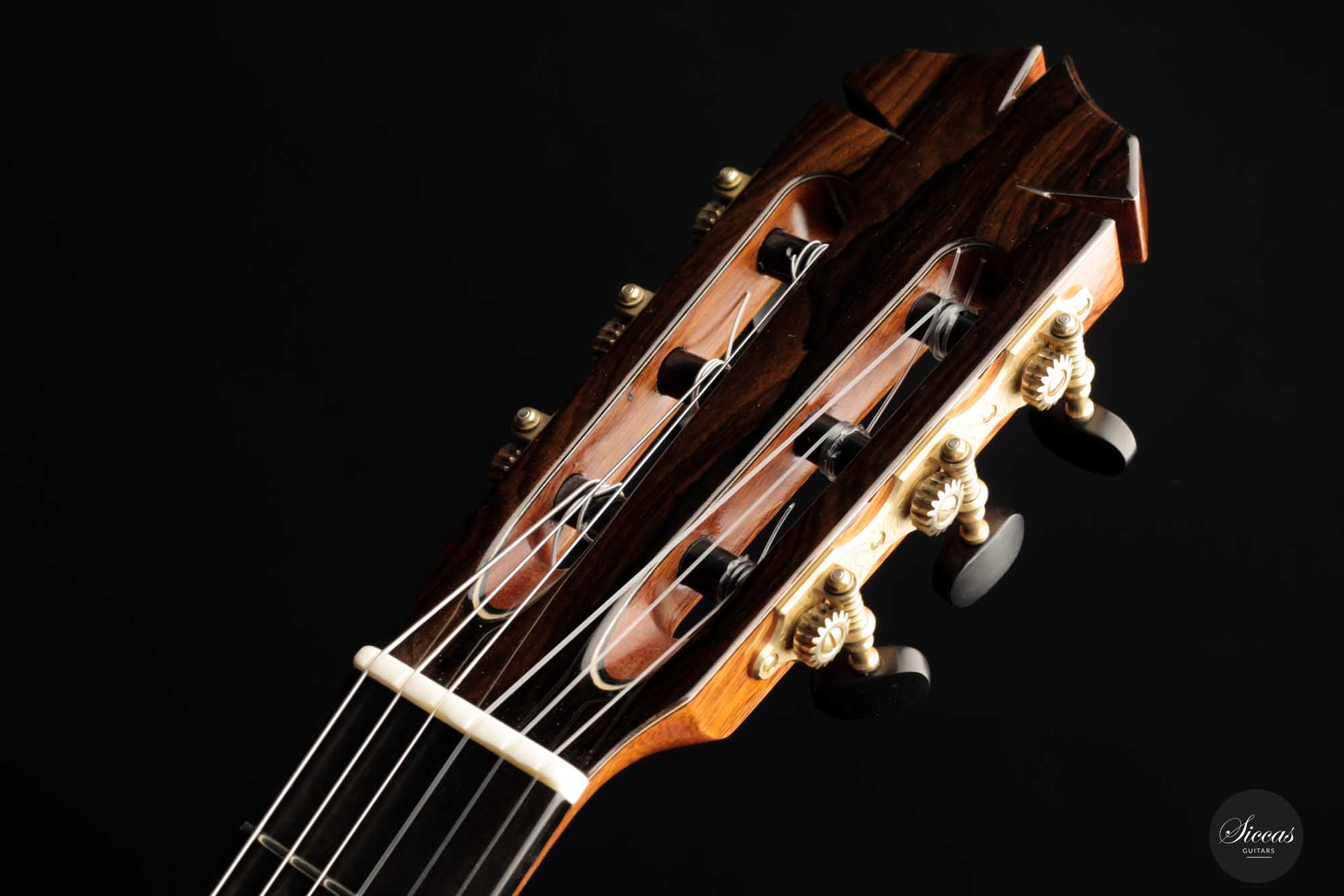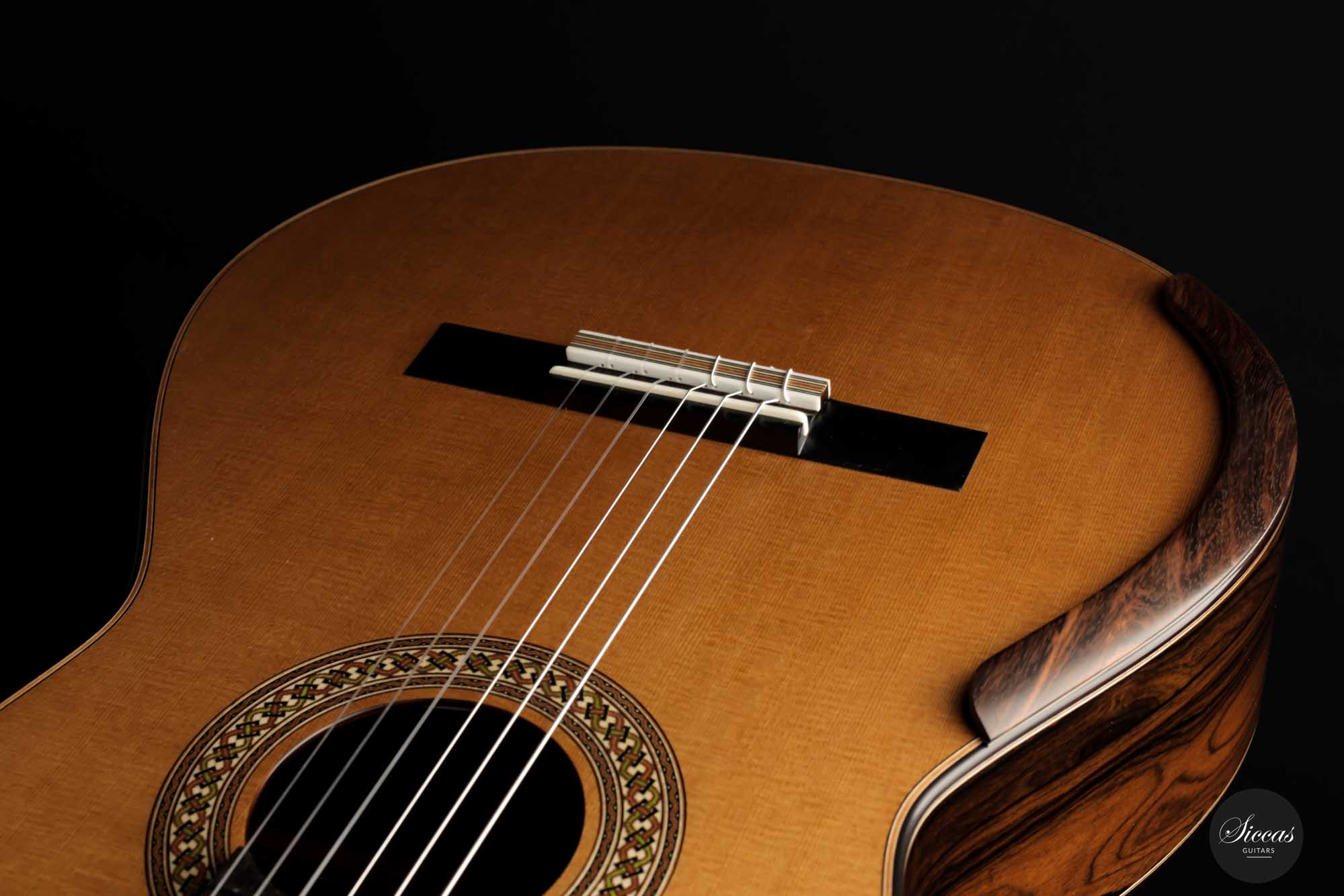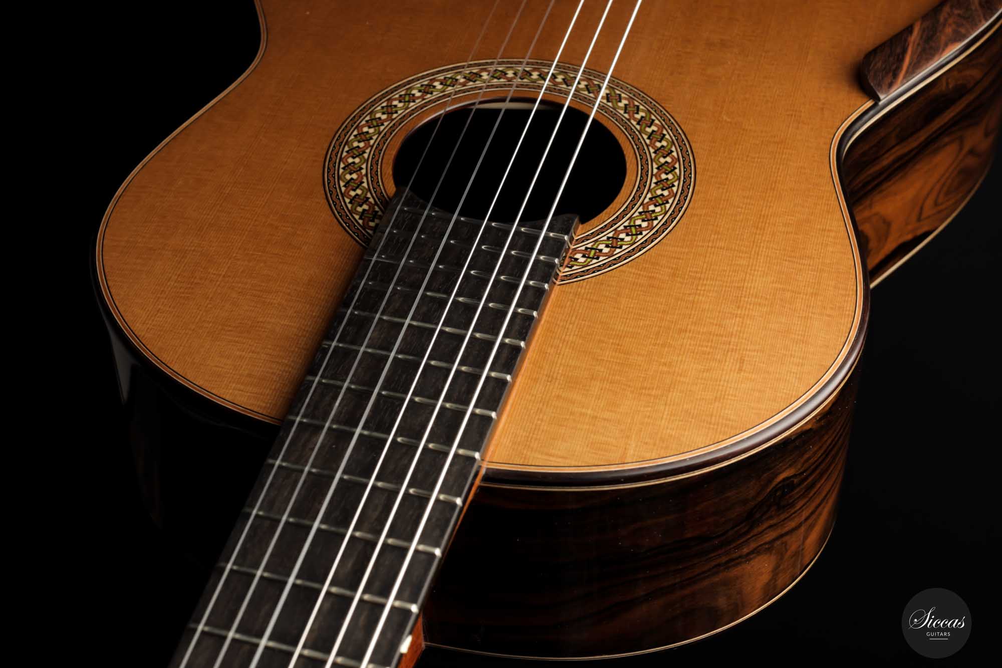 This Redgate with the number 505 is an exceptional guitar that easily meets the highest demands. The combination of the fine cedar top with the dark and exquisite ziricote back and sides creates a special elegance in this instrument. In addition, the carefully executed purfling, bindings and rosette are evidence of superb craftsmanship. All in all, Jim Redgate's handcrafting is at the highest level. With its excellent balance, homogeneity and expressiveness, this Lattice guitar can be classified as one of the most advanced concert guitars, while maintaining its artistic quality and shining with outstanding intonation in all registers. One can well appreciate why Jim's guitars are preferred by many concert artists, especially this particular model, which Ana Vidovic has been using as her main instrument for her numerous concert performances throughout her career.