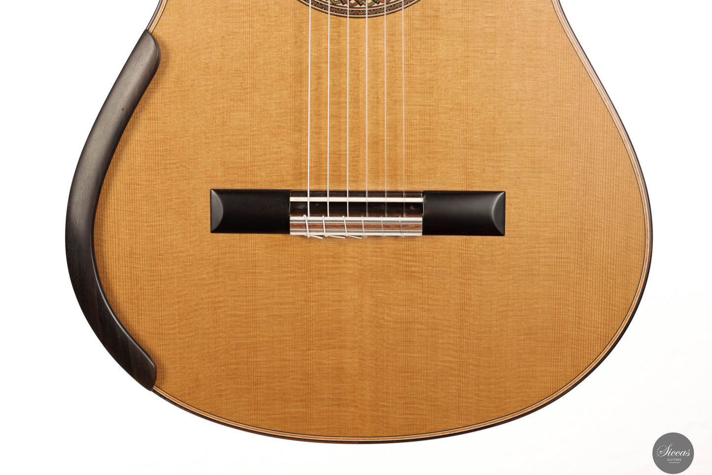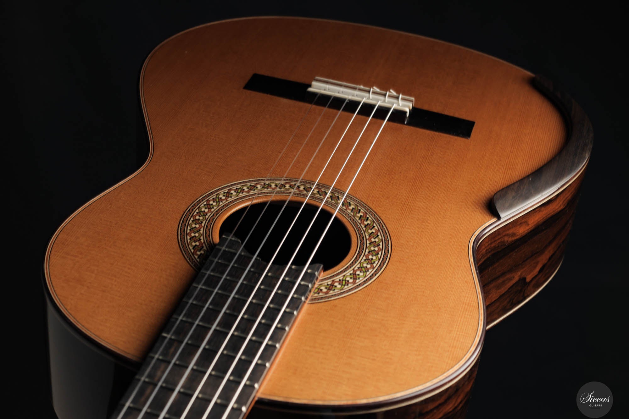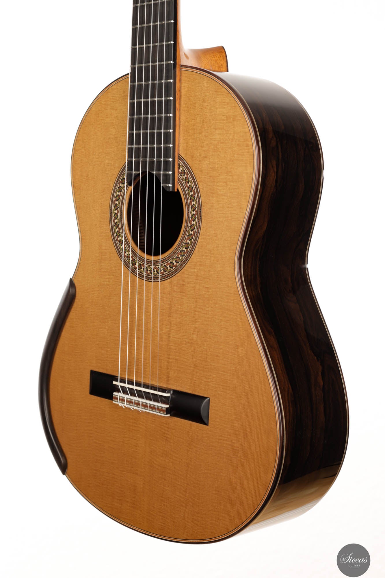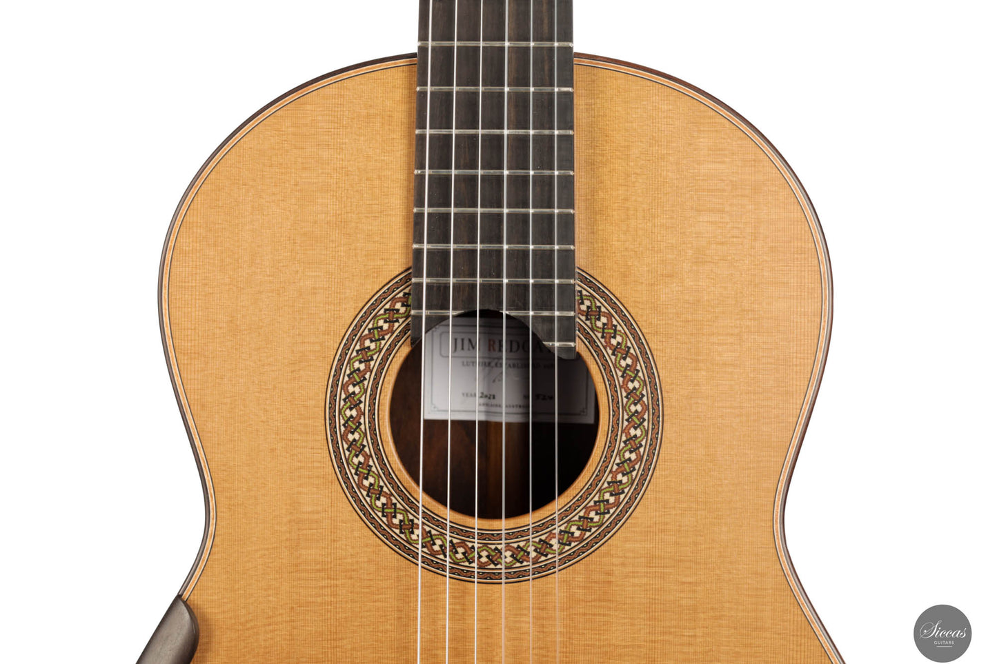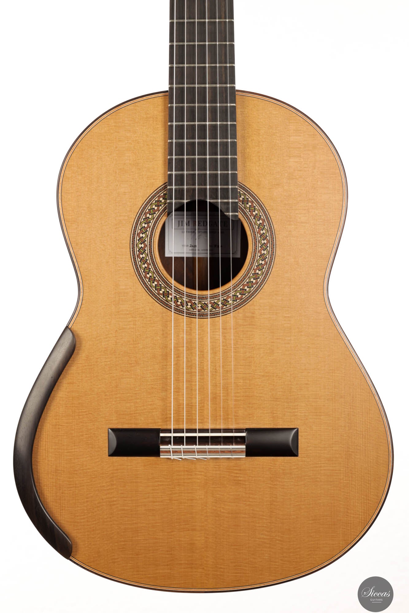 The 2023 Jim Redgate guitar emerges as a magnificent achievement in the world of high-end luthiery, satisfying the highest standards of musicians across the globe. This new model is a symphony of aesthetics and acoustics, featuring a beautifully delicate cedar top paired with the dark, rich tones of Ziricote for the back and sides. The result is a guitar that radiates elegance and sophistication. The attention to detail is evident in the intricate purfling, bindings, and rosette – each element showcasing the extraordinary craftsmanship synonymous with Jim Redgate's work.