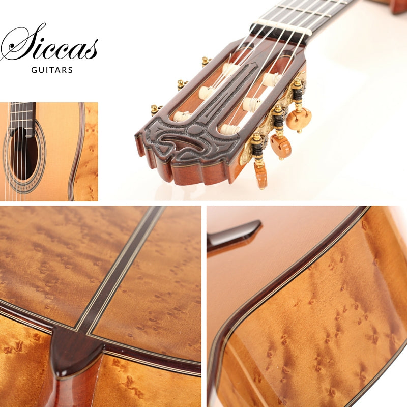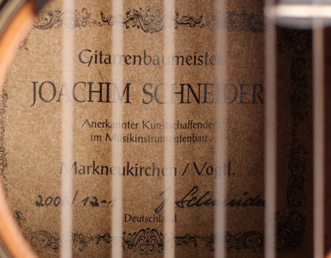 This is a classical guitar made by the German luthier Joachim Schneider in 2006. Joachim was born in 1939 in Markneukirchen and started to work at the workshop of his grandfather Willy Blahowetz. In 1961 he finished his training at the Chamber of Crafts with the "Meisterprüfung". One year later he took over his grandfather's workshop. He received many international awards for his craftsmanship. This guitar has a spruce top and back and sides are made of beautiful Birdseye Maple. The sound is very nice and balanced with warm bases and lyrical trebles giving the guitar a typical spruce/maple sound. Condition: No cracks or repairs. Some little signs on the top. Below the bridge is a ding that come from a slipped string. The tuning machines are made by Rodgers. A hardshell case is included.