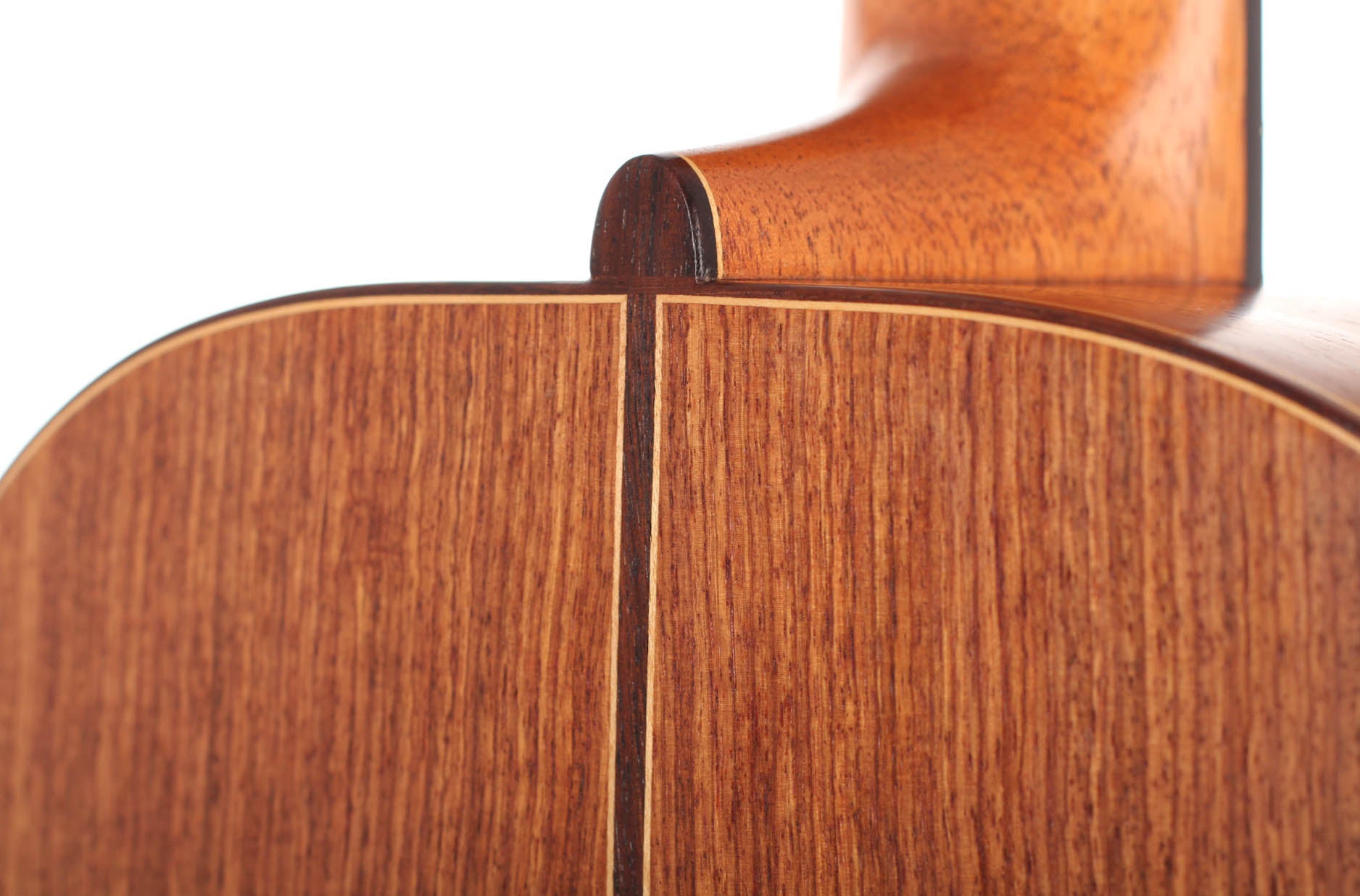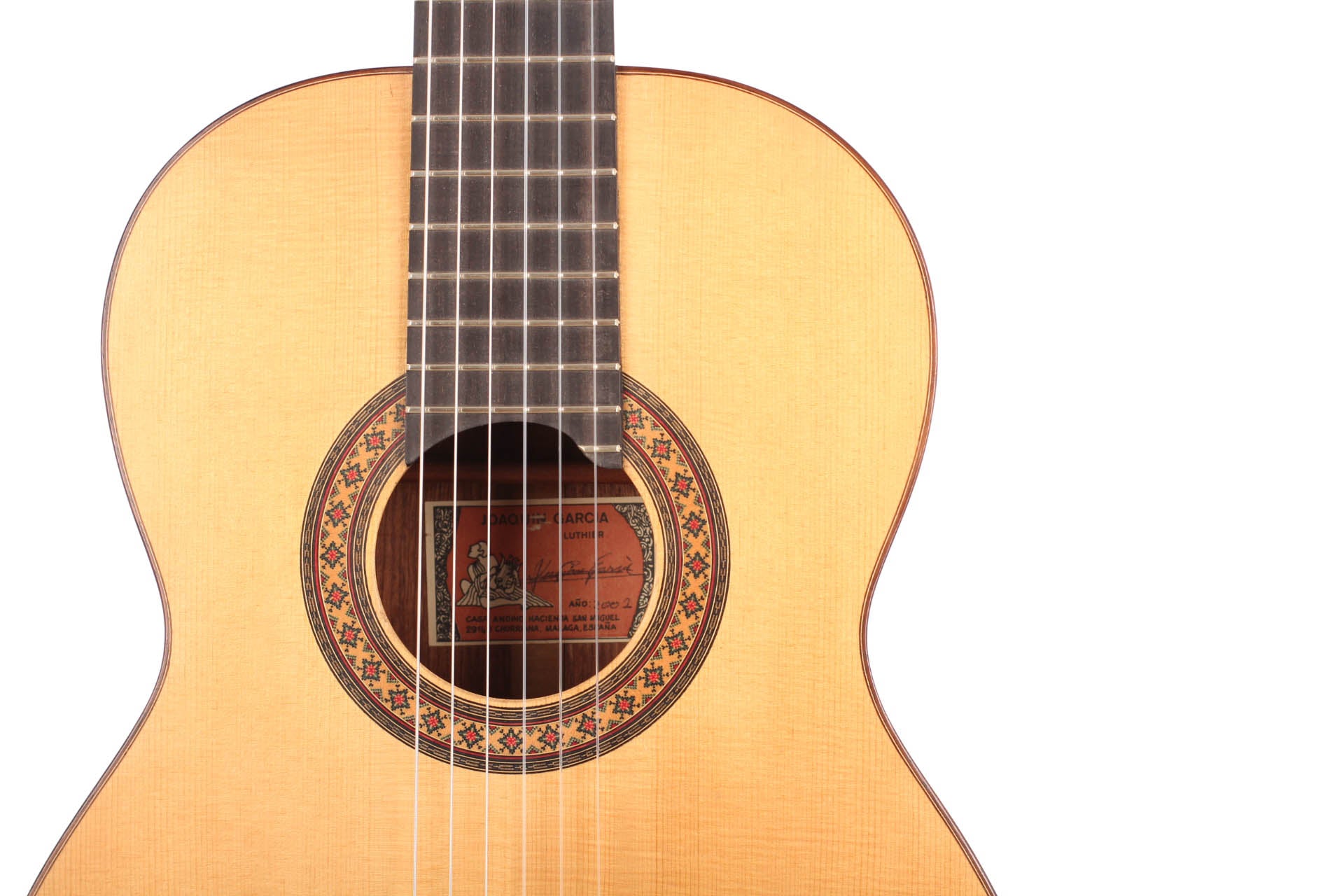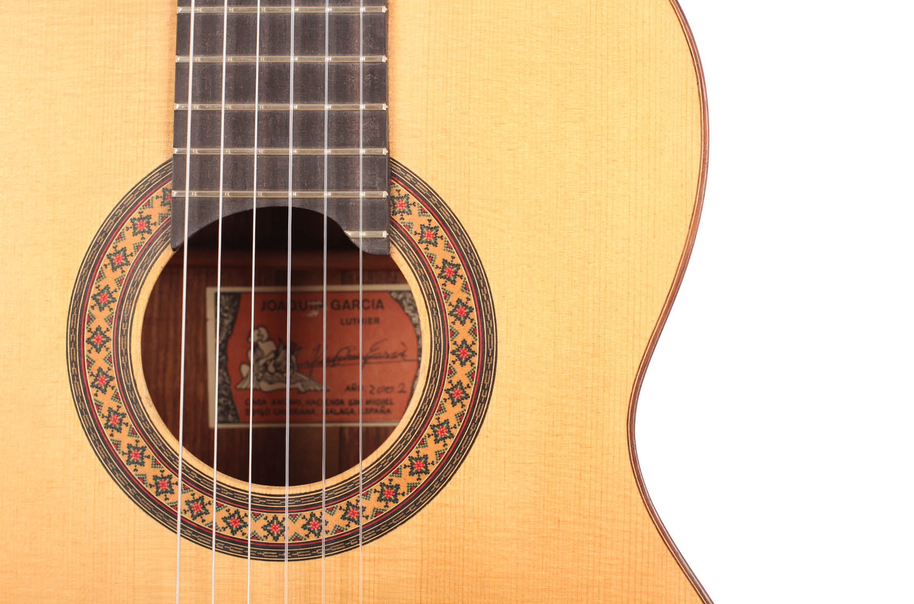 Joaquin Garcia was born in Argentina and lives in Malaga today. He built this guitar in 2002. It is a small bodied guitar, fresh and accessible. The top is made of spruce – back/sides are made of African mahogany. It is a very nice guitar and offers high quality for a decent price. The tuners are made by Fustero. A hardshell case is included.