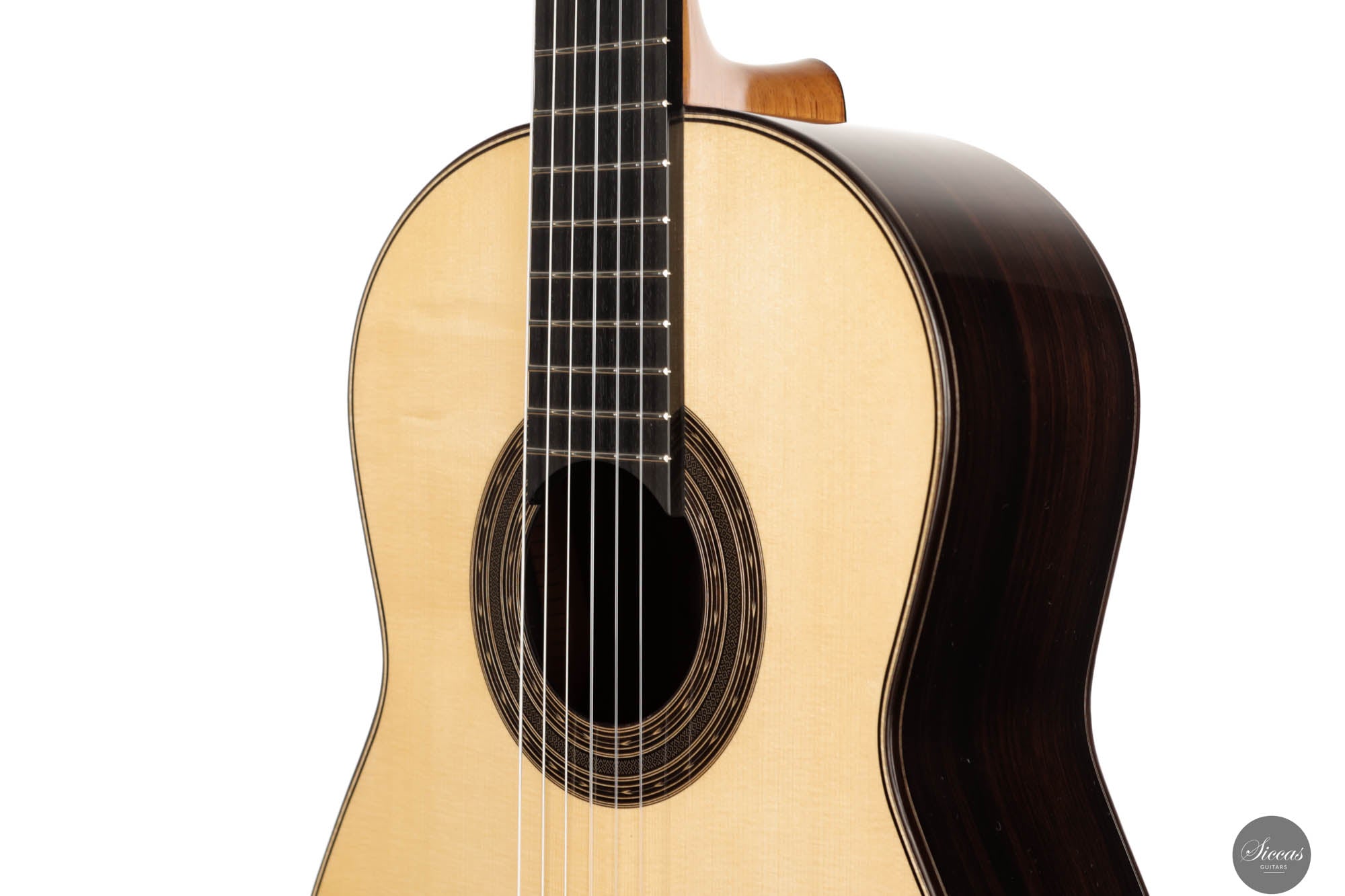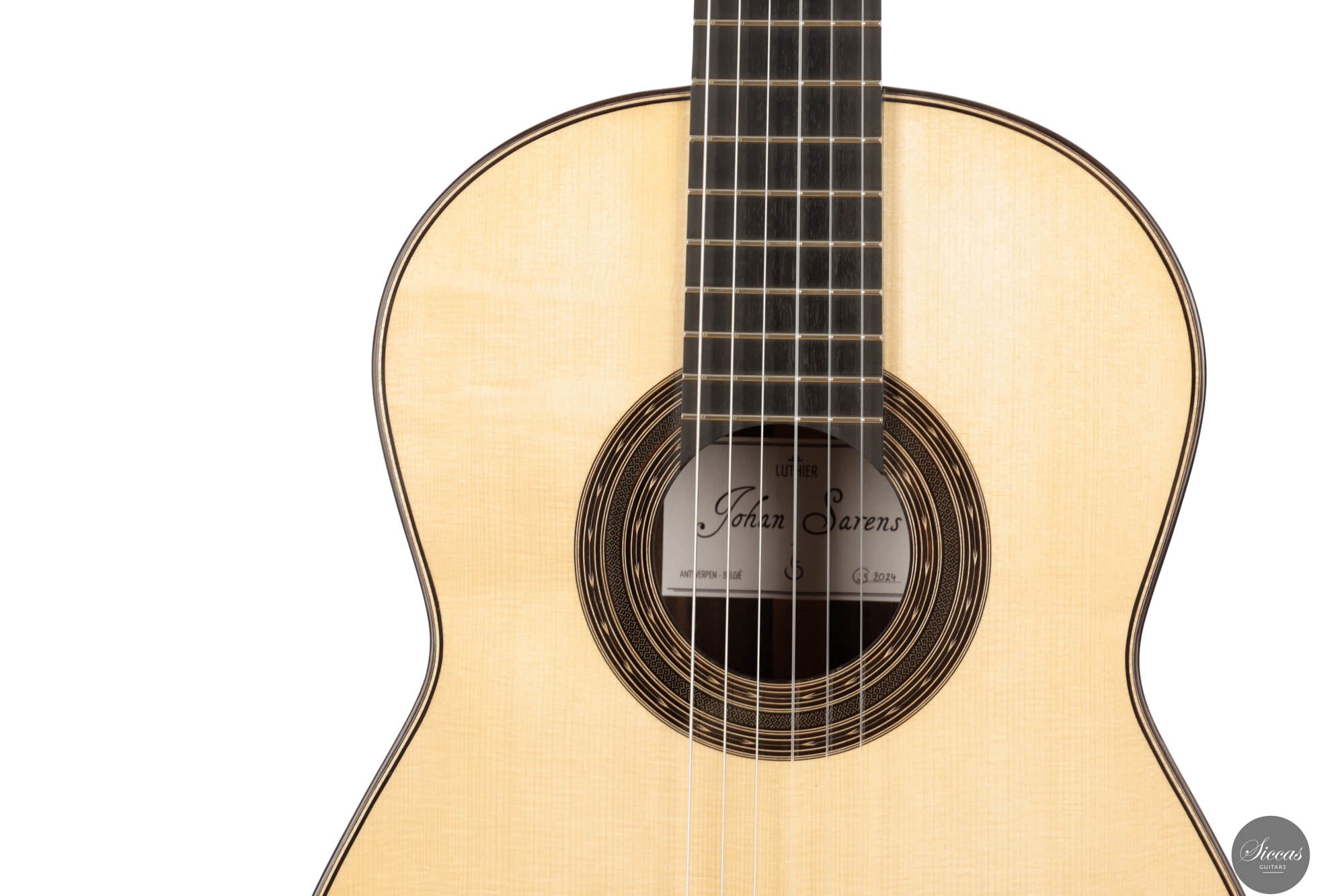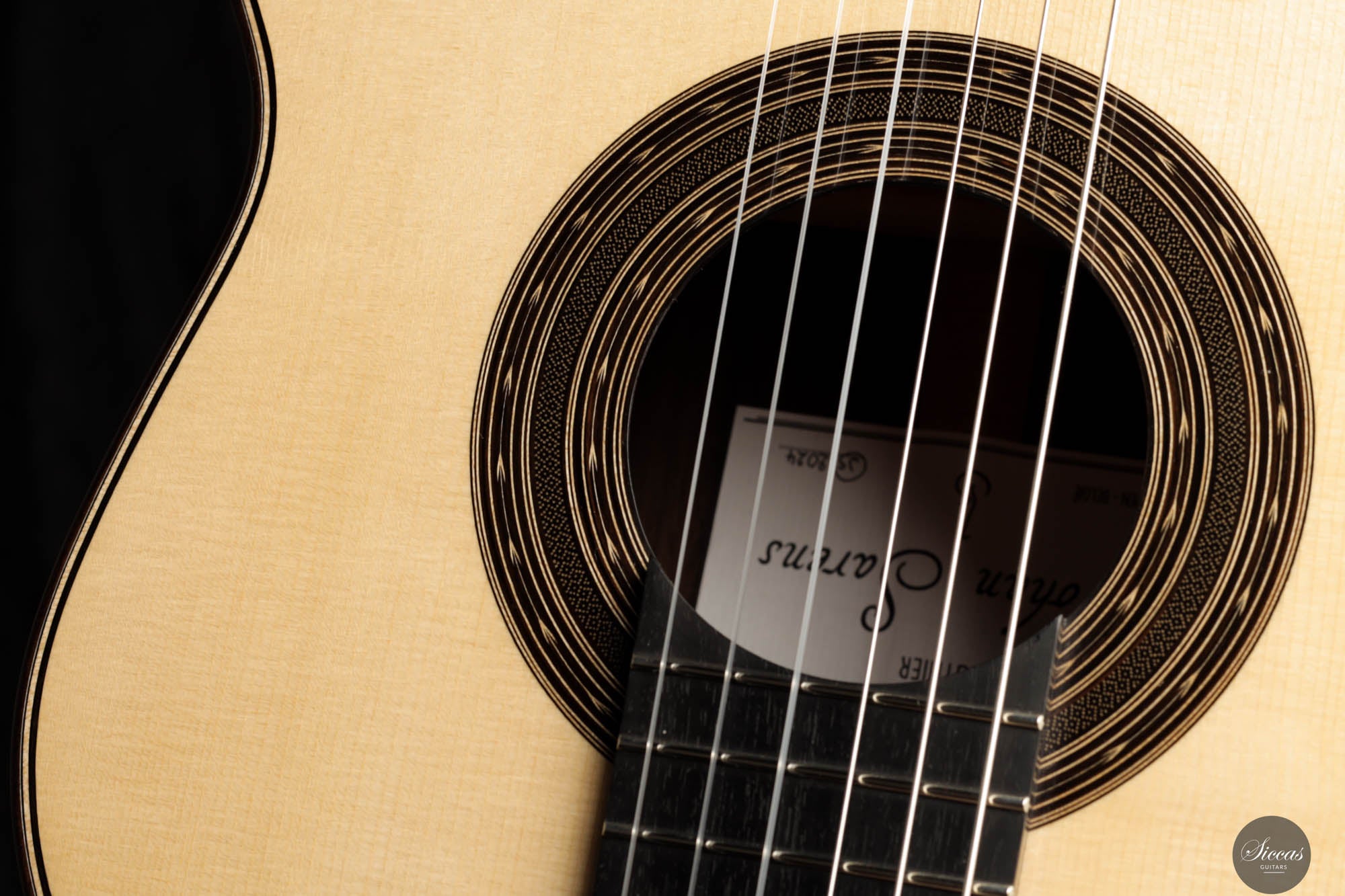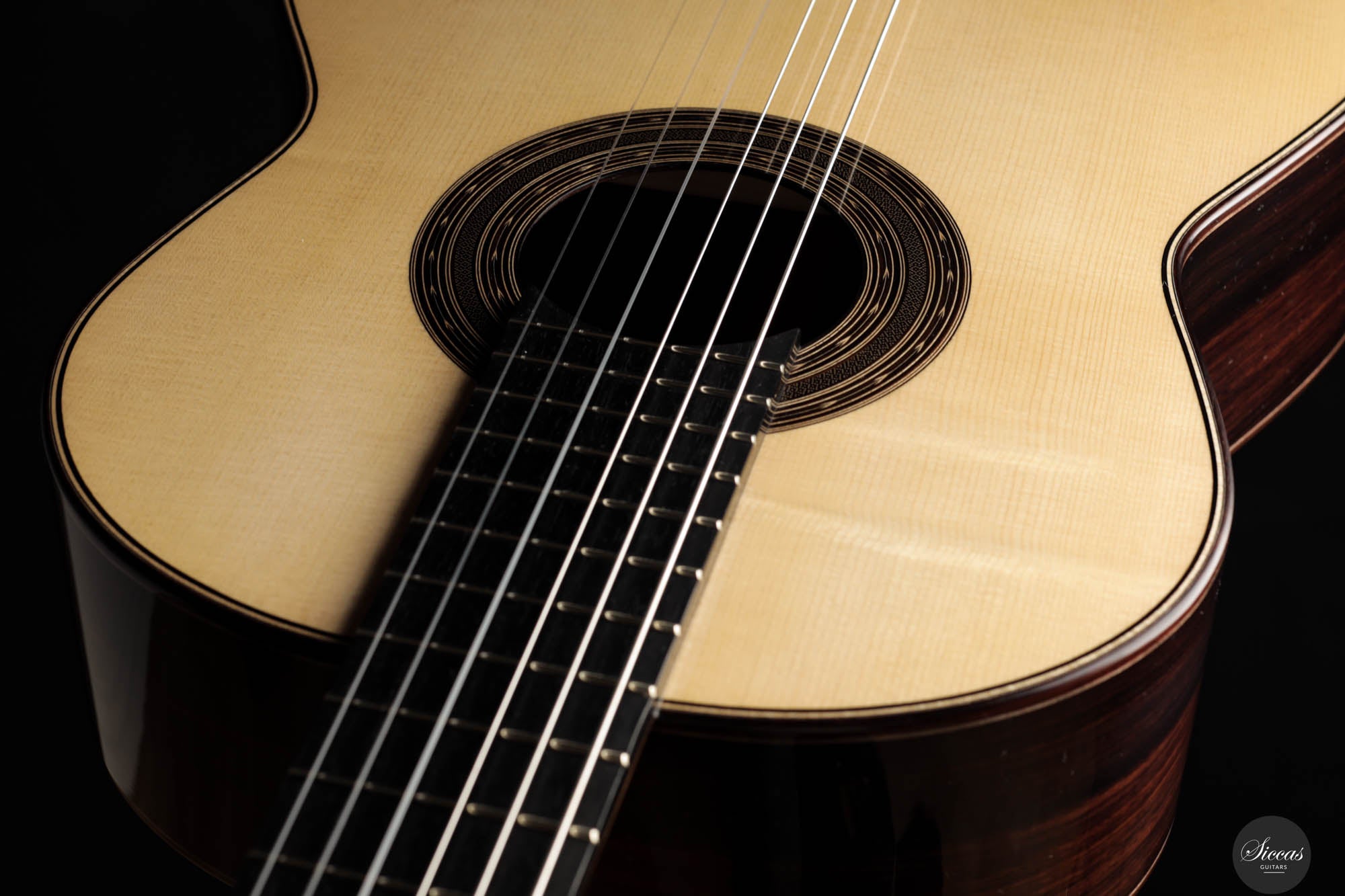 Visually, the guitar presents a harmony of shapes and proportions, reflecting the meticulous attention to detail that characterizes the finest examples of guitar making. The sparkling rosette stands out as a particularly captivating feature, drawing the eye and highlighting the instrument's aesthetic appeal. This rosette, coupled with the guitar's overall design, makes it not just a musical instrument but a piece of art that commands admiration. Its well-balanced form factor not only contributes to the guitar's stunning appearance but also to its playability, offering a comfortable and engaging experience for the musician.