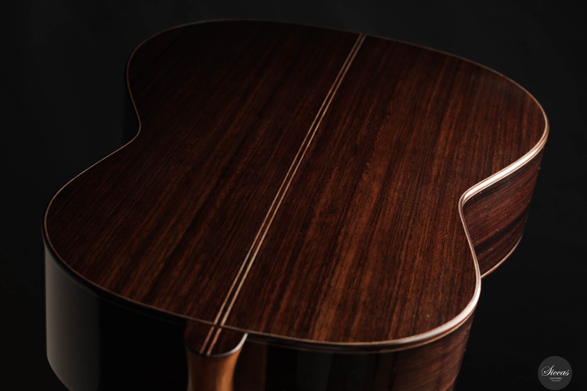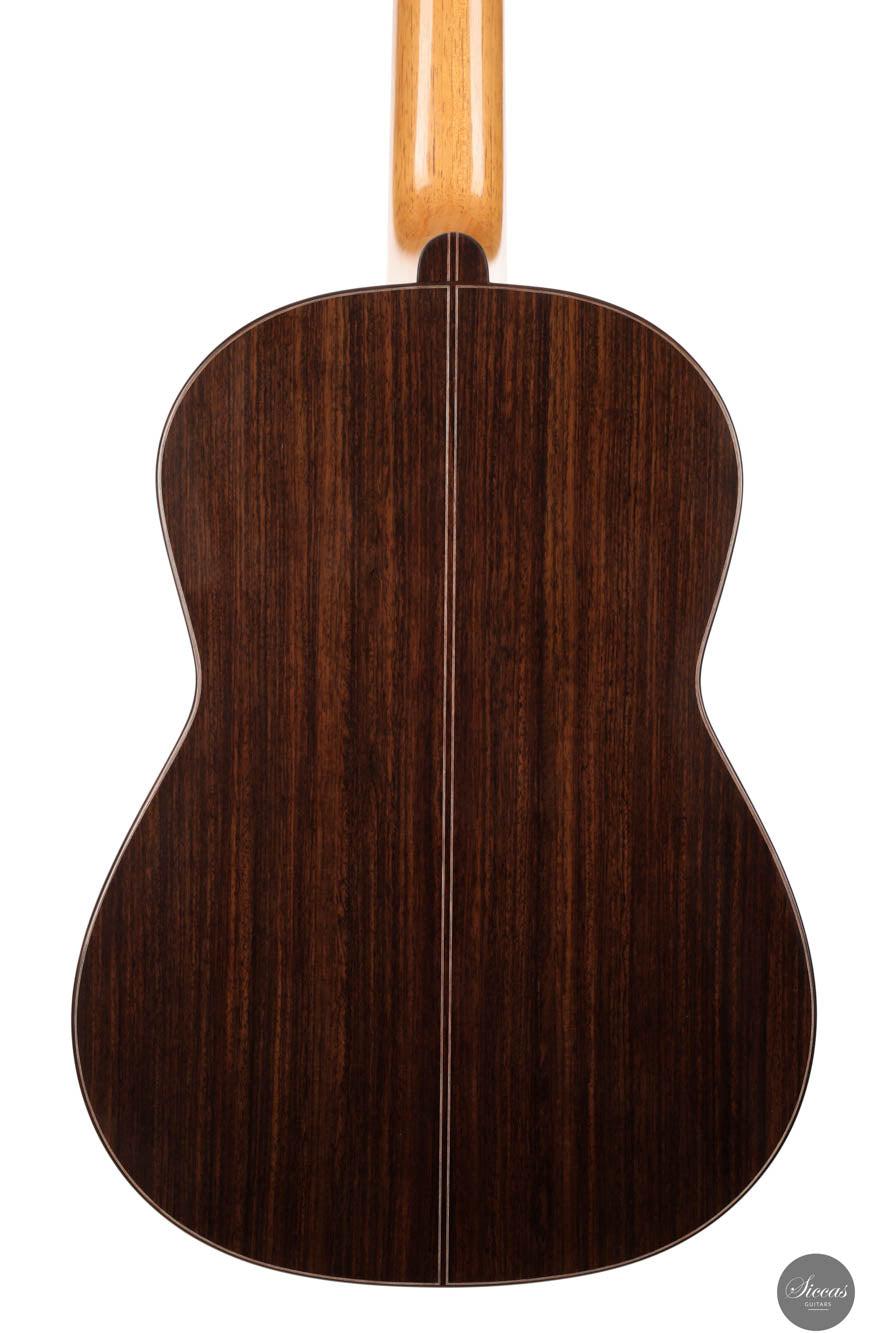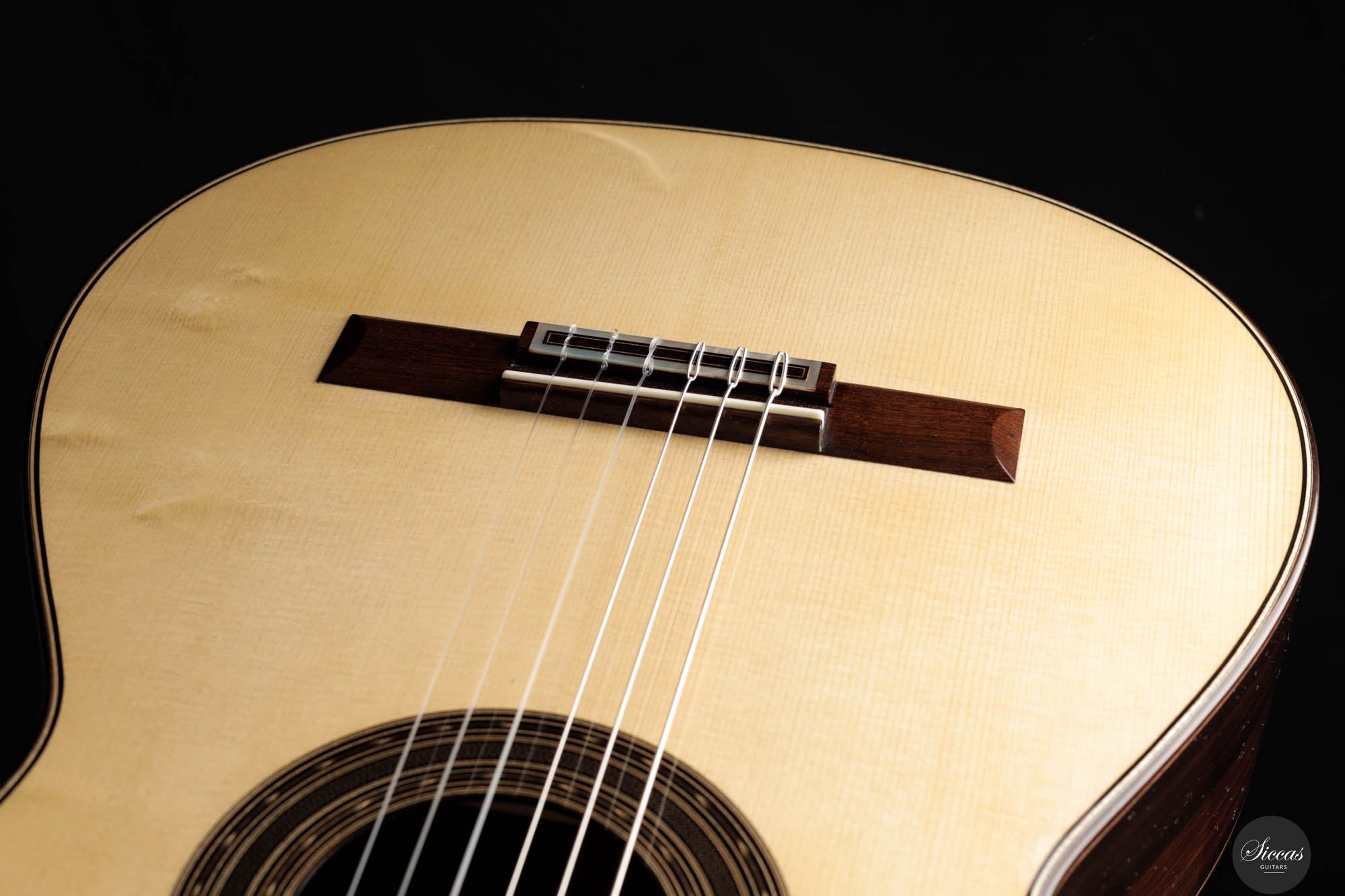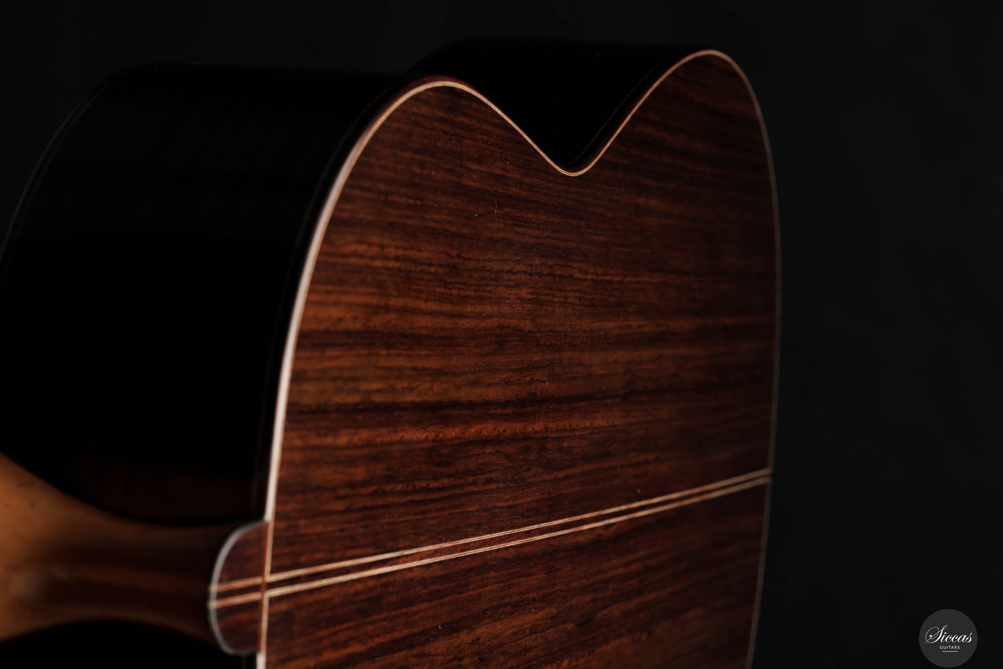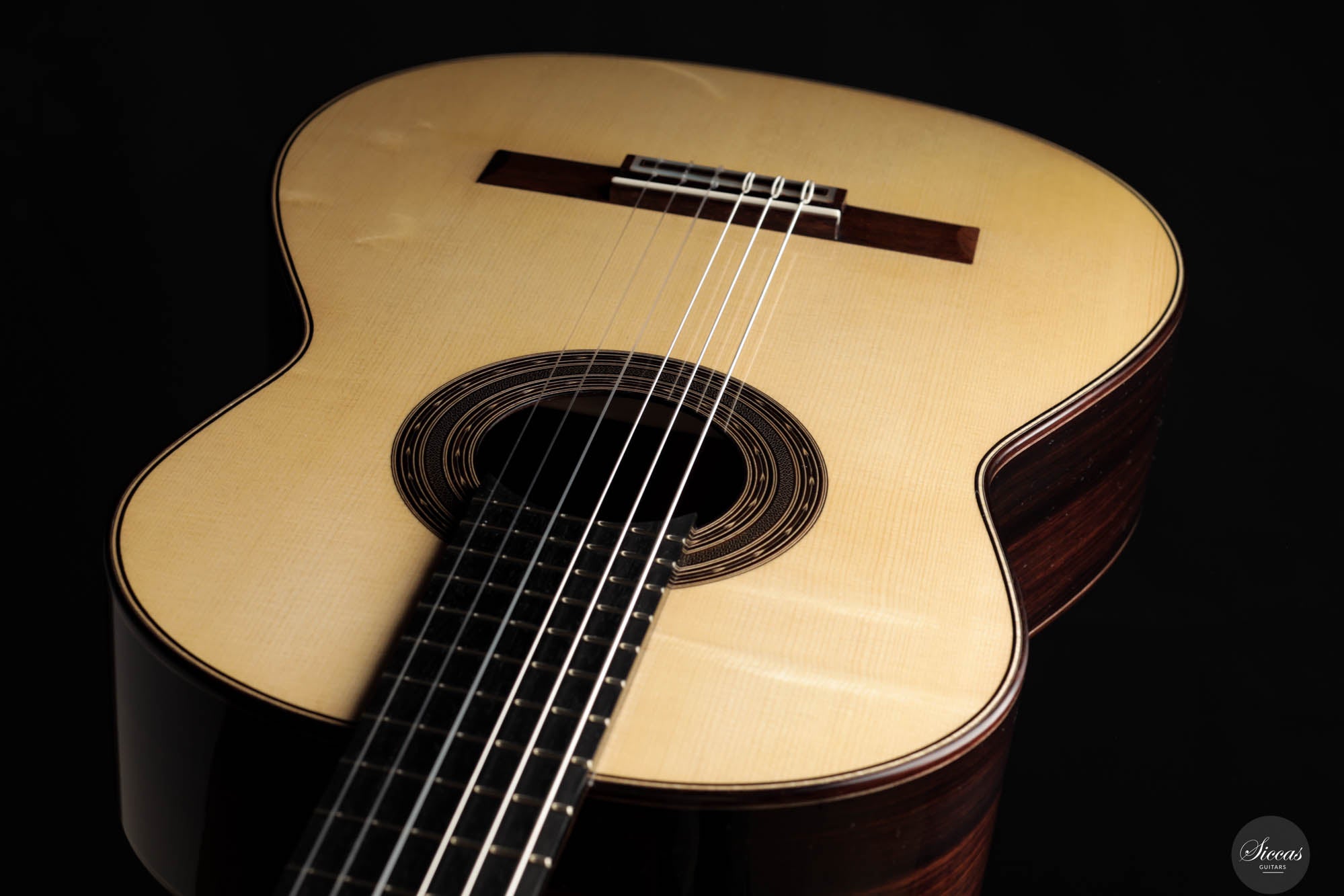 Visually, the guitar presents a harmony of shapes and proportions, reflecting the meticulous attention to detail that characterizes the finest examples of guitar making. The sparkling rosette stands out as a particularly captivating feature, drawing the eye and highlighting the instrument's aesthetic appeal. This rosette, coupled with the guitar's overall design, makes it not just a musical instrument but a piece of art that commands admiration. Its well-balanced form factor not only contributes to the guitar's stunning appearance but also to its playability, offering a comfortable and engaging experience for the musician.