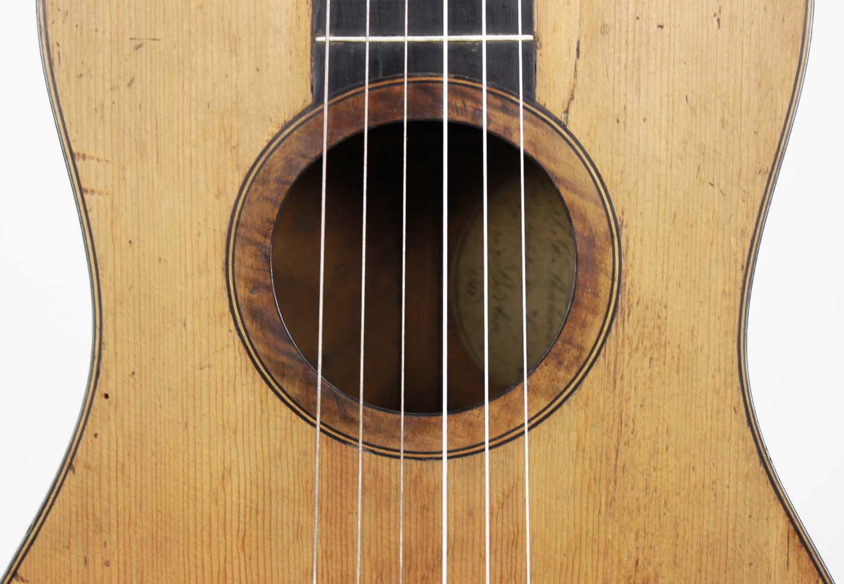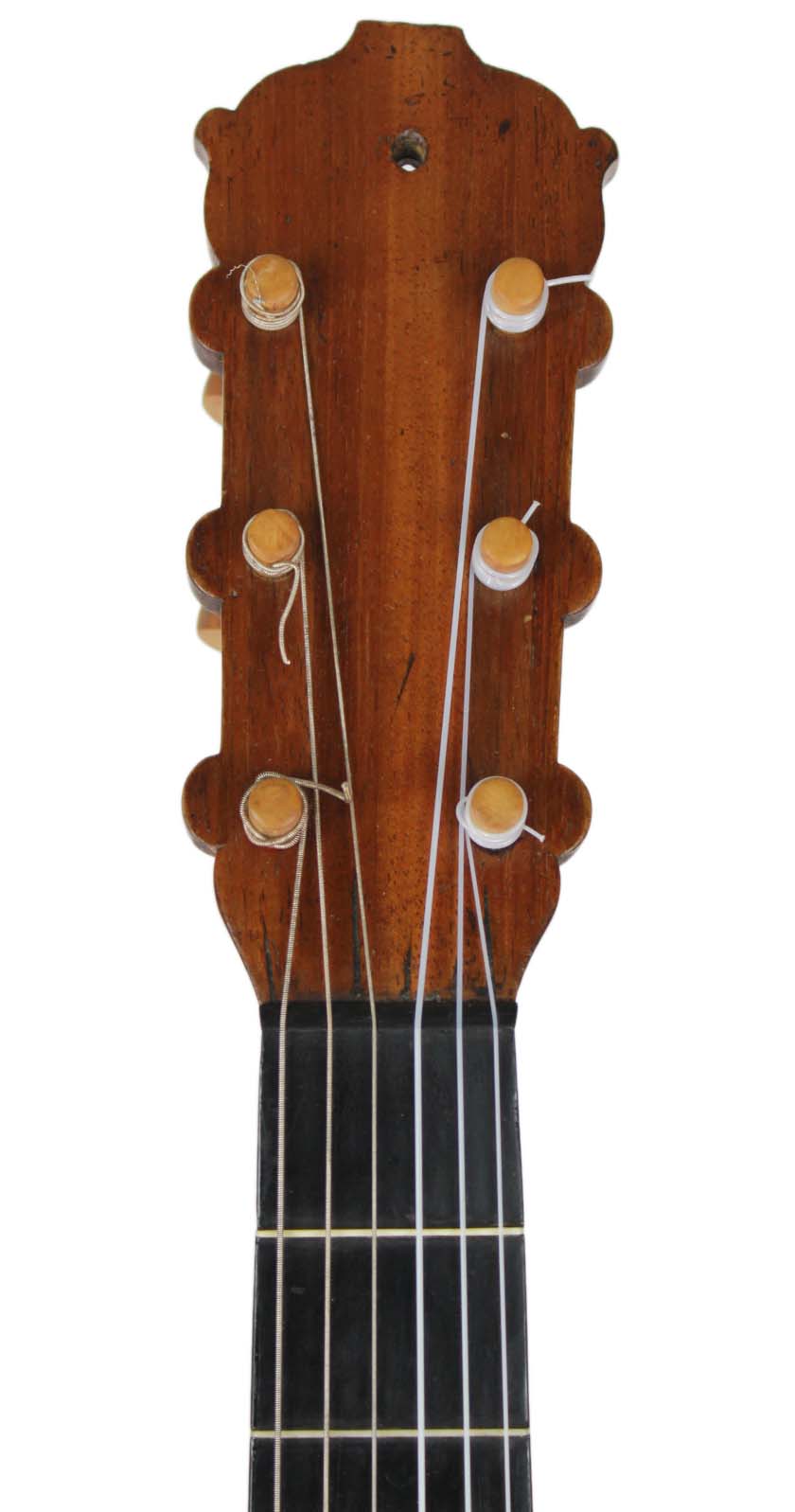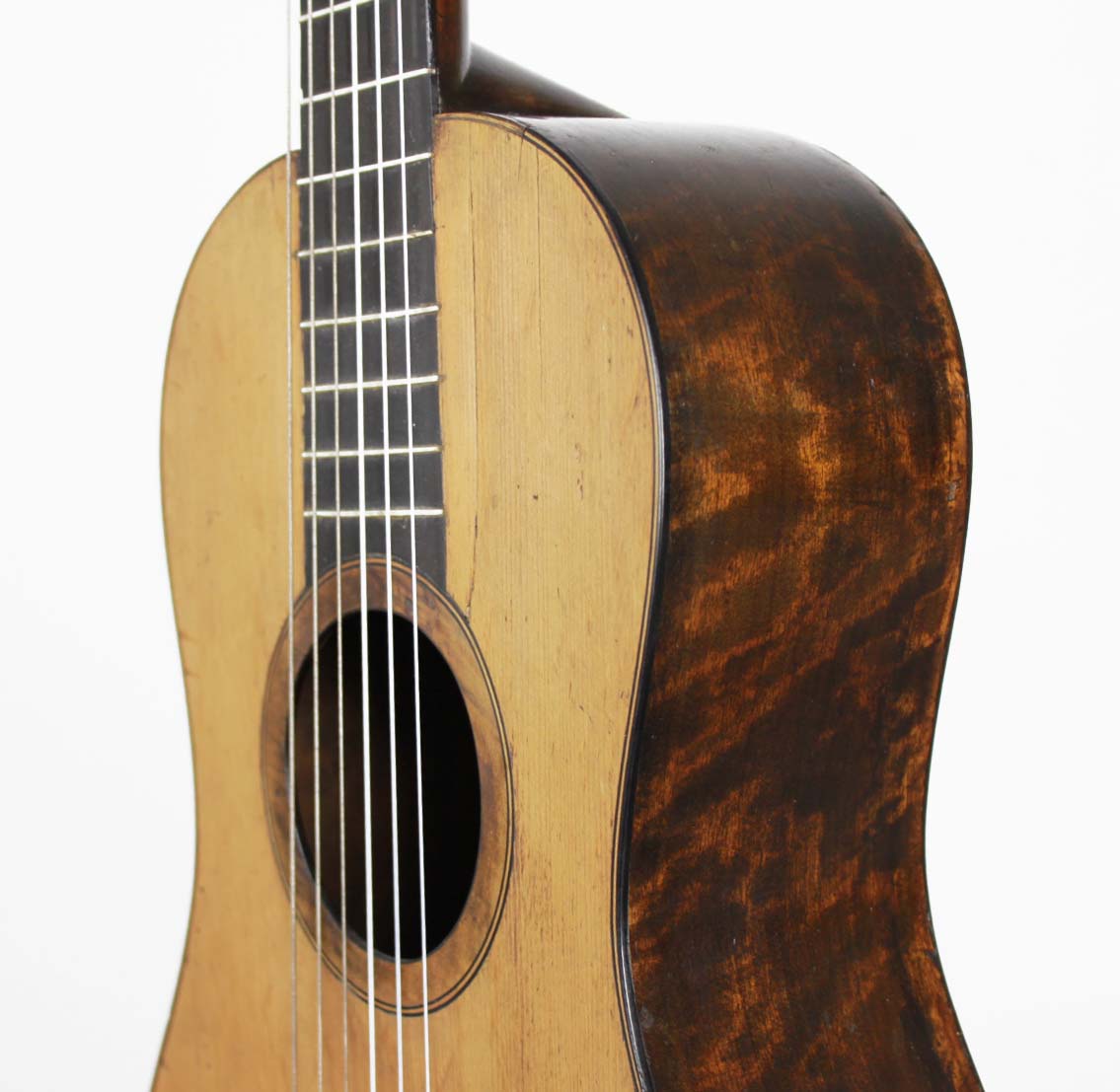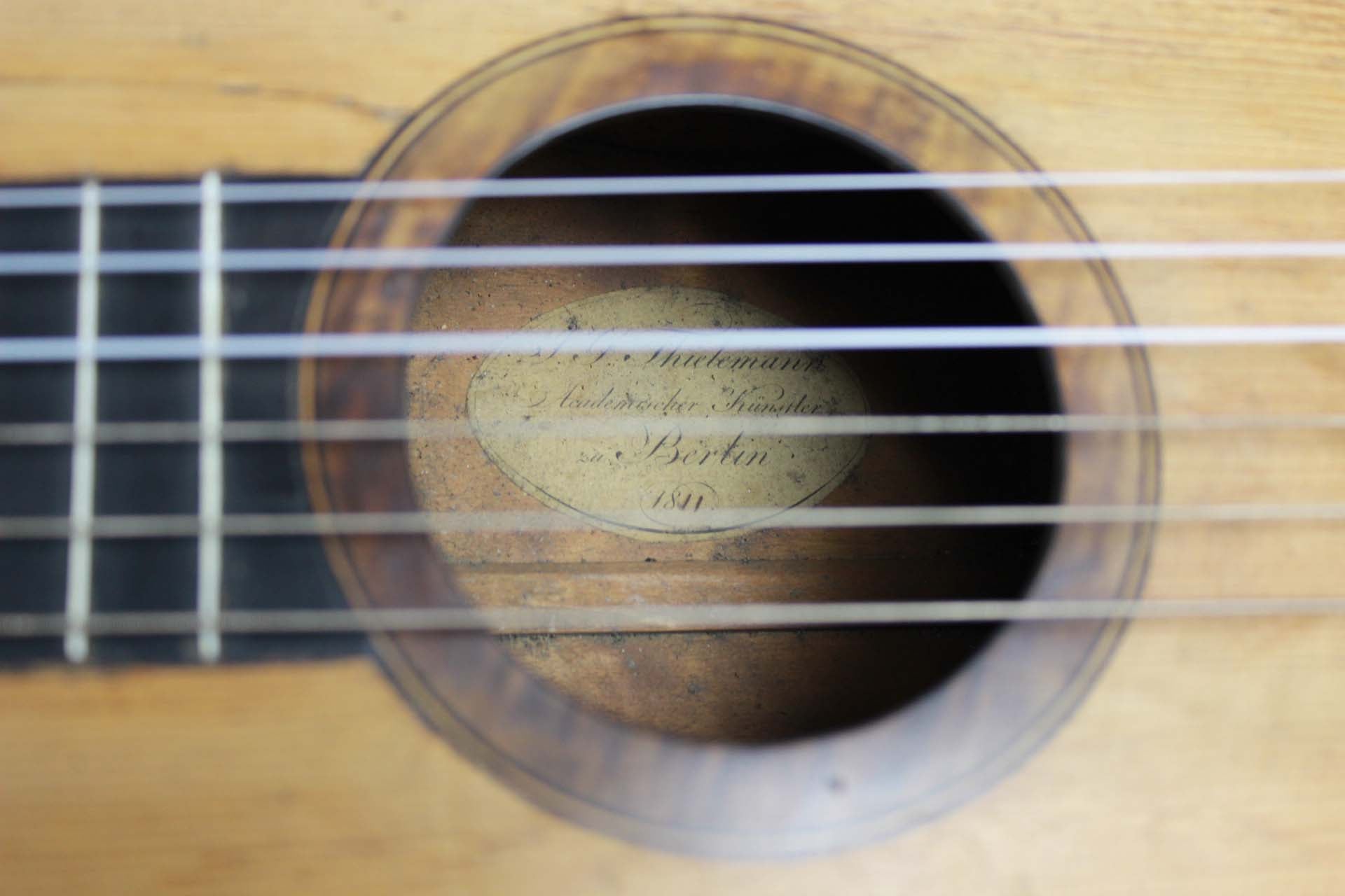 Johann Gottlob Thielemann was born around 1765 and died in 1821. He was the most important guitar builder in Berlin. His guitars are fine build instruments with impressive sound. Thielemann often used dark colored woods, like in this case, dark colored pear wood for back and sides. The top is made of fine spruce. Typical for Thielemann’s style is also the broad rosette that is also made of pear wood. For the neck he used alder. This guitar was built in 1811 and is labeled on the ground of the back. The pegs were replaced, but are made in the same style of other Thielemann guitars. The mother of pearl inlays on the fretboard are also not original and were added probably at the beginning of the 20th century. The overall condition is remarkable for an instrument that is now over 200 years old.