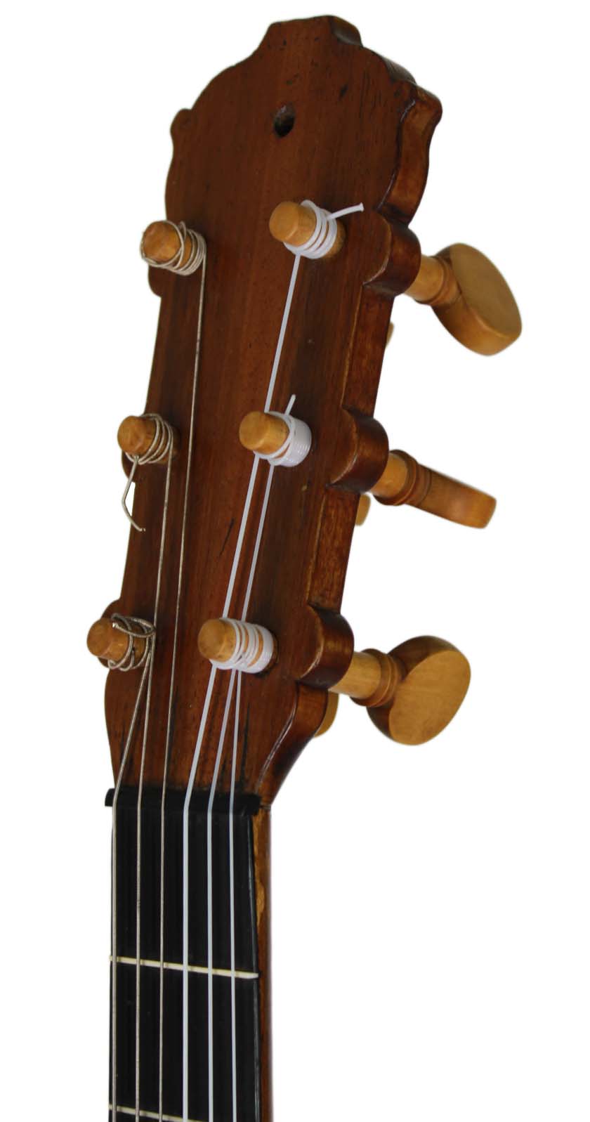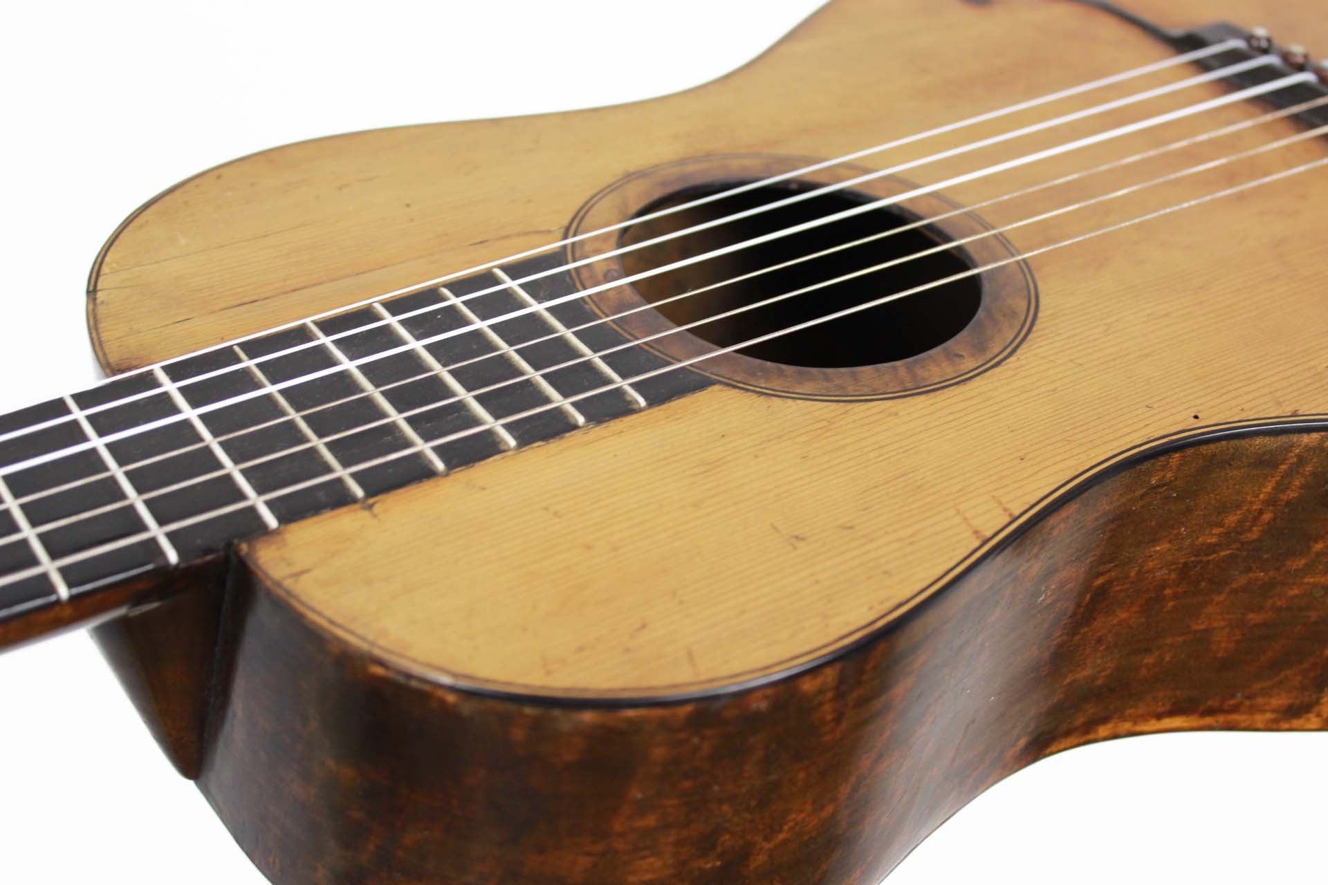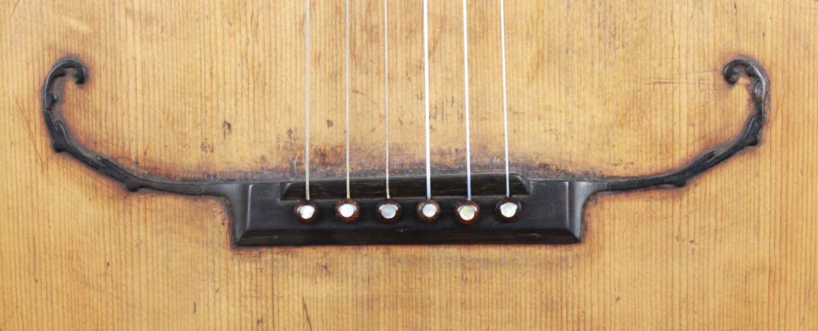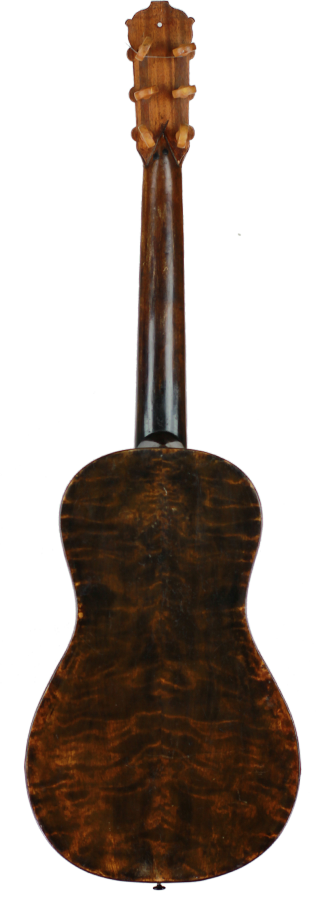 Johann Gottlob Thielemann was born around 1765 and died in 1821. He was the most important guitar builder in Berlin. His guitars are fine build instruments with impressive sound. Thielemann often used dark colored woods, like in this case, dark colored pear wood for back and sides. The top is made of fine spruce. Typical for Thielemann’s style is also the broad rosette that is also made of pear wood. For the neck he used alder. This guitar was built in 1811 and is labeled on the ground of the back. The pegs were replaced, but are made in the same style of other Thielemann guitars. The mother of pearl inlays on the fretboard are also not original and were added probably at the beginning of the 20th century. The overall condition is remarkable for an instrument that is now over 200 years old.