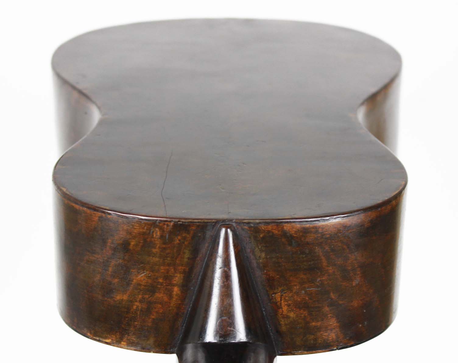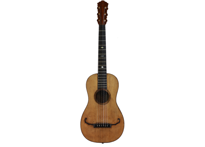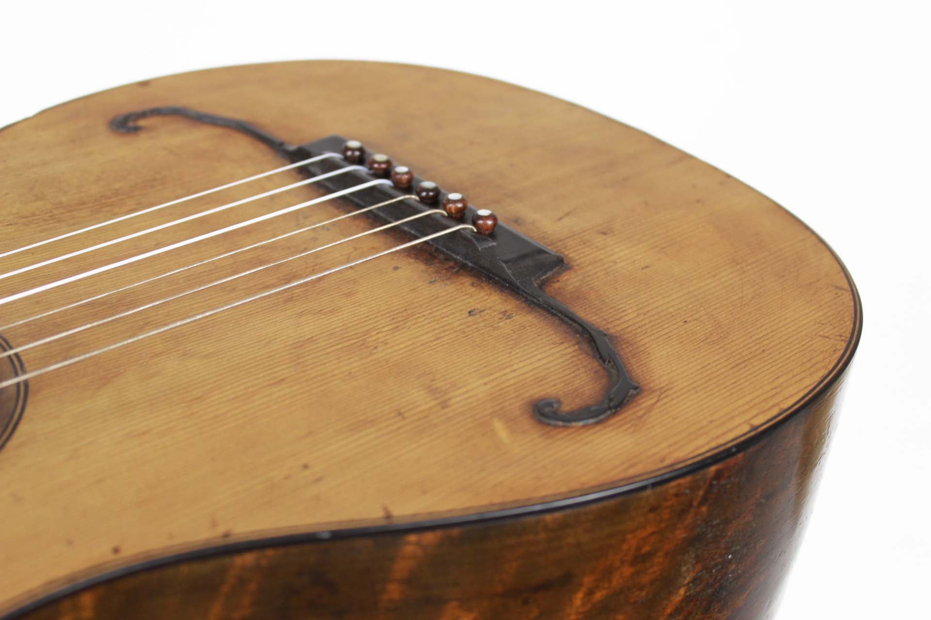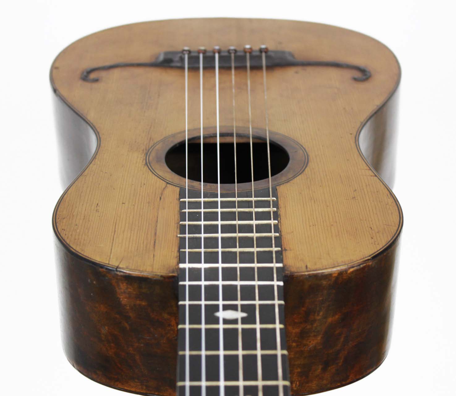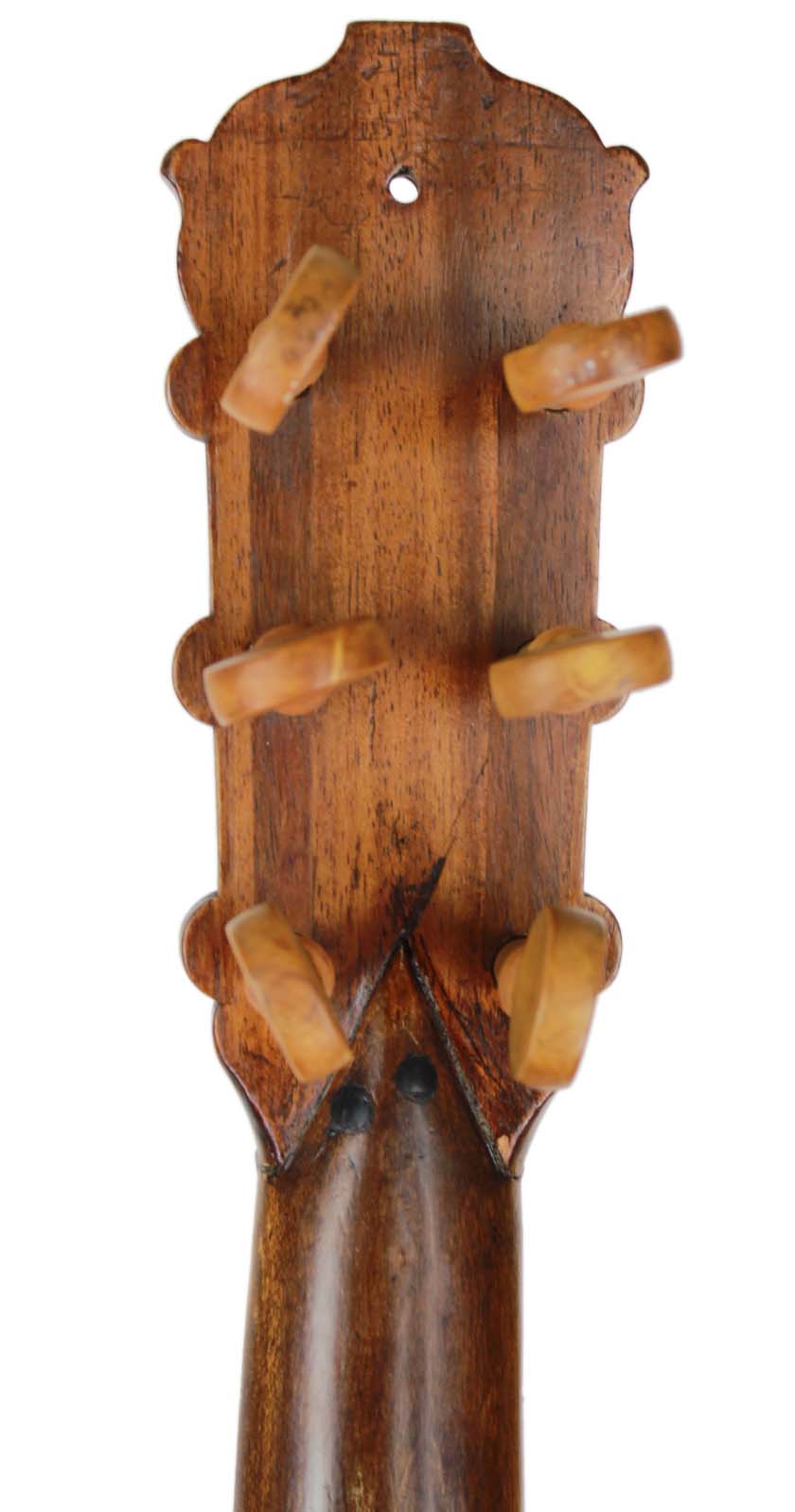 Johann Gottlob Thielemann was born around 1765 and died in 1821. He was the most important guitar builder in Berlin. His guitars are fine build instruments with impressive sound. Thielemann often used dark colored woods, like in this case, dark colored pear wood for back and sides. The top is made of fine spruce. Typical for Thielemann’s style is also the broad rosette that is also made of pear wood. For the neck he used alder. This guitar was built in 1811 and is labeled on the ground of the back. The pegs were replaced, but are made in the same style of other Thielemann guitars. The mother of pearl inlays on the fretboard are also not original and were added probably at the beginning of the 20th century. The overall condition is remarkable for an instrument that is now over 200 years old.