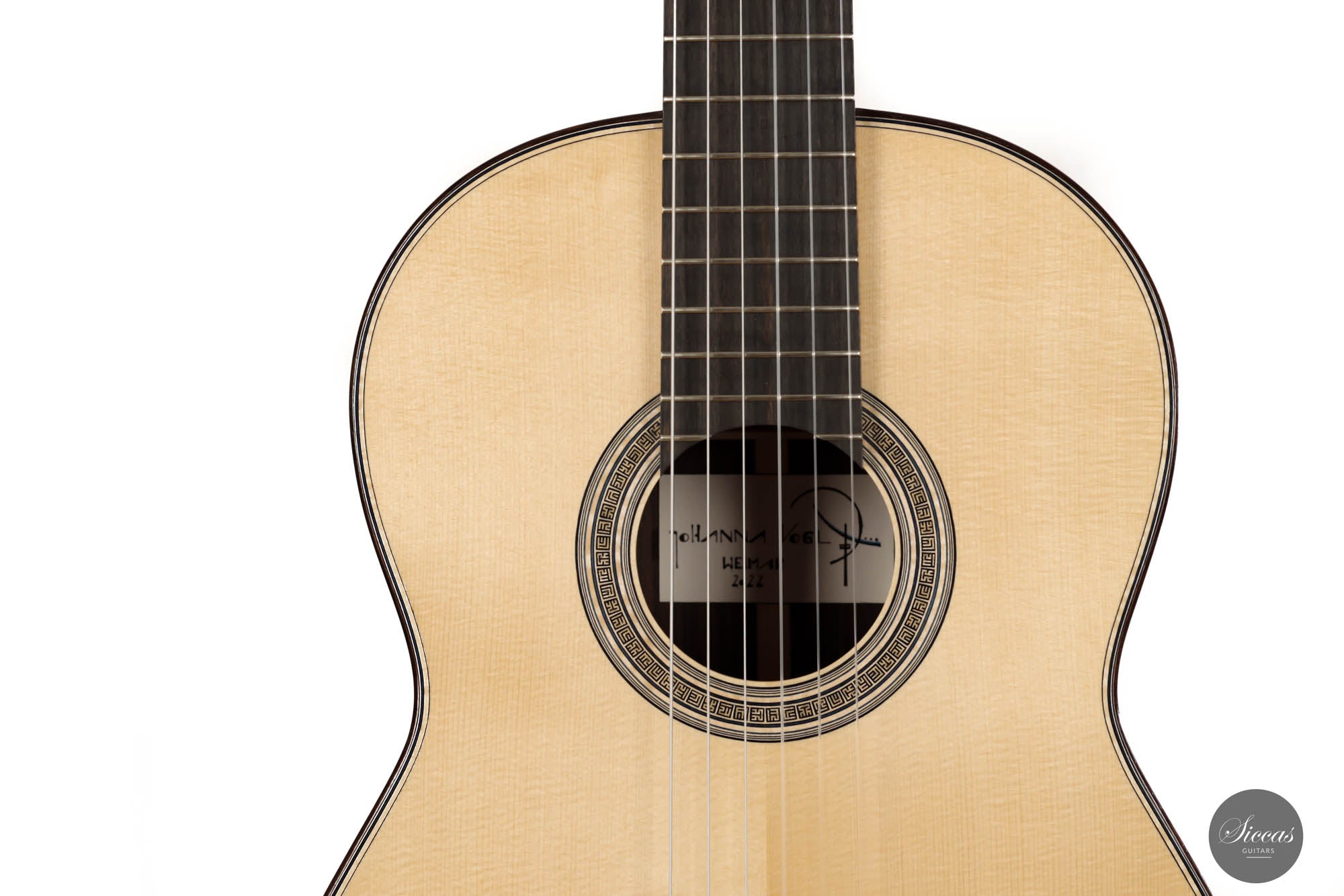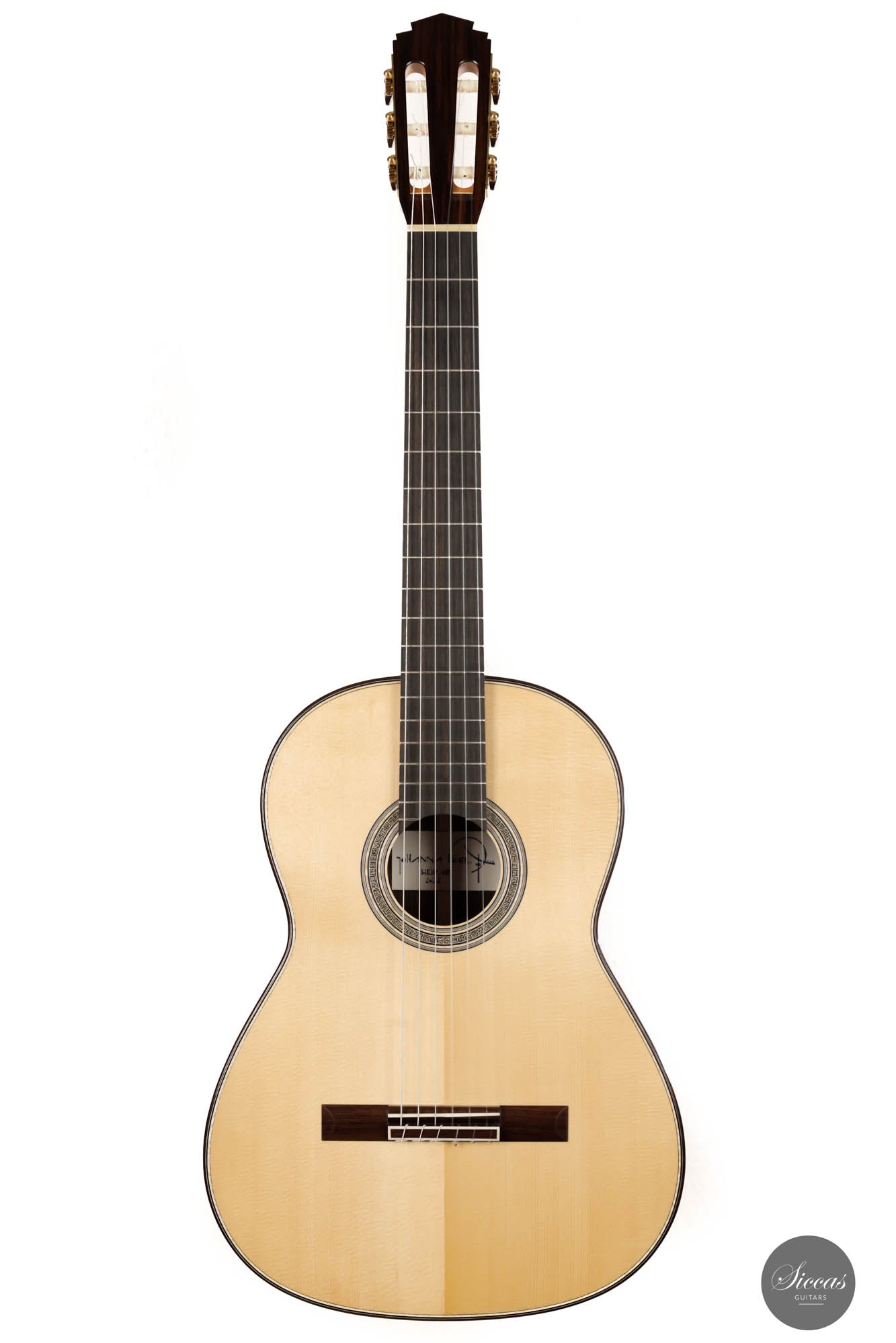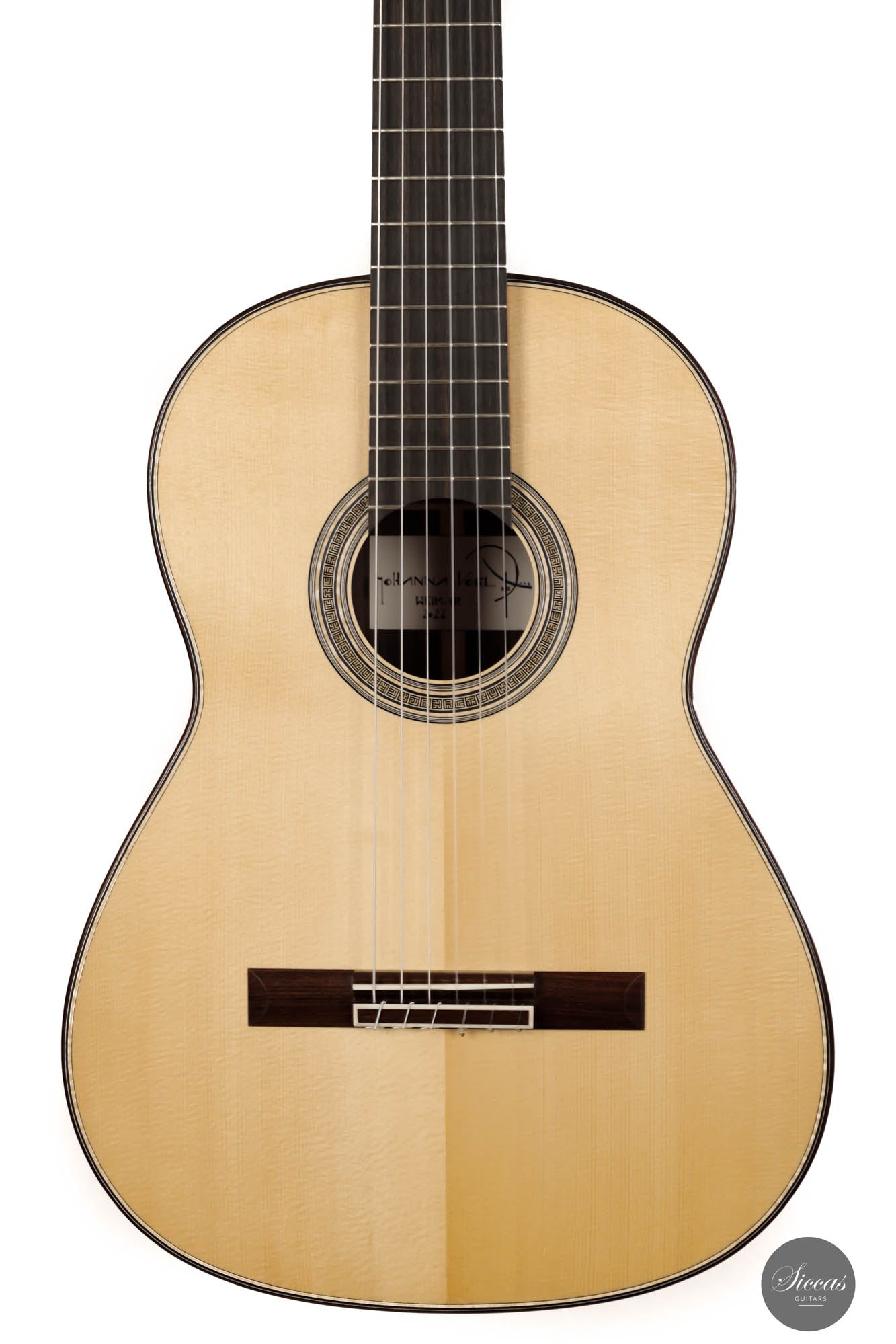 This beautiful instrument is a unique combination of a traditional Spanish guitar and a modern concert classical guitar. It has a traditional design that Jose L. Romanillos heavily influenced. Yet, it also features some modern elements in contemporary guitar making, such as elevated fingerboard, significant volume and projection, and excellent playability. This guitar displays Johanna's very high level of craftsmanship and artistry. The spruce soundboard was tuned to the F/F#, creating deep and hunting bass characteristics. Meanwhile, the crystal-clear trebles match the overall voicings in a charming proportion. This fine instrument is a true concert guitar that will fulfill the need of a guitarist of any level and for any concert situation.