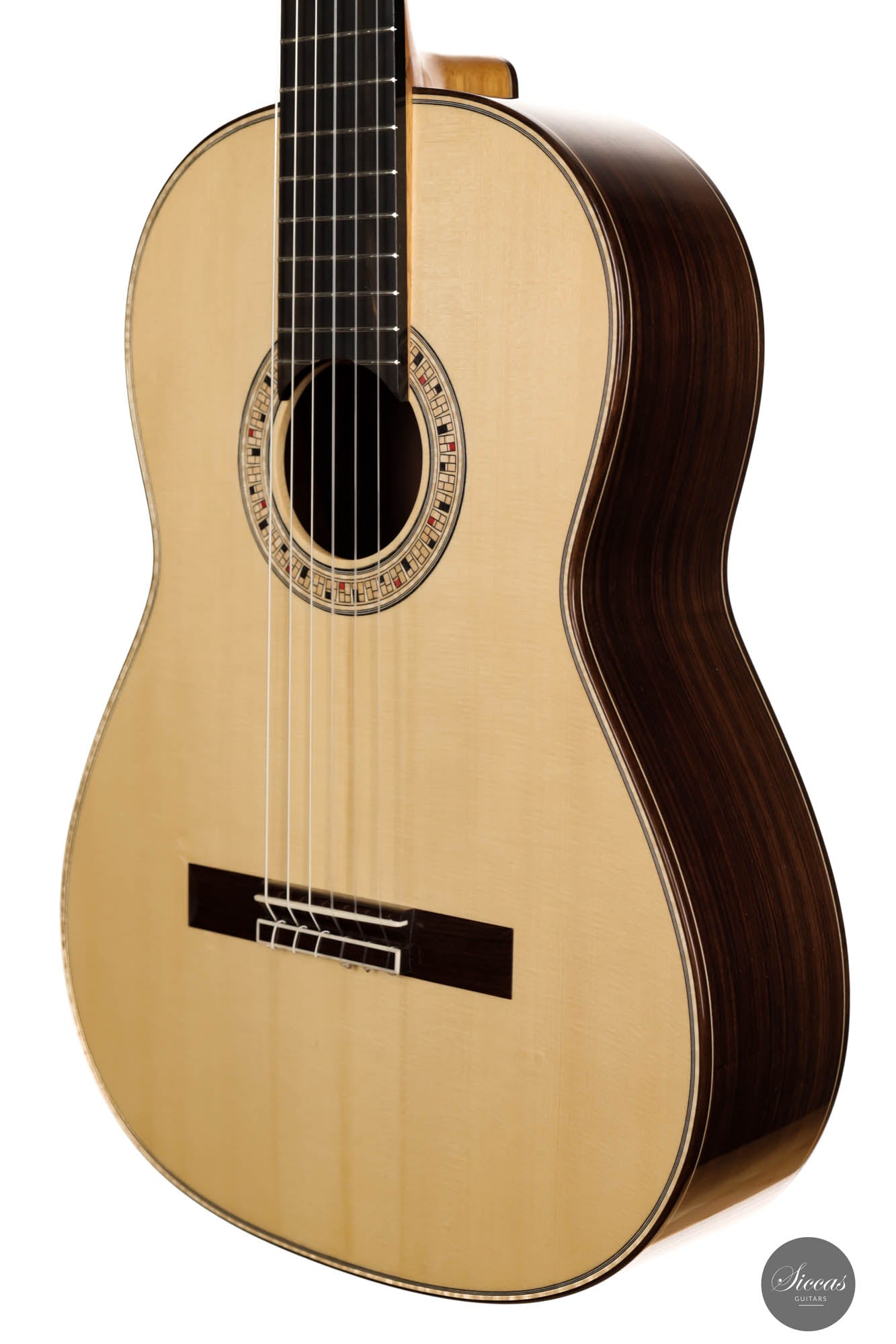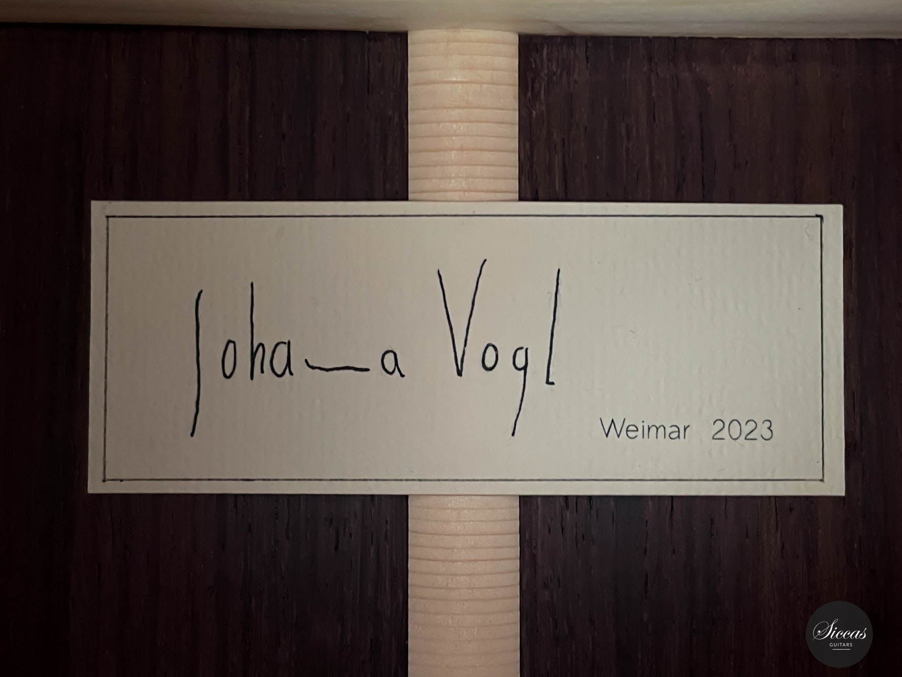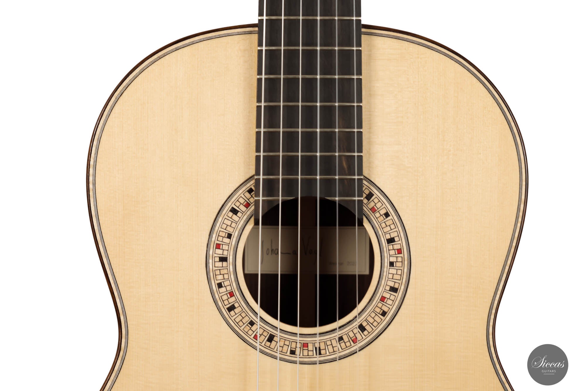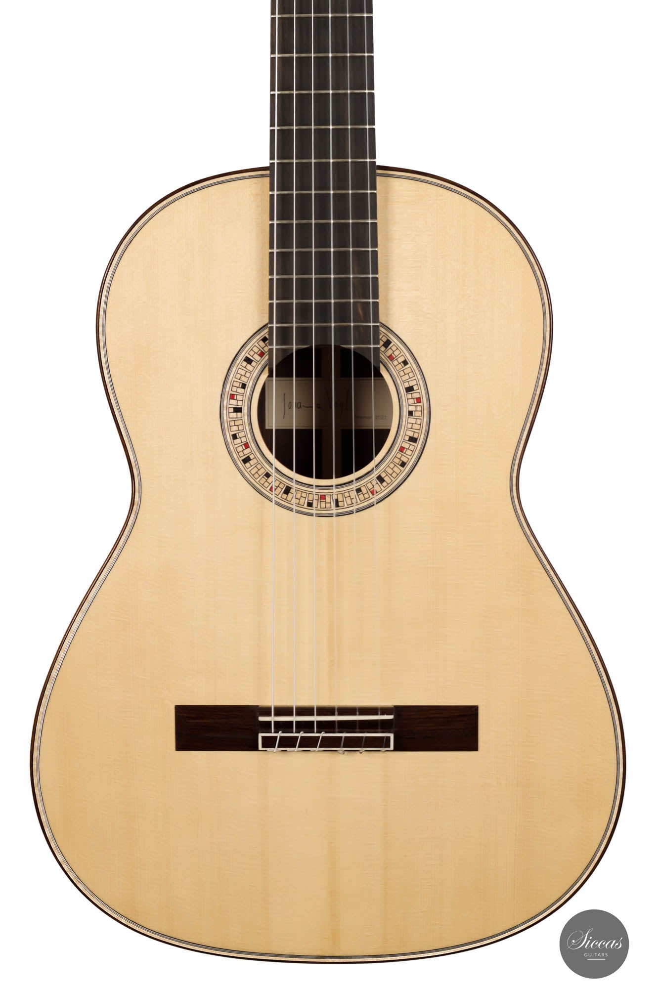 The 2023 Johanna Vogl guitar is an exceptional musical instrument that seamlessly blends the rich heritage of a traditional Spanish guitar with the innovation and craftsmanship of a modern concert classical guitar. Drawing inspiration from the esteemed luthier Jose L. Romanillos, this guitar exhibits a timeless design while incorporating contemporary elements that exemplify advancements in guitar construction. Meticulously crafted by Johanna Vogl, this instrument showcases her remarkable skill and artistic vision. The guitar features a resonant spruce soundboard masterfully tuned to E/F, resulting in profound and captivating bass characteristics. The deep and haunting tones produced by this instrument's soundboard elevate its overall resonance and tonal quality. Complementing the bass notes are crystal-clear trebles that possess a charming and well-balanced presence, ensuring a harmonious blend across the entire tonal range. This careful voicing of the instrument creates a captivating sound that is truly captivating to both players and listeners alike. Designed to meet the demands of guitarists at any skill level and for various concert settings, this fine instrument offers exceptional playability and versatility. The elevated fingerboard enhances playability, allowing for effortless navigation across the fretboard and facilitating complex musical passages. Moreover, the guitar boasts significant volume and projection, ensuring the player's musical expression is projected with clarity and brilliance in any performance venue. The guitar's minimalist aesthetic is noteworthy, characterized by tastefully understated design elements. The rosette and headstock design exude elegance and sophistication, captivating the eye with their simplicity and refined beauty. The clean lines and subtle details of these visual components are a testament to Johanna Vogl's attention to detail and commitment to creating instruments that are as visually captivating as they are sonically superior. In conclusion, the 2023 Johanna Vogl guitar represents an exquisite marriage between tradition and innovation in classical guitars. With its blend of traditional design influenced by Jose L. Romanillos and contemporary features such as an elevated fingerboard and exceptional volume, this instrument is an actual concert guitar that caters to the needs of guitarists at any level. The meticulous craftsmanship, with its captivating tonal qualities and minimalist aesthetic, make the Johanna Vogl guitar a remarkable instrument that will undoubtedly inspire and elevate the musical performances of its fortunate owners.