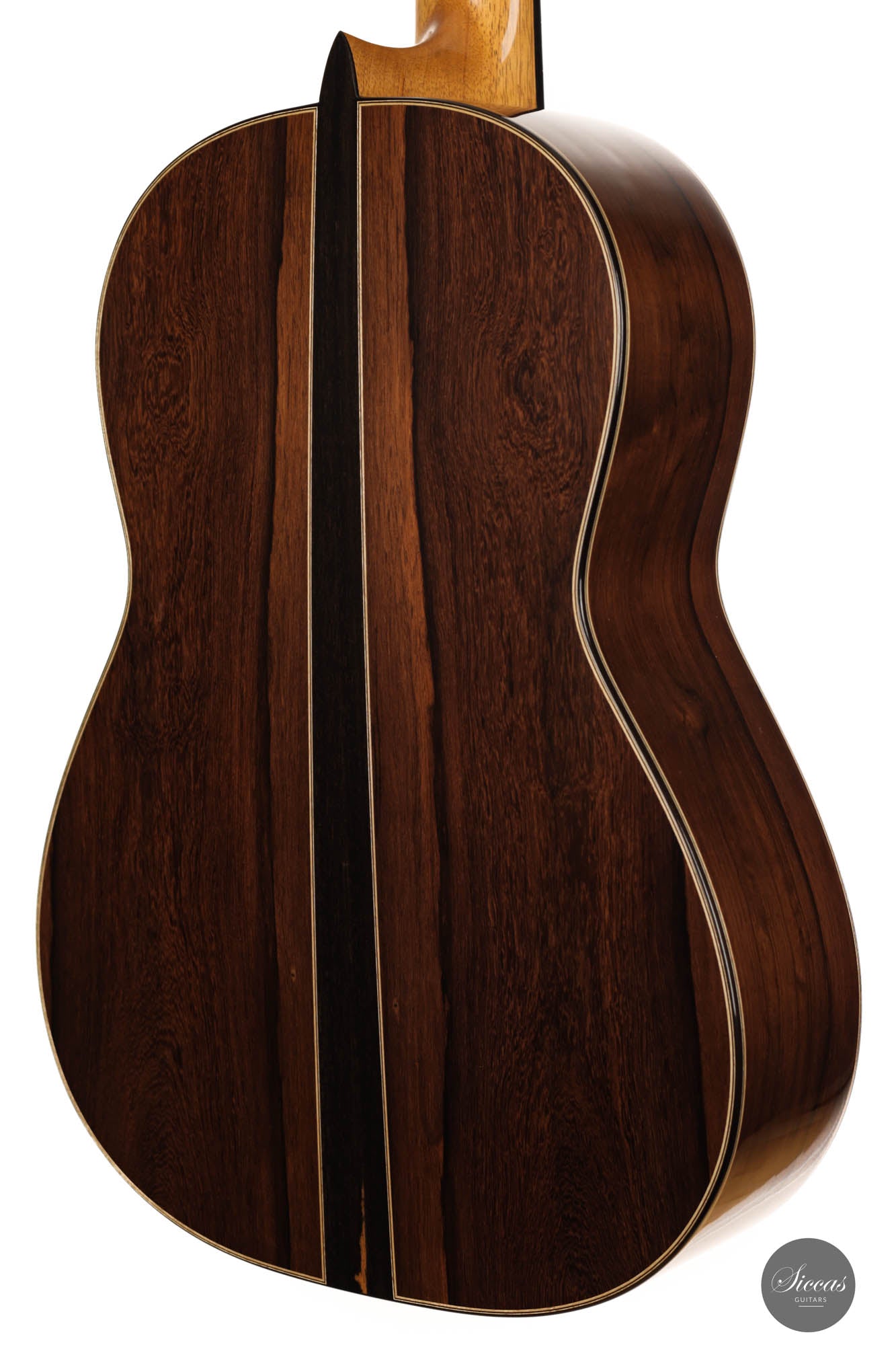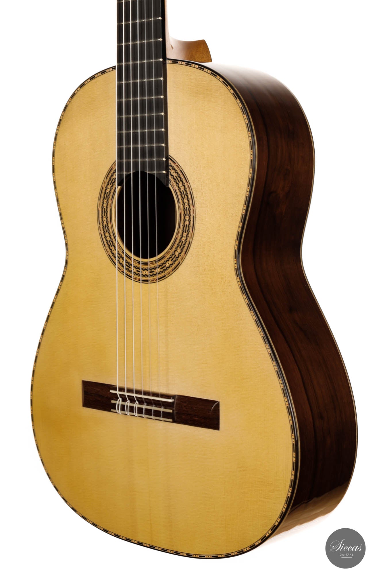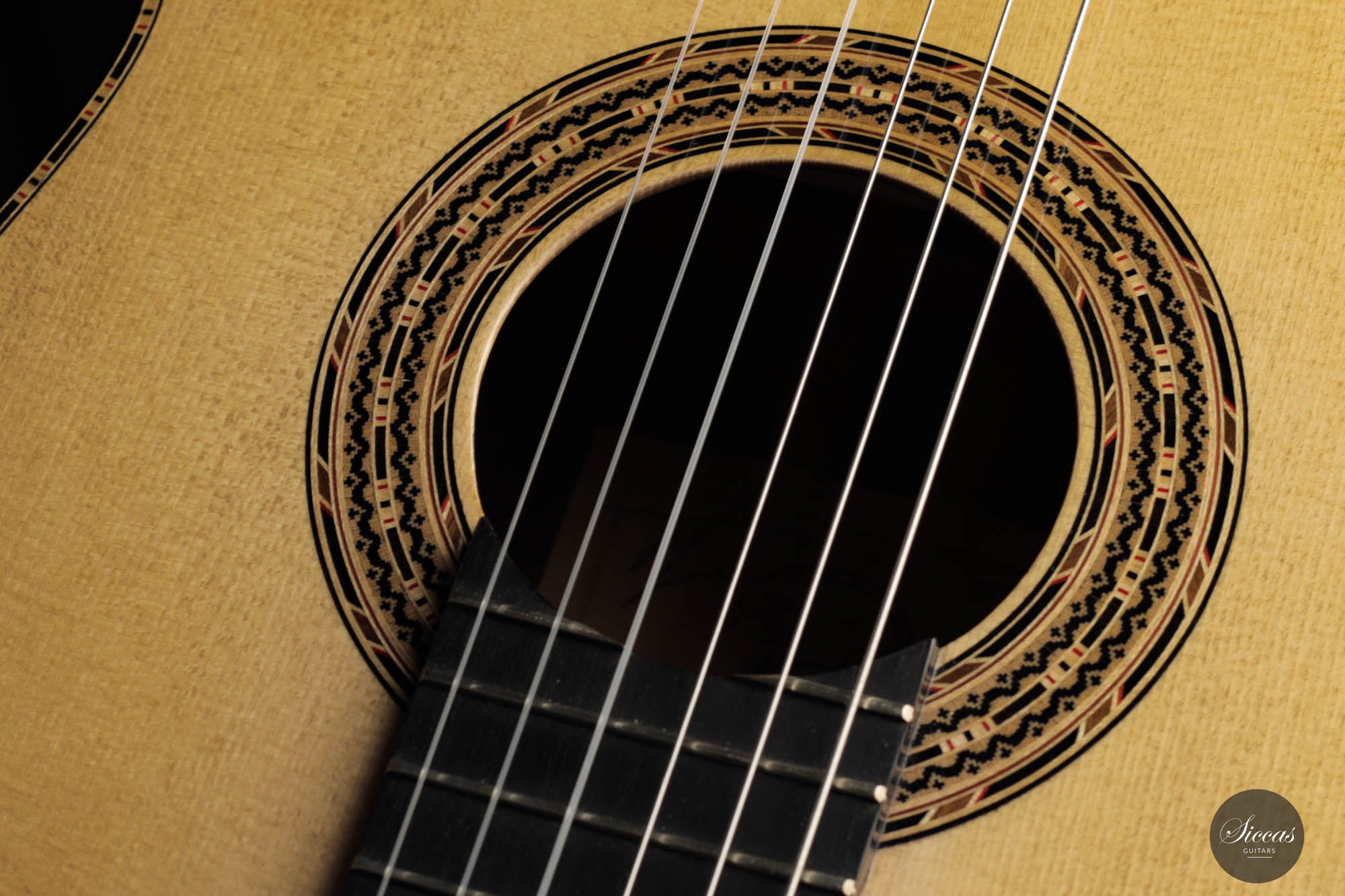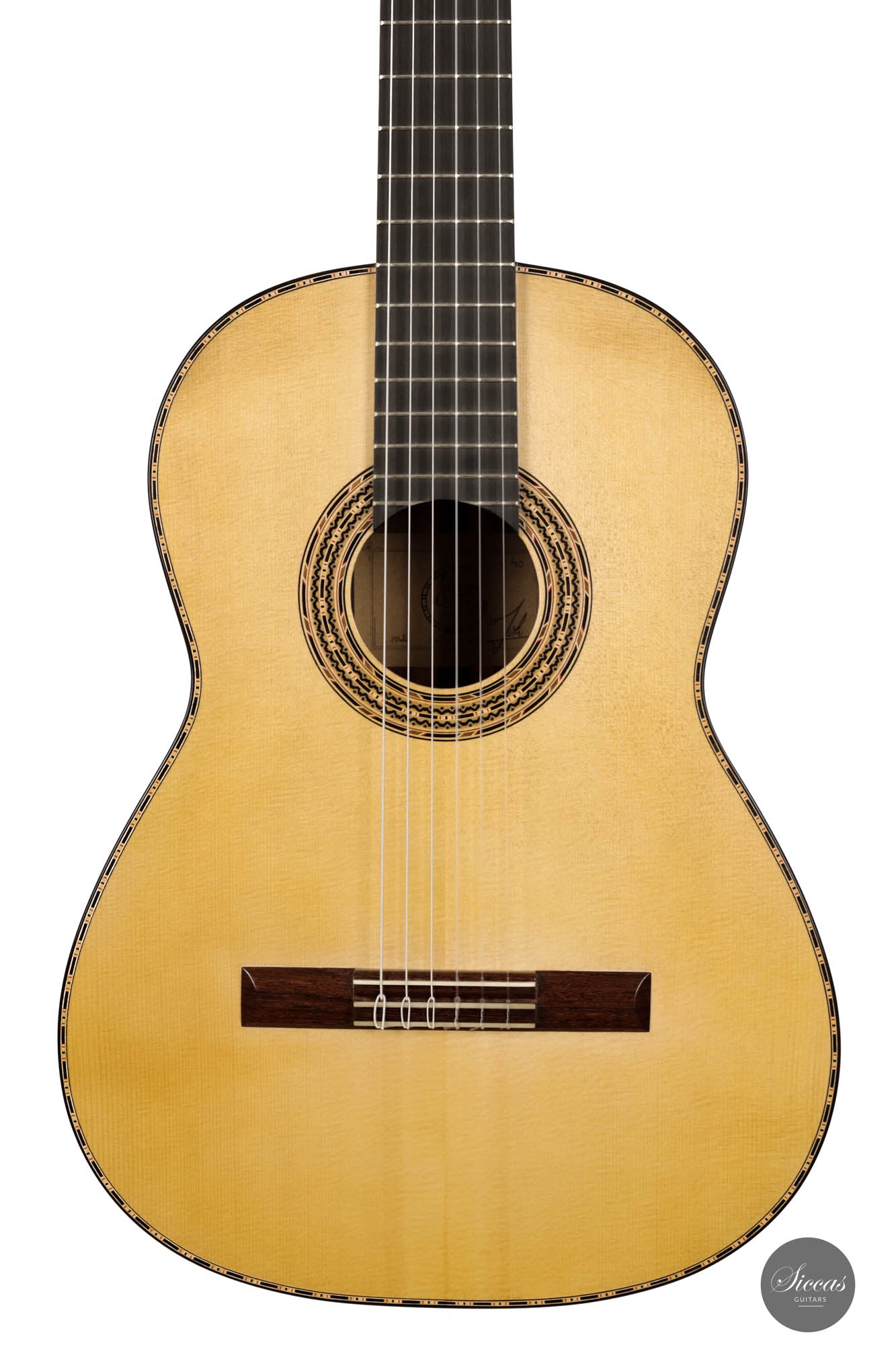 The 2023 Johannes T'Kindt "Romanillos" model guitar, inspired by the outstanding work of José Luis Romanillos, serves as an exemplary artifact of refined guitar craftsmanship. This instrument perfectly amalgamates aesthetics, functionality, and acoustics, illustrating the convergence of musicality and visual appeal. Lightness is the primary principle that drives the construction of this guitar, engendering a characteristic open resonance. This principle's implementation manifests a deep and vibrant acoustic environment engendered by a meticulously designed combination of beech, maple, and Indian rosewood inlays. These inlays enrich the tonal landscape of the instrument, inviting exploration of its sophisticated auditory layers. The ease of playability is another noteworthy attribute of this guitar model, attributable to a well-profiled neck and responsive string action. Each plucked string resonates with a rich, colorful sound that testifies to the instrument's immediate responsiveness, which enhances the playing experience regardless of the player's skill level. In terms of aesthetics, the instrument displays a striking visual appeal, underlined by a prominent Zebrano inlay within the rosette. In harmony with the natural wood grain, this feature provides a captivating visual contrast and meticulous detail, heightening the instrument's overall appeal. The 2023 Johannes T'Kindt "Romanillos" model guitar is an aesthetically pleasing and acoustically exceptional instrument and provides outstanding value. The synergy of expert craftsmanship, superior tonal properties, and remarkable aesthetics underscores its desirability. The instrument’s harmonious sound character and aesthetic intrigue are representatives of its great value proposition. This guitar presents an immersive musical experience, with every note resonating with its distinct tonal signature. Its design, sound, and craftsmanship reflect the esteemed Romanillos tradition, rendering the 2023 Johannes T'Kindt "Romanillos" model guitar a remarkable addition to any musical collection.